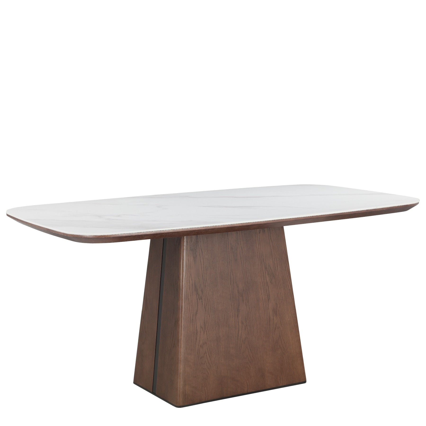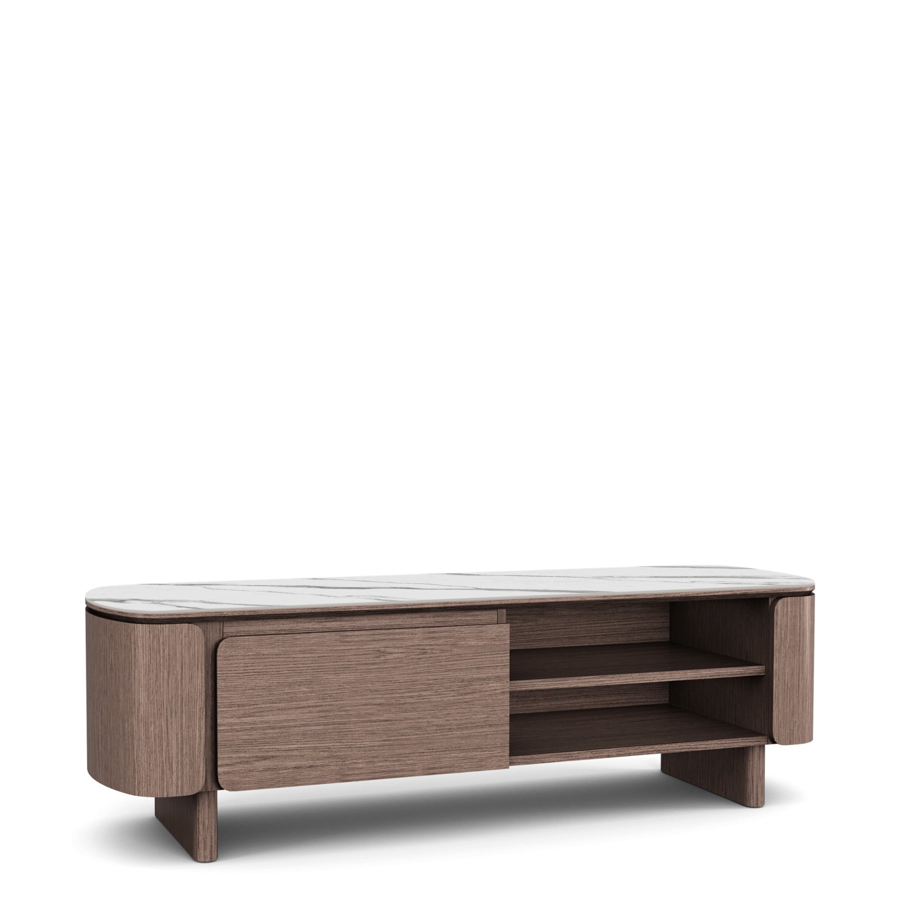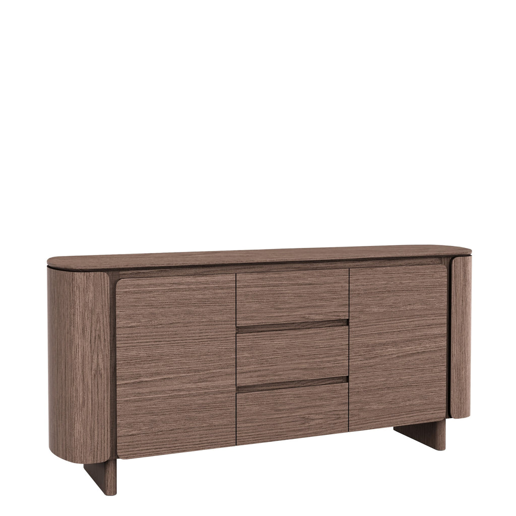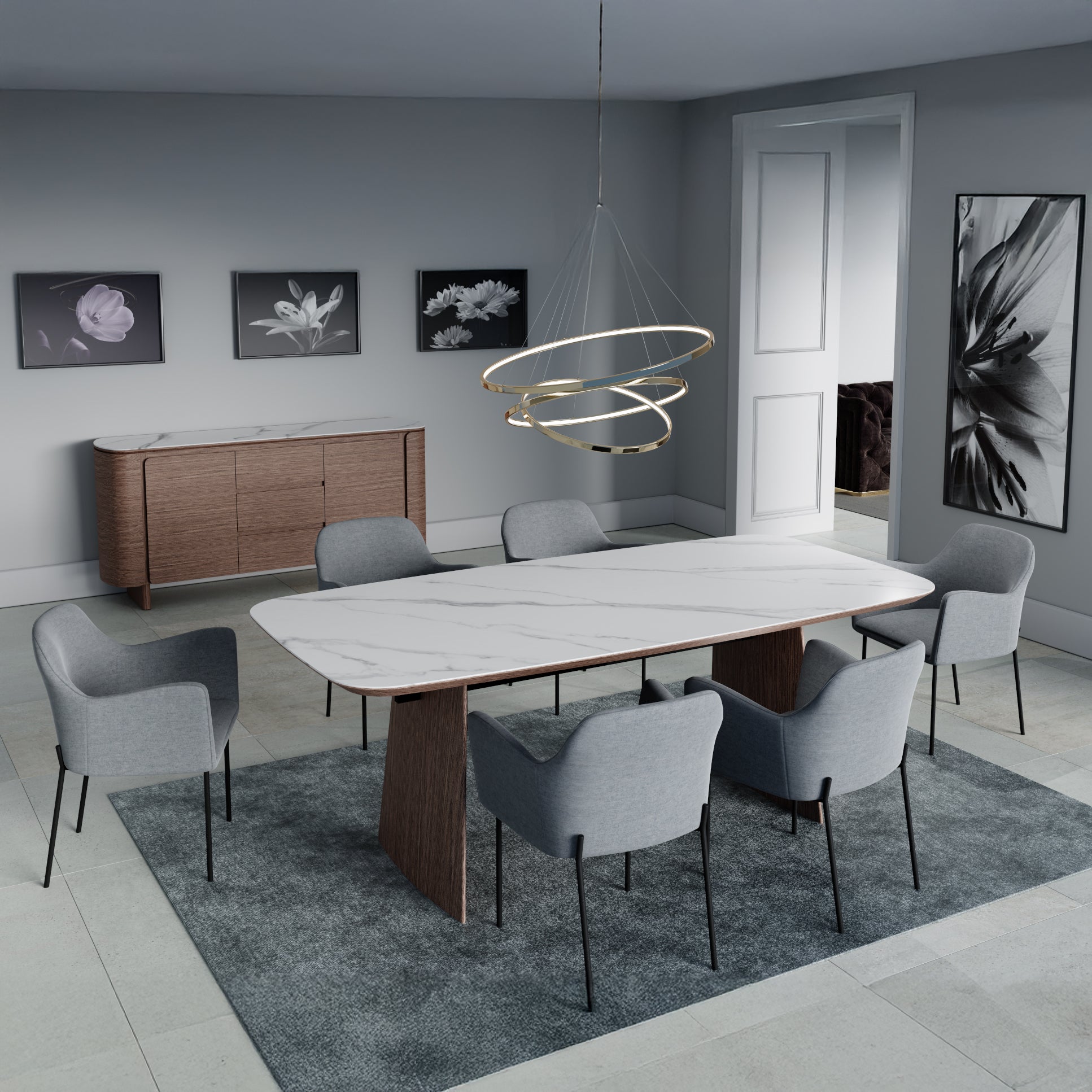 A contemporary styled dining and living room collection evoking timeless elegance, crafted in wood veneer with hardwearing white sintered stone tops on the sideboard and dining table option. A choice of two dining tables featuring black powder coated cross rails are complemented by the stylish dining armchair in grey featuring black powder coated metal legs for durability.
