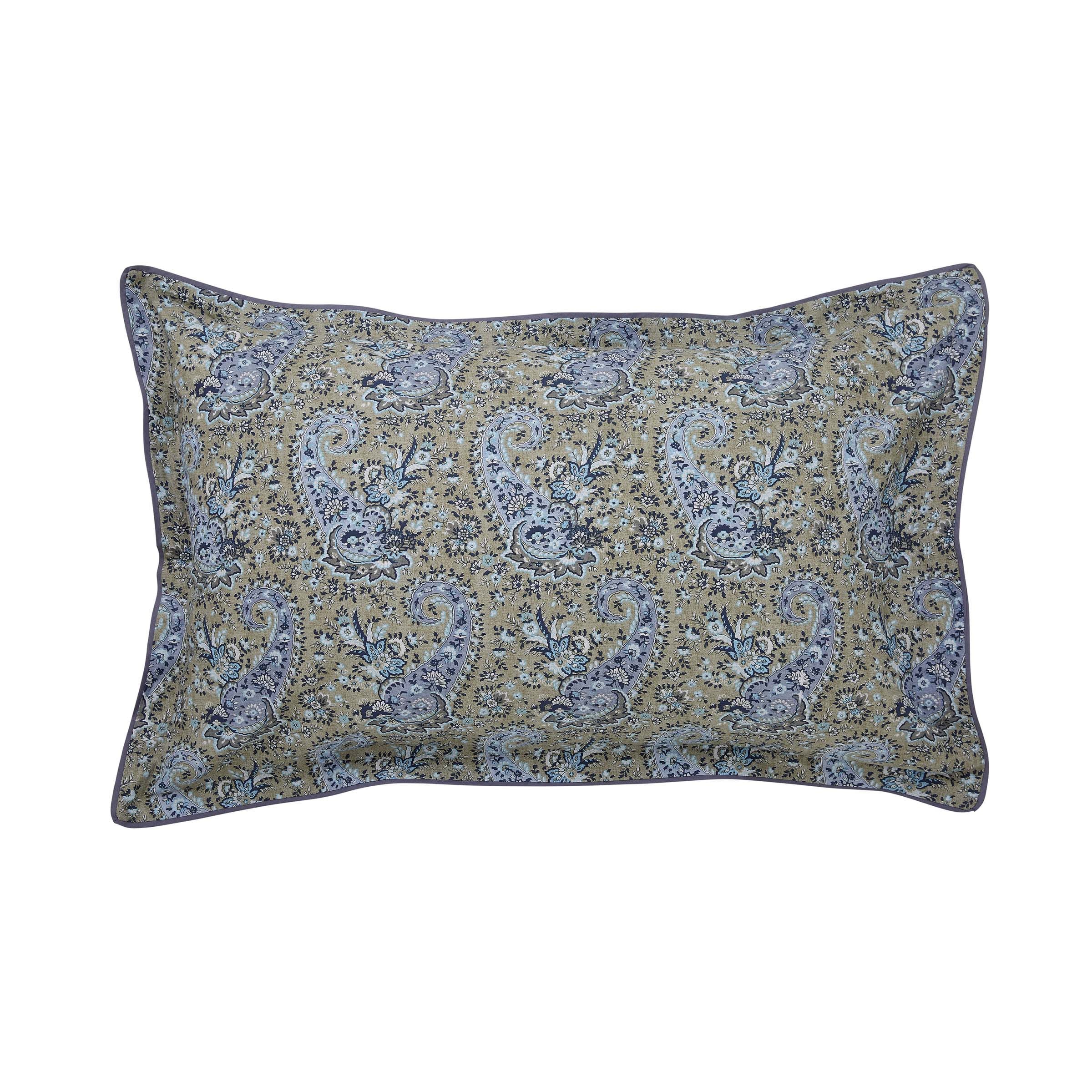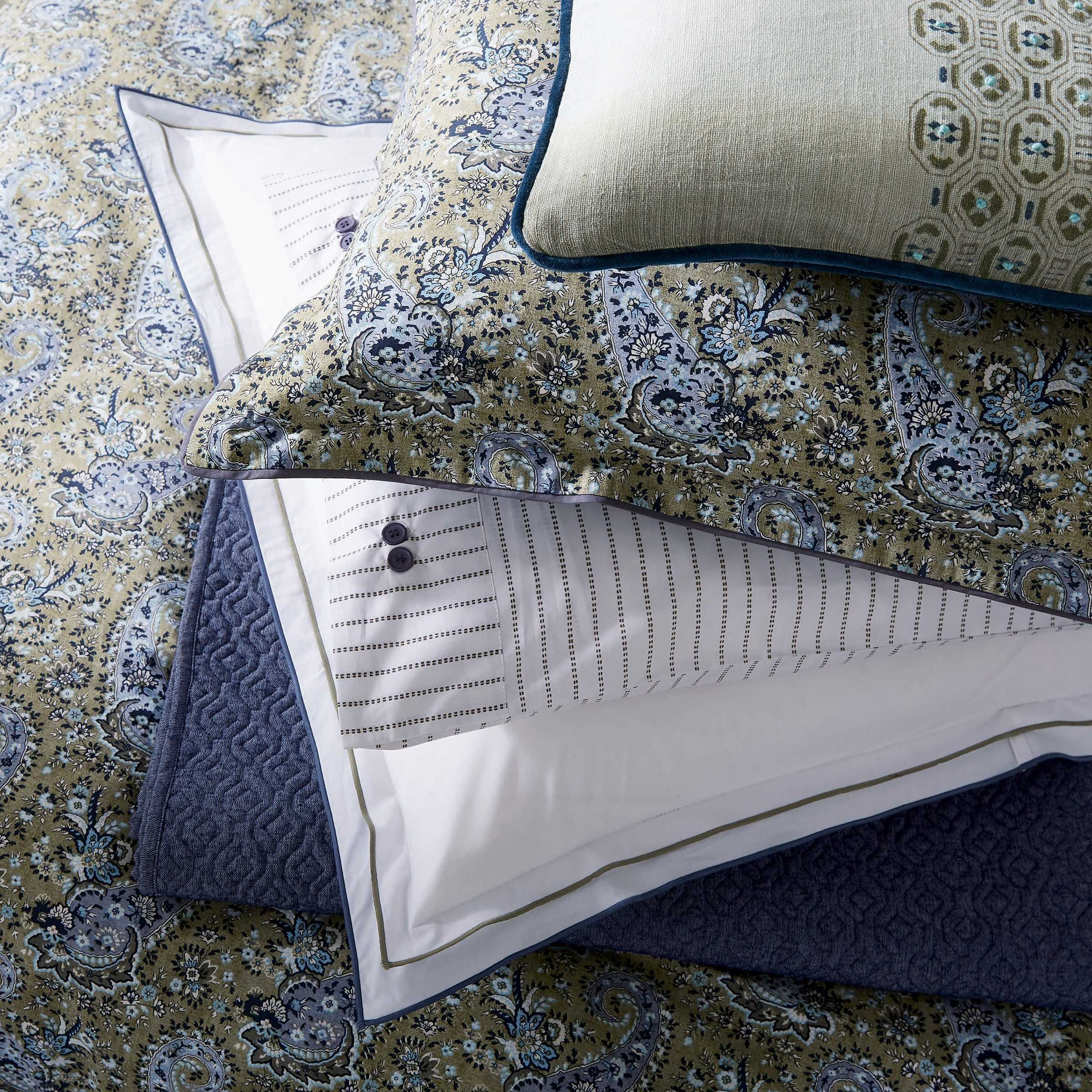 Elara presents a beautifully detailed paisley print design in shades of blue and green with a simple striped reverse. Elevated the look with the denim blue chambray quilted throw, white square pillowcase with embroidered edge framed with a blue and green line and the digitally printed ombre geometric design cushion with embroidered detail to complete the look.