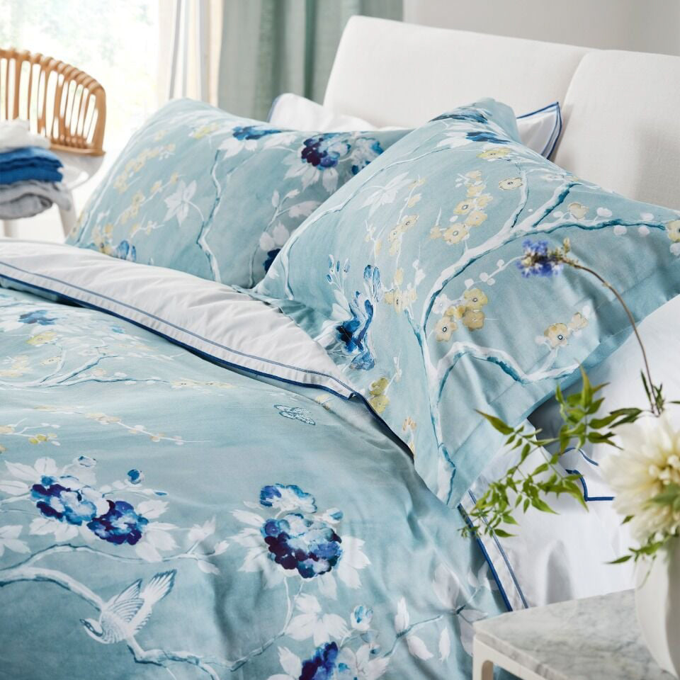 This chinoiserie-inspired bedlinen brings an elegant, dreamlike touch to the bedroom. Delicate watercolour renderings of trees and meadows evoke a romantic, serene atmosphere with a modern edge. Digitally printed onto sumptuous 250-thread-count cotton sateen, the design showcases a harmonious palette of divine Delft blues, uplifted by vibrant accents of lime green and deep indigo. The result is a sophisticated blend of timeless artistry and contemporary luxury. Sold as complete sets in fabric bag packaging – single with one oxford pillowcase, double, king and super king with two oxford pillowcases. Pillowcases also available to buy separately. Produced in Oeko-Tex ® Made in Green factories.