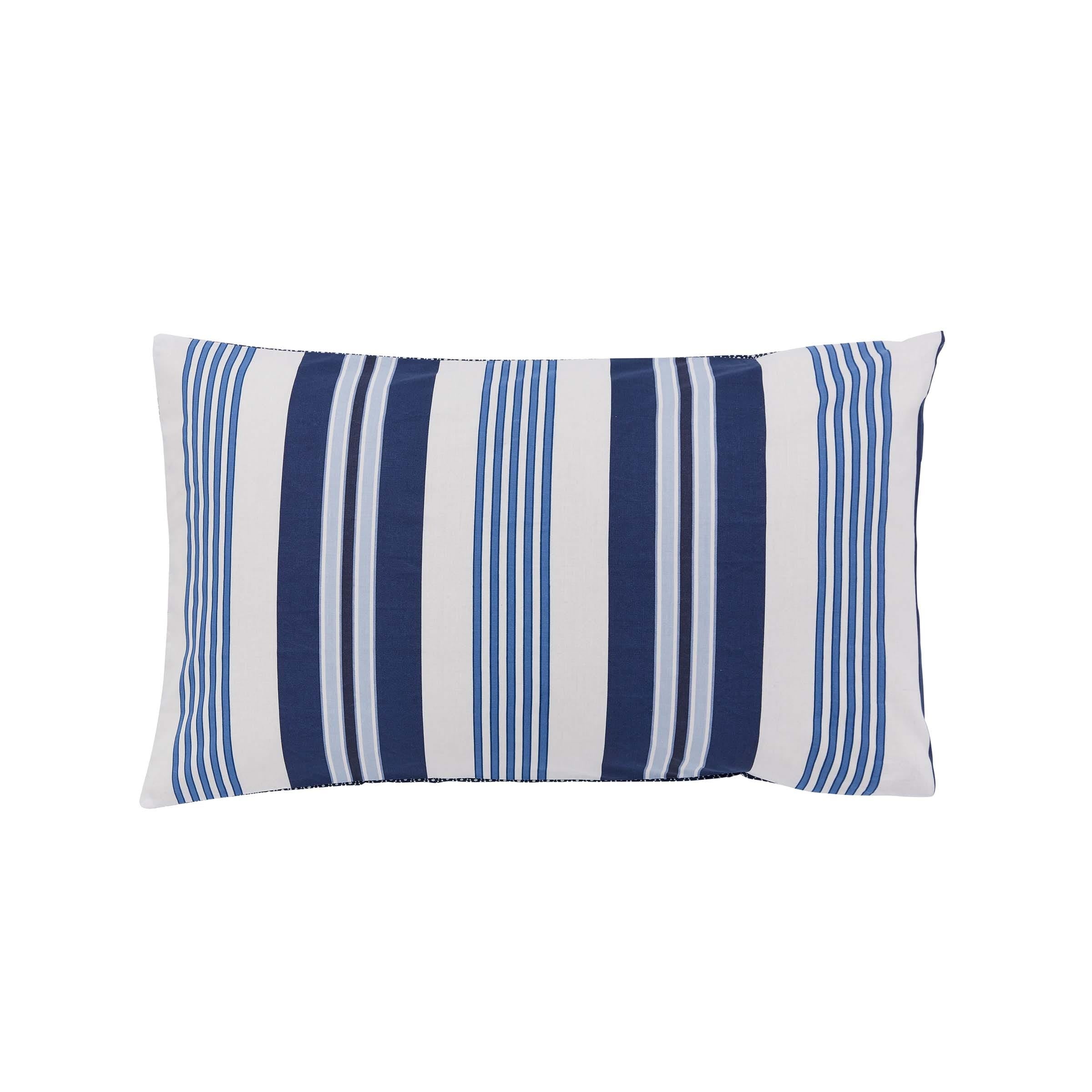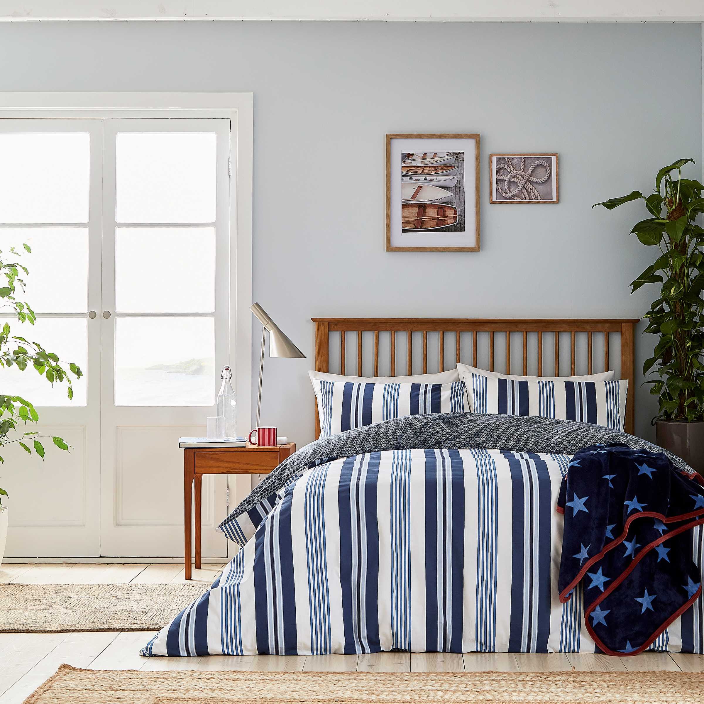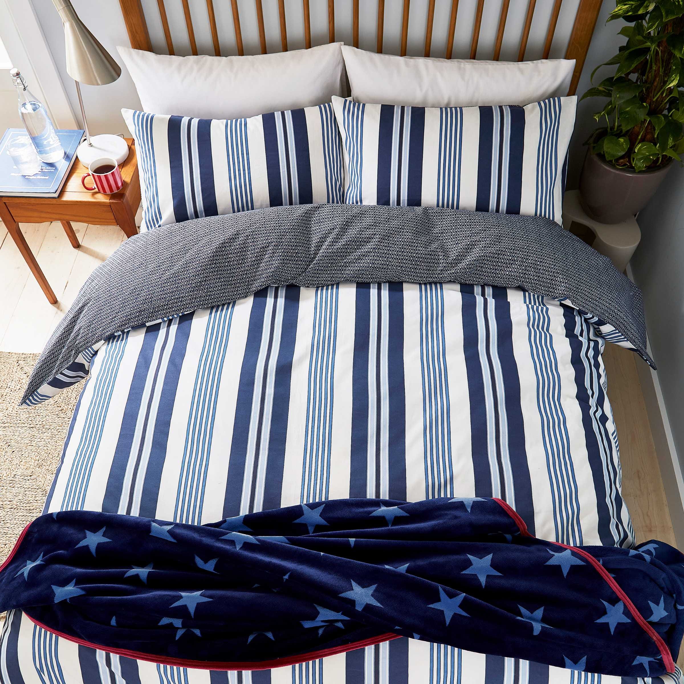 Bold deckchair stripes perfectly capture the Long Island look. Coloured in a palette of nautical blue tones contrasted against a white ground. The reverse is a simple geometric pattern in a smaller scale. Team with the blue star fleece throw edged with a pop of red piping.