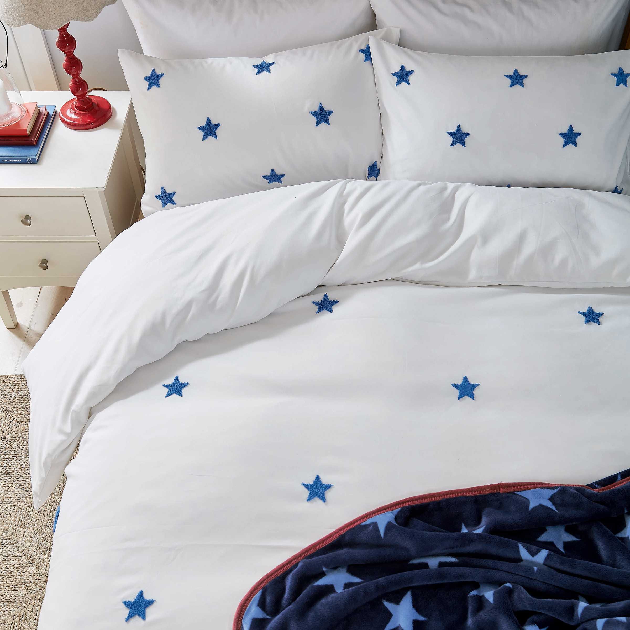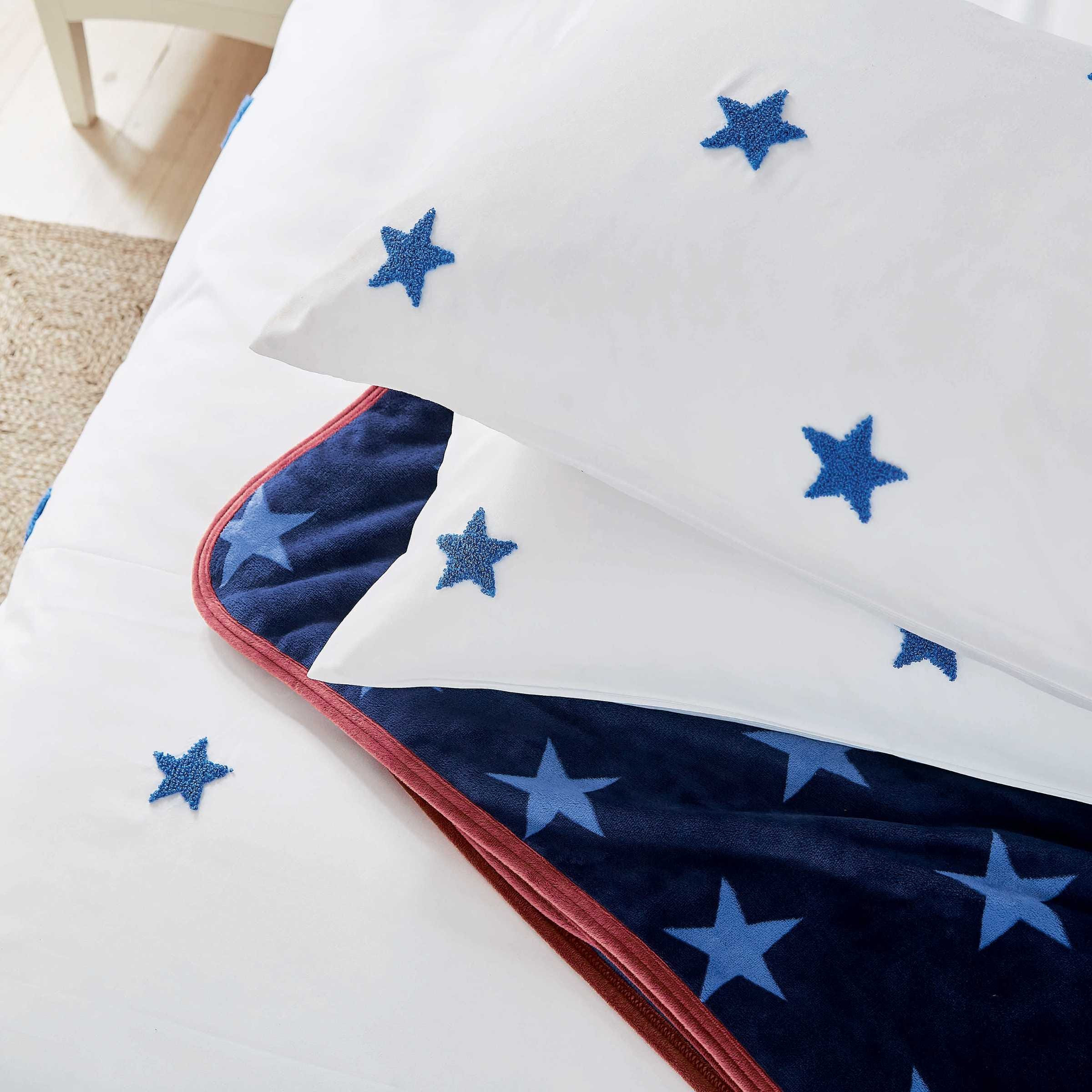 This bedding is adorned with a galaxy of tufted stars, flipping over to reveal a plain reverse. The celestial theme continues with the star fleece throw (140x180cms) in complementary tones. Available in four sizes of duvet cover set.