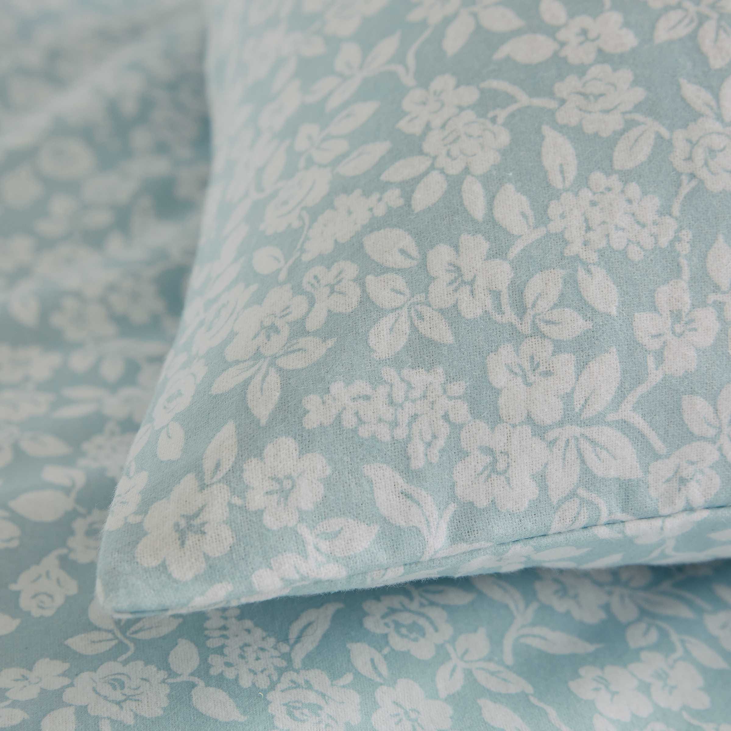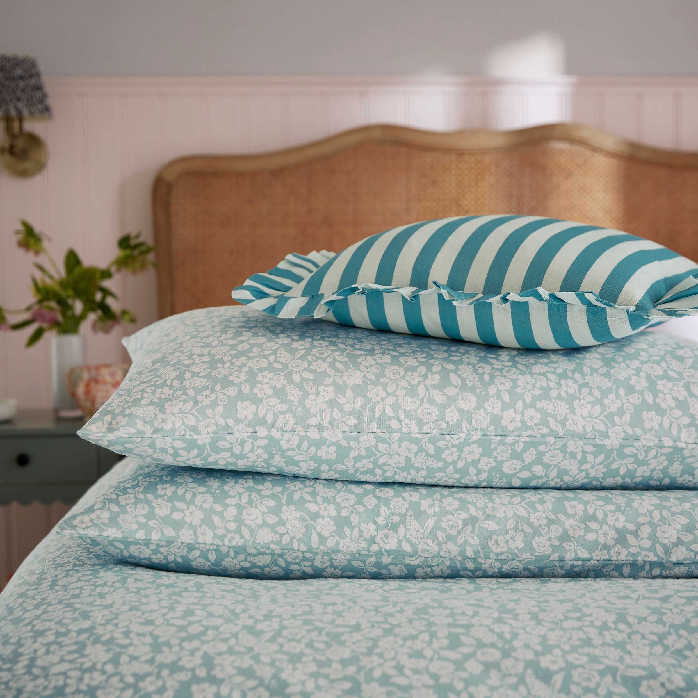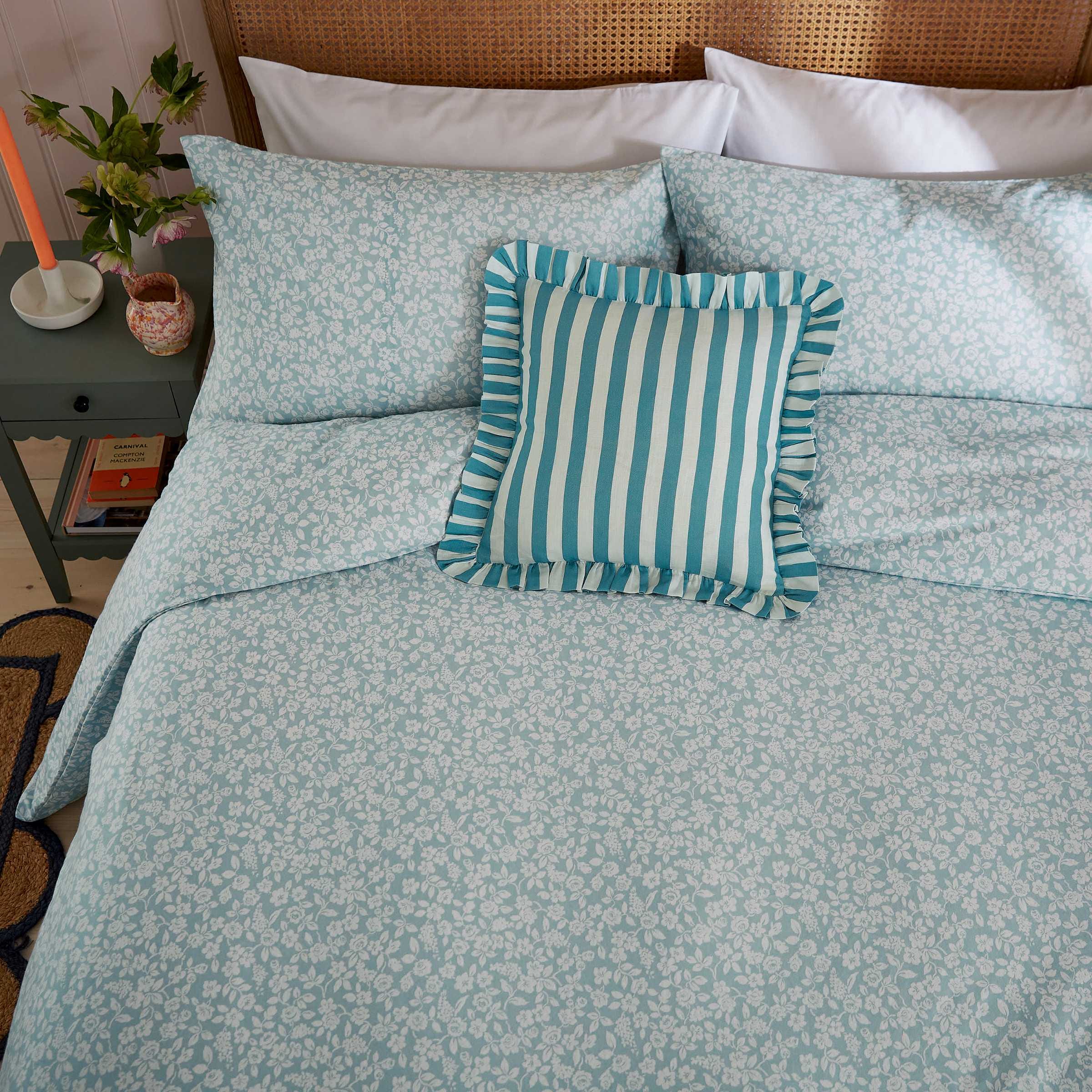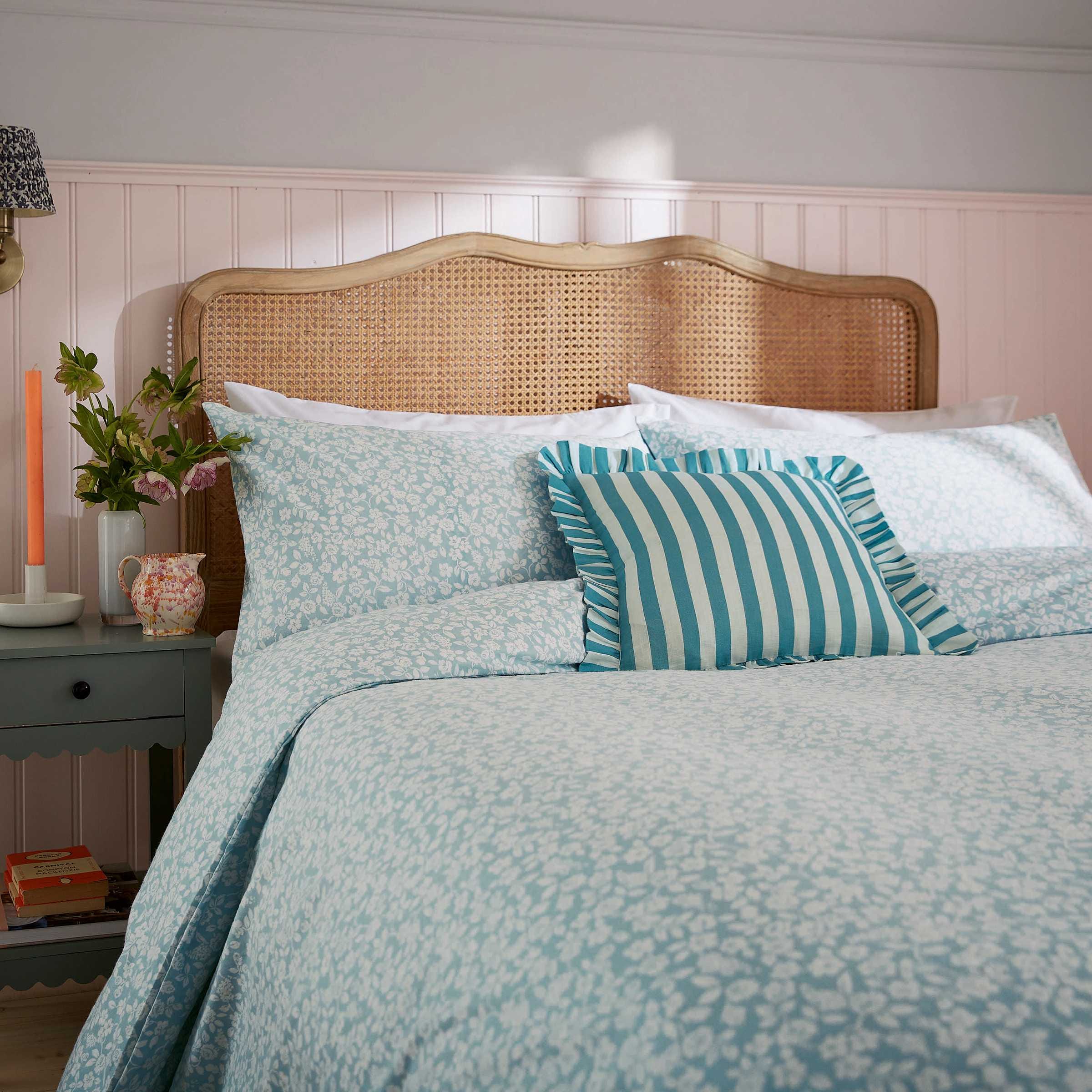 Soft, serene, and made for snuggling. Crafted from brushed cotton for a warm, fluffy feel, this charming bedding showcases a delicate floral print that adds a gentle, calming touch to your space. Fully reversible and effortlessly cosy, it pairs perfectly with the aqua Candy Stripe cushion for a layered, lived-in look.
