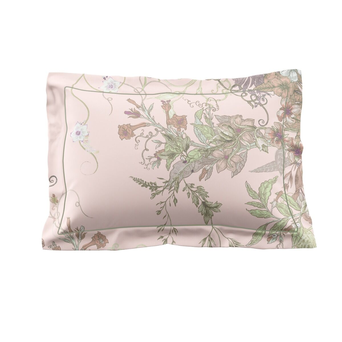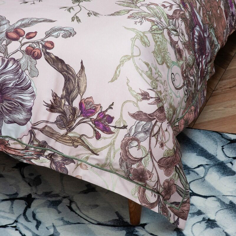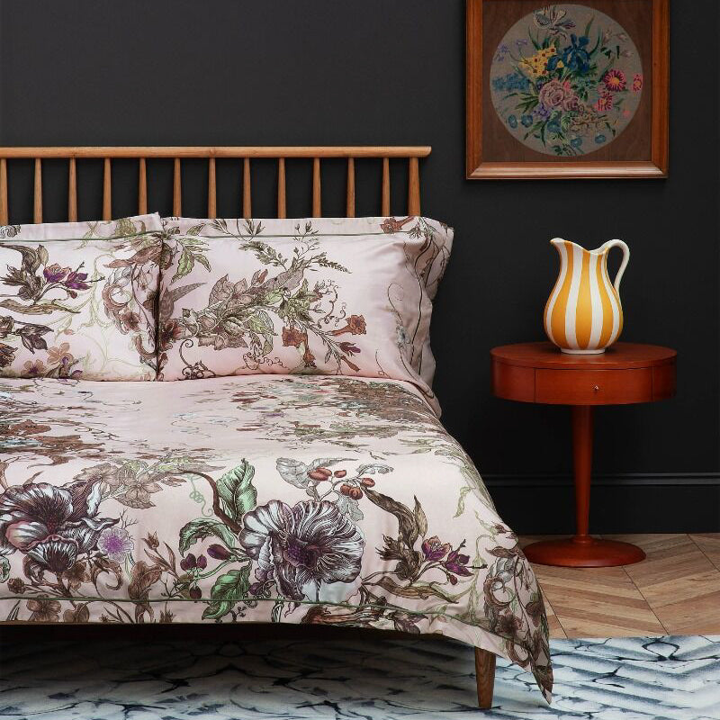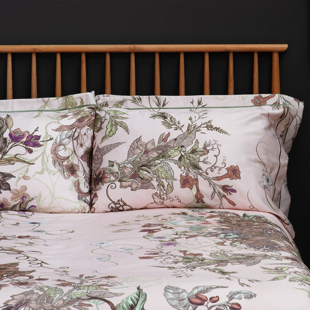 Timorous Beasties Opera Botanica bed linen features a whimsical design with trailing foliage, delicate branches, and soft floral elements, all set against a pale pink background. Printed onto luxurious 220 thread count cotton sateen, this bedding combines elegance with comfort, offering a smooth, lustrous finish that enhances the intricate design. Perfect for adding a touch of charm and tranquillity to your bedroom.