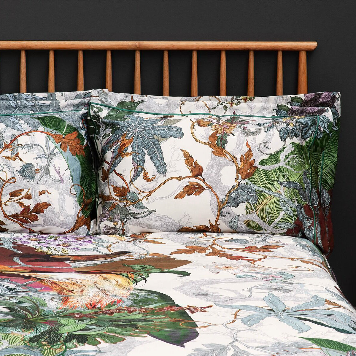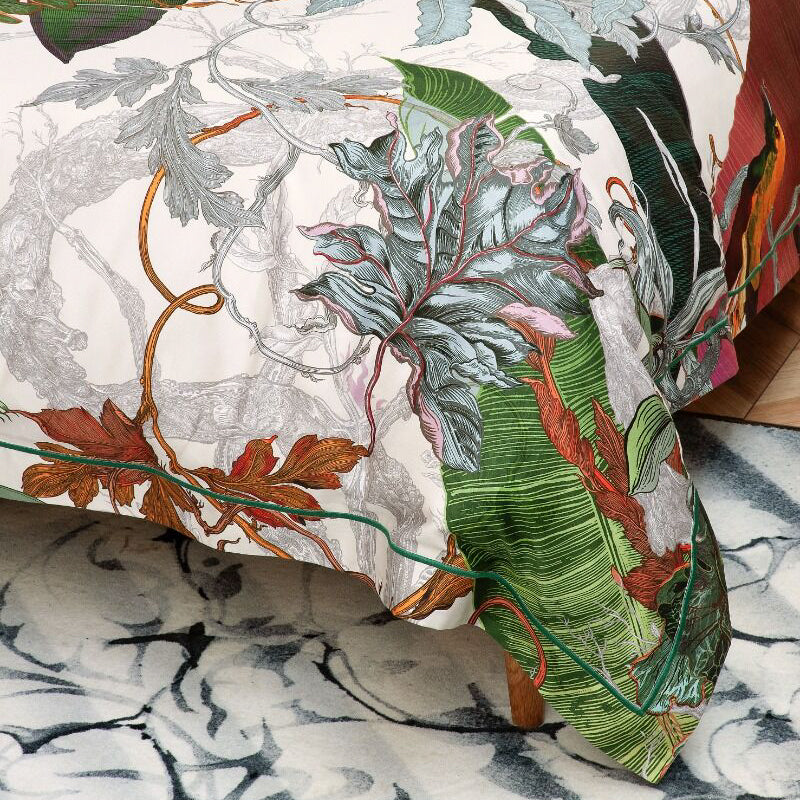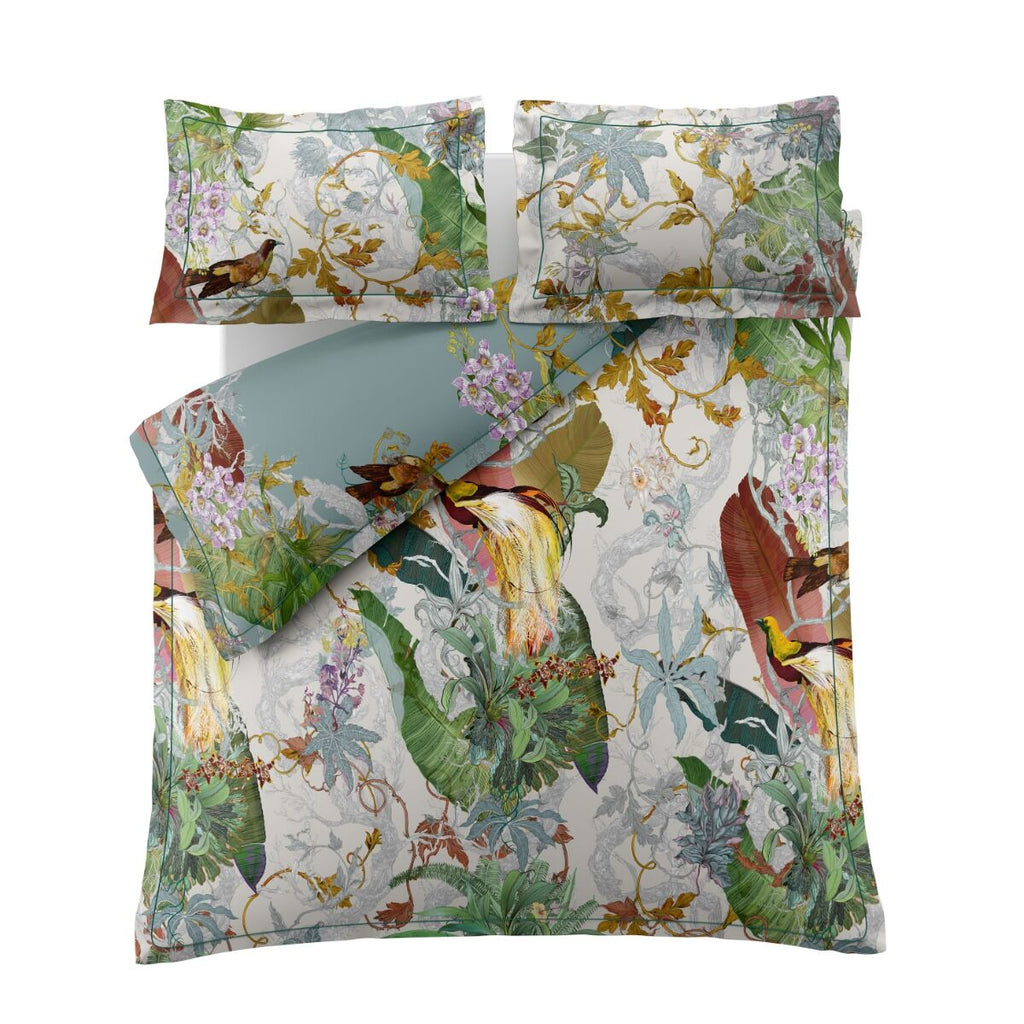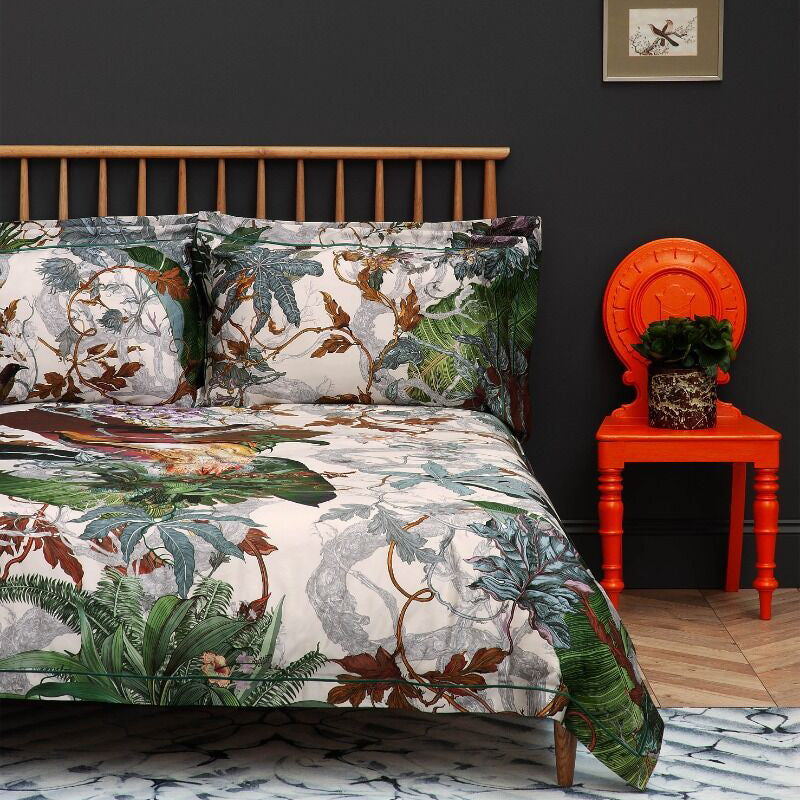 Timorous Beasties Papua Paradise bed linen features a bold, maximalist design with a striking Bird of Paradise as the centrepiece, inspired by the vibrant wildlife of Papua New Guinea. The design captures the exotic beauty of this iconic bird, surrounded by lush tropical elements. Printed onto luxurious 220 thread count cotton sateen, the bedlinen offers a smooth, silky feel while showcasing the vivid colours and intricate details of the design.