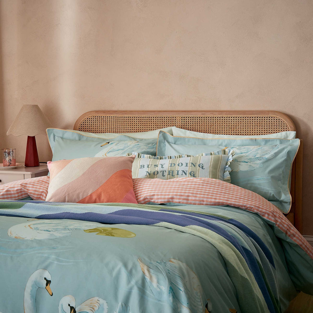 Founder, creator and illustrator Yvonne Ellen is an award-winning British designer with a strong passion for the unique and quirky. Perfect for nature lovers, this stunning bedding is adorned with elegant swans gliding gracefully through lily pads, captured in shades of peach, aqua and pistachio. A coral-coloured gingham reverse provides a quirky contrast and Yvonne’s playful accessories provide an injection of delicious colour and pattern.