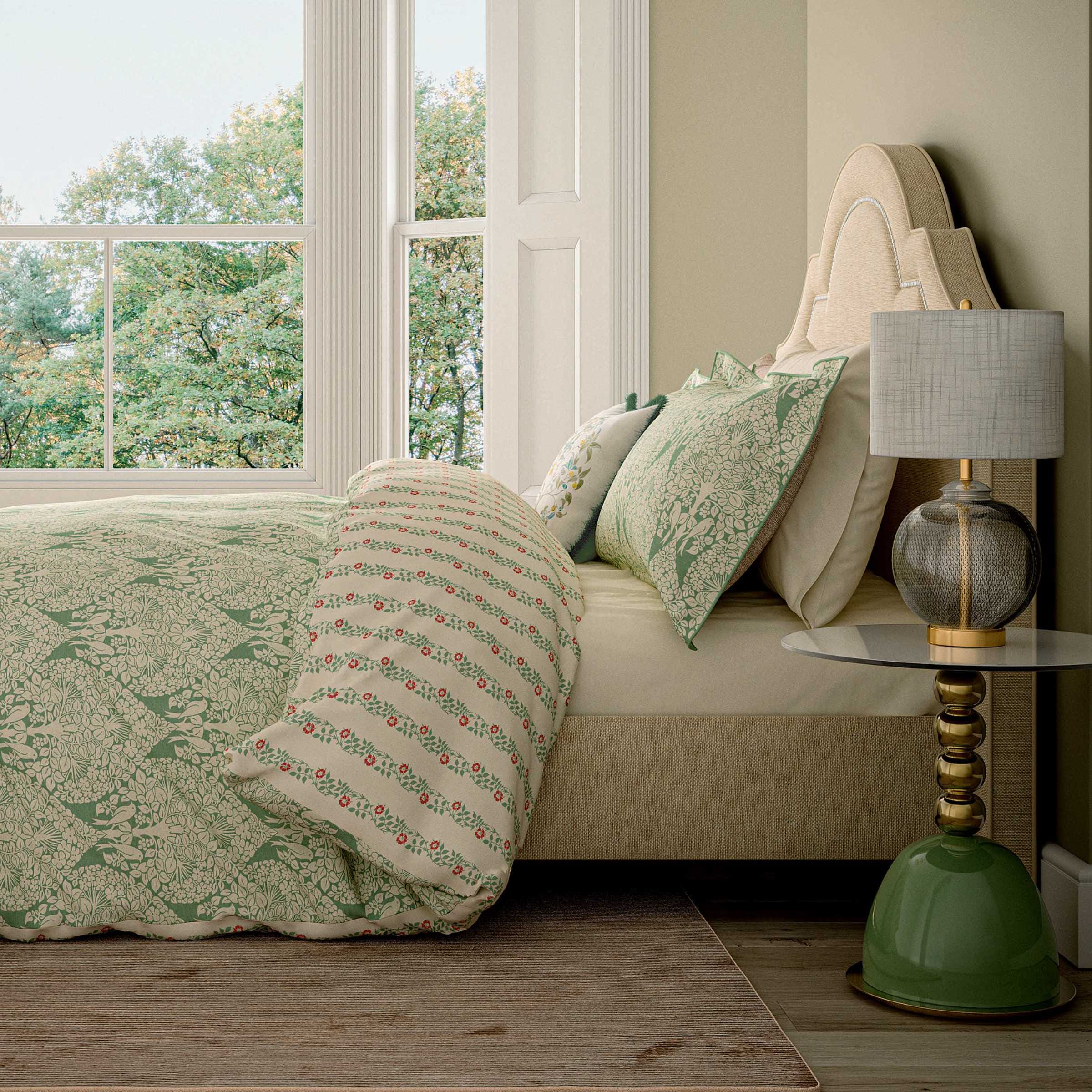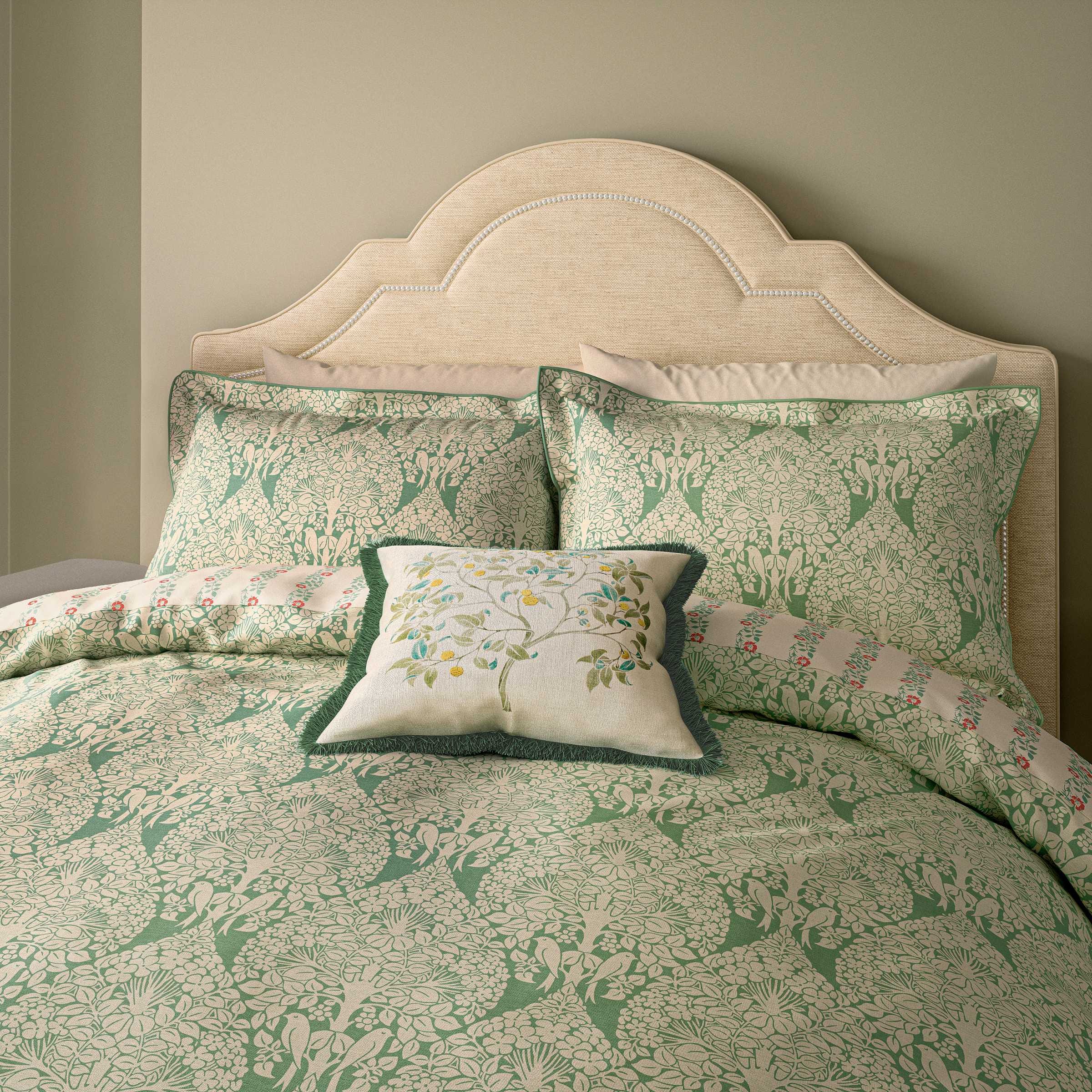 Featuring birds perched among tree branches, this design is a classic example of C.F.A. Voysey’s work from the late 19th century. Originally designed as a wallpaper called, 'The Lerena', held in the V&A, the pattern features his trademark fusion of stylised nature and flowing forms.