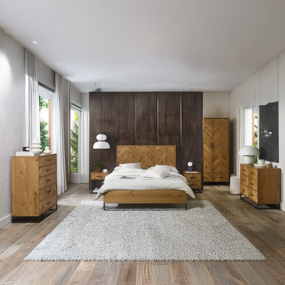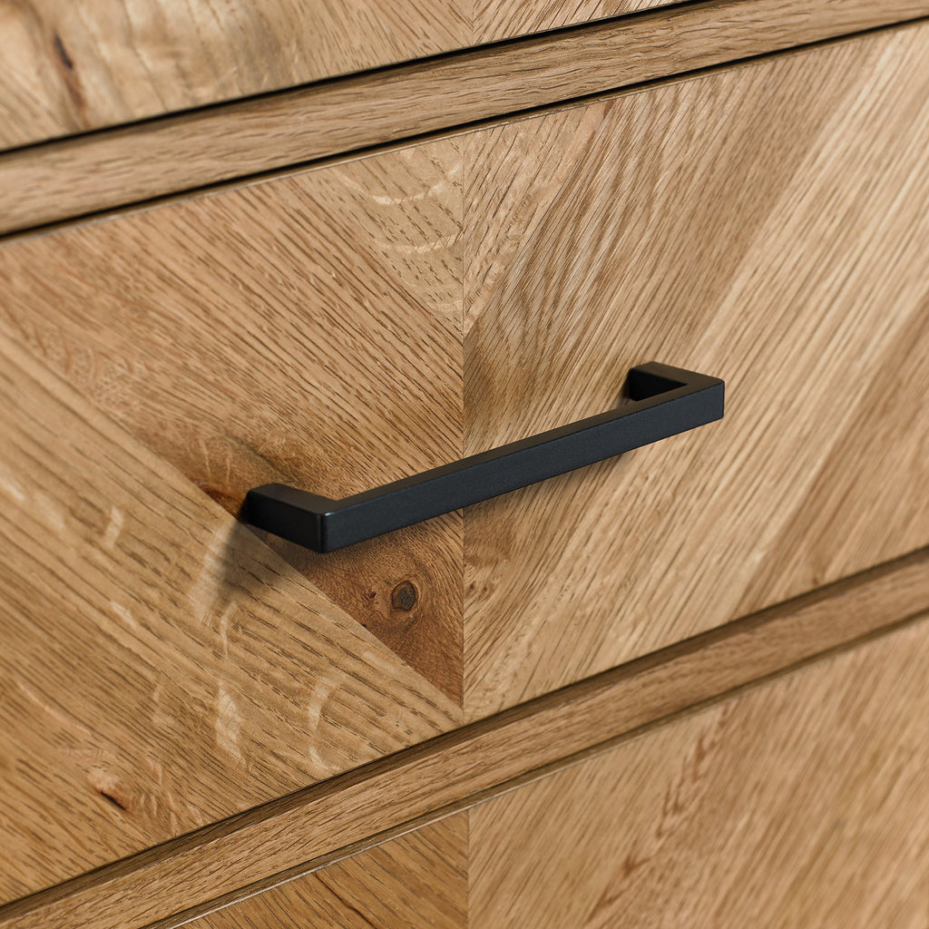 With dynamic zigzagging veneer patter, Chevron Rustic Oak is sure to make a stylish statement in any contemporary bedroom. Consisting of rustic oak veneers that are hand laid in a chevron pattern and oiled to highlight the rich character of oak, this range adds warmth and texture in abundance. Contrasting peppercorn inlay detail within the recesses of the drawers, doors and headboards combine with the peppercorn powder coated metal frames to give the range a slightly industrial edge. Quality mechanisms such as fully extending side mounted soft-close drawer runners add functional finishing touches to Chevron's on-trend, mixed-media aesthetic, resulting in a collection that is both practical and stylish.