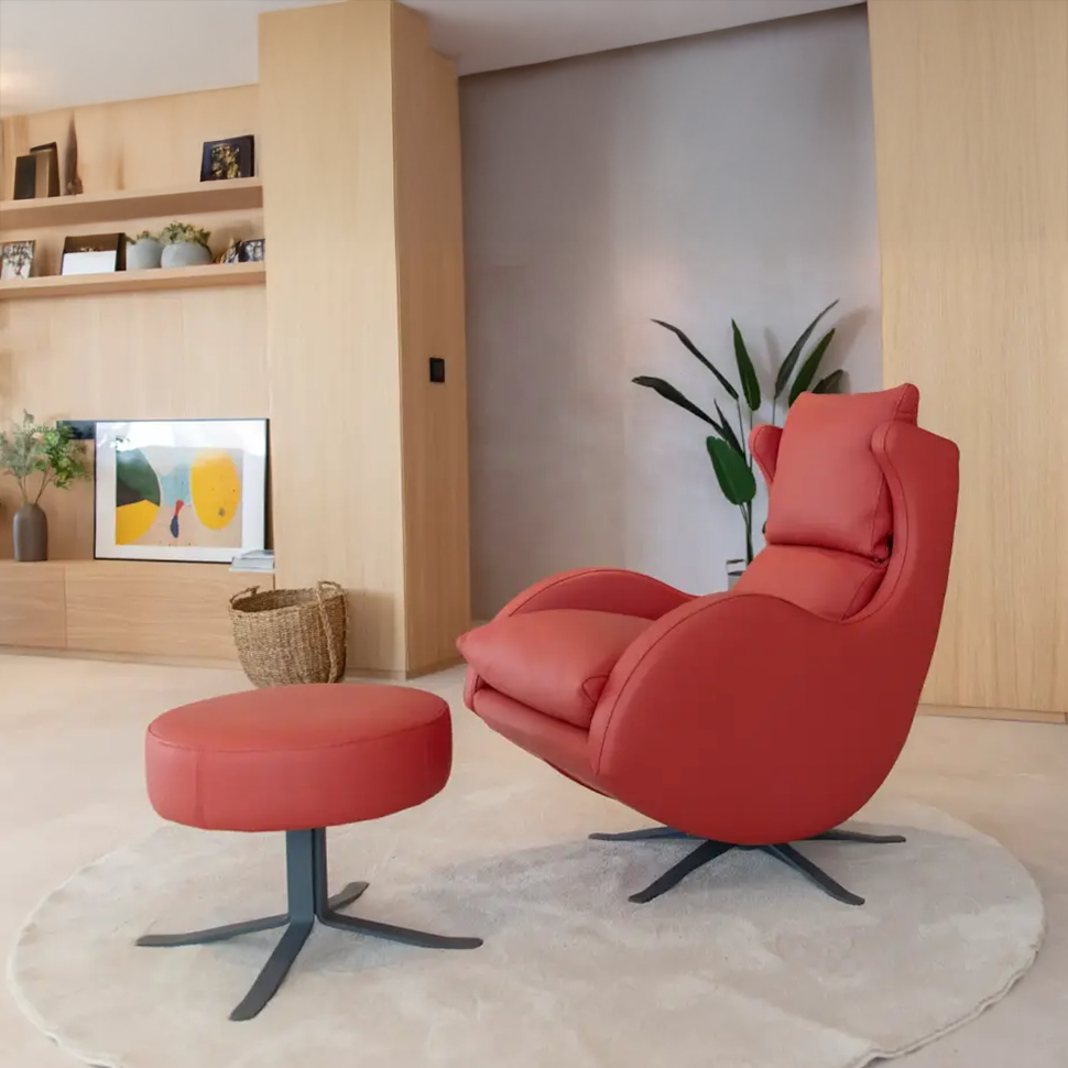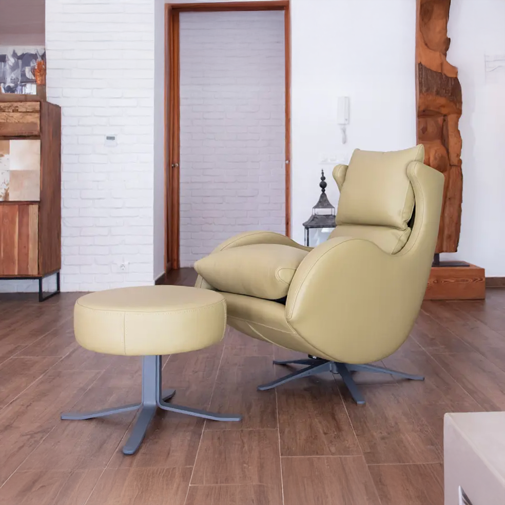 Lenny is perhaps Fama's most iconic design, a clever combination of concave and convex curves that create a unique and unrepeatable armchair. Its fibre seat and back cushions offer an incredible comfort. The base is a swivel and rocking mechanism. The round footstool is the perfect accessory to make Lenny an amazingly comfortable piece.
