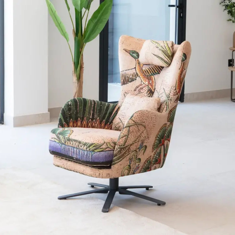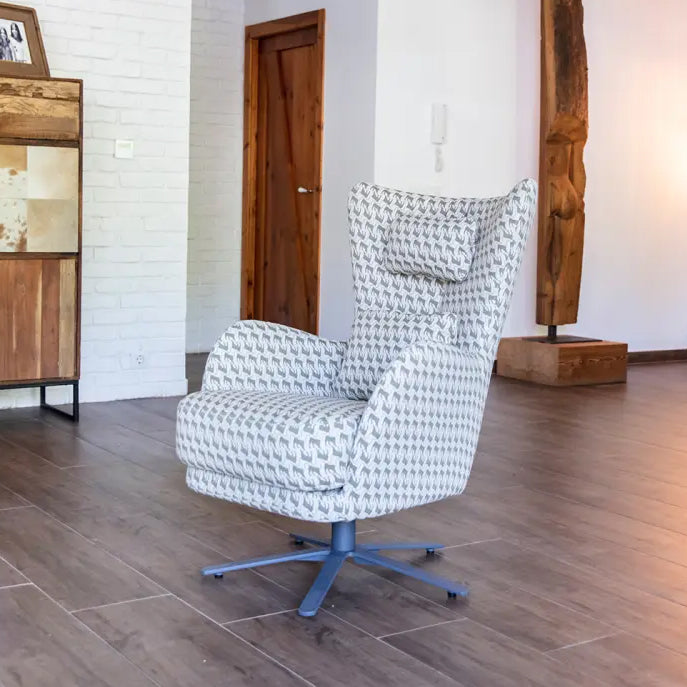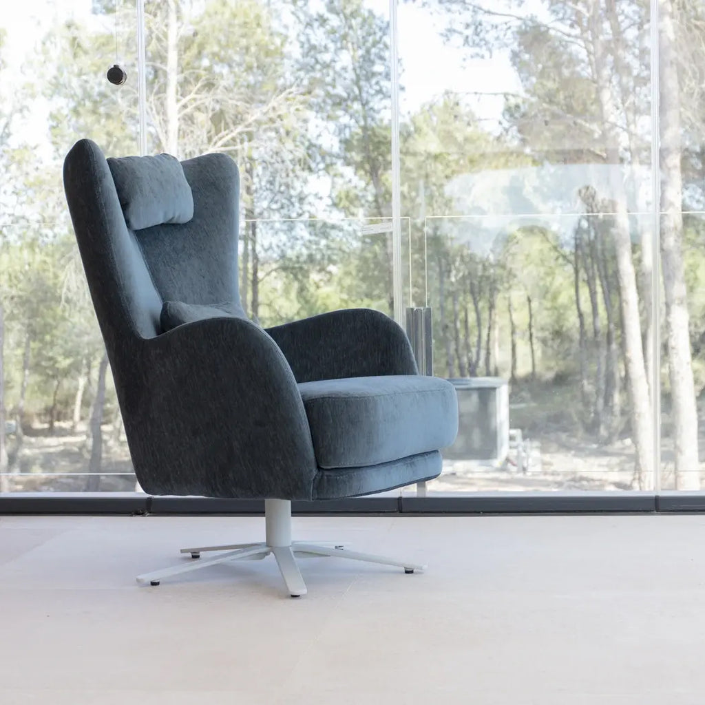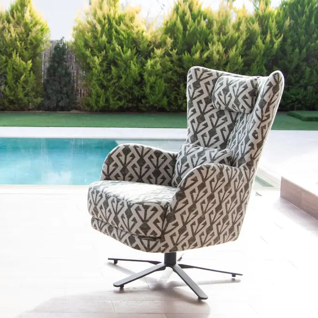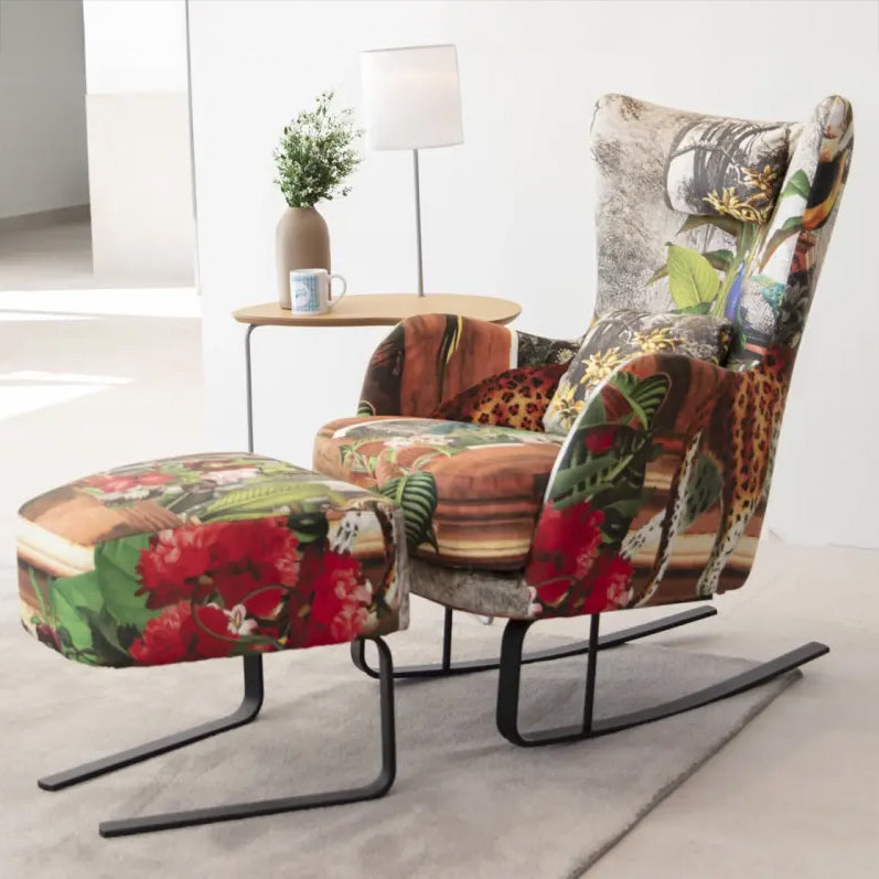 Available in a variety of upholstery options—from understated solid tones to bold, artistic prints—this armchair adapts effortlessly to both minimalist and eclectic interiors. The Kylian is offered in three functional styles: a swivel base for dynamic lounging and a rocking base paired with a matching footrest, ideal for soothing motion and added comfort, and a fixed chair option.