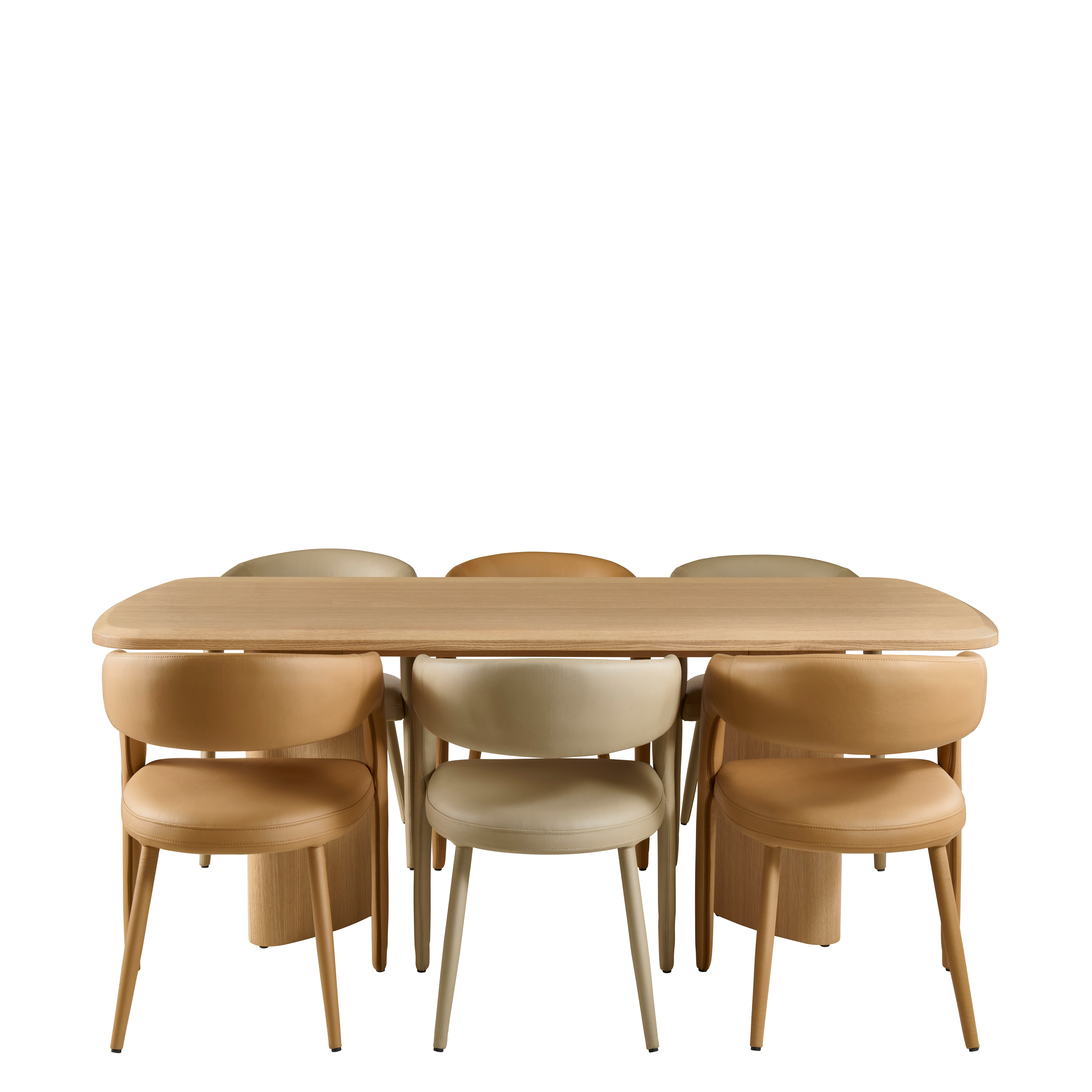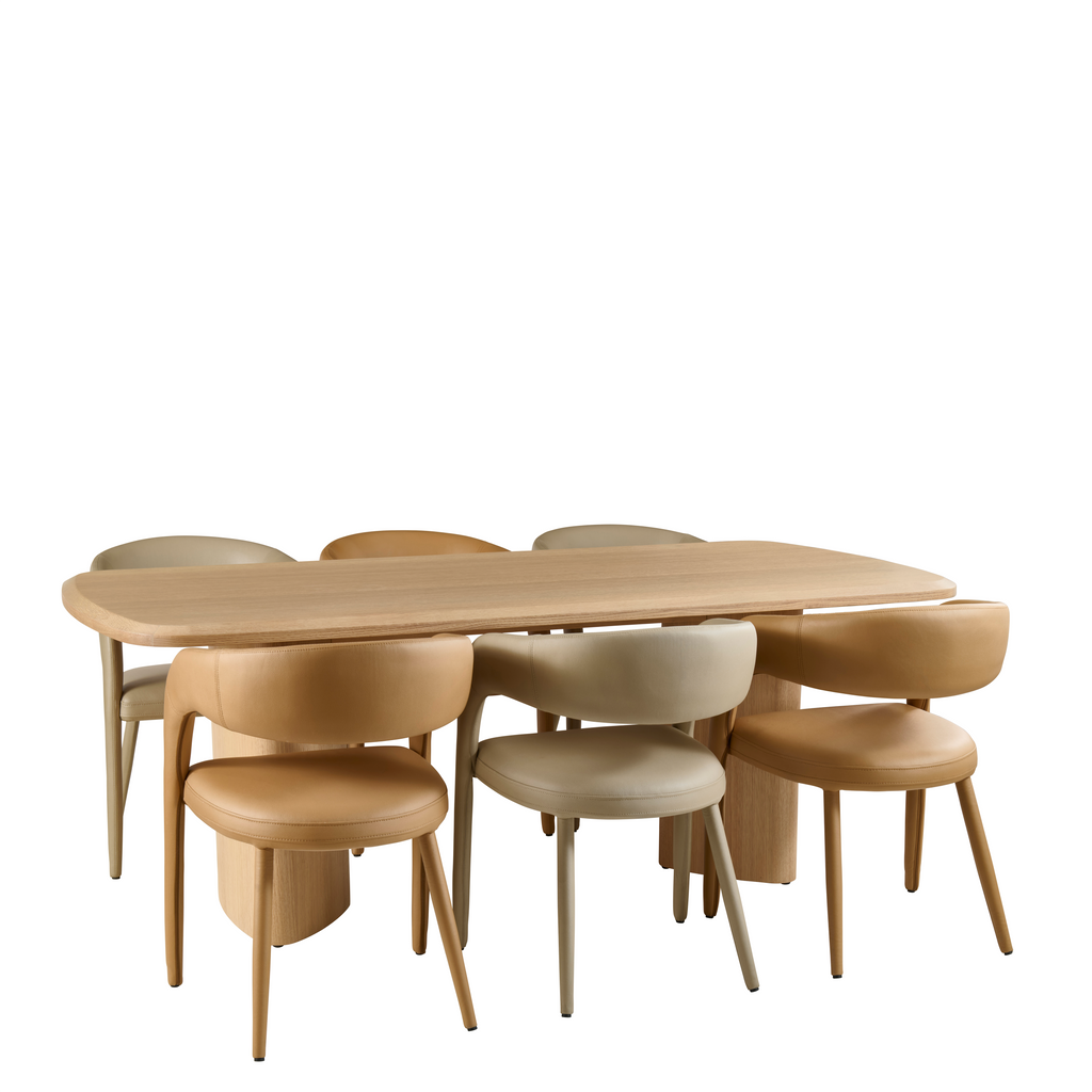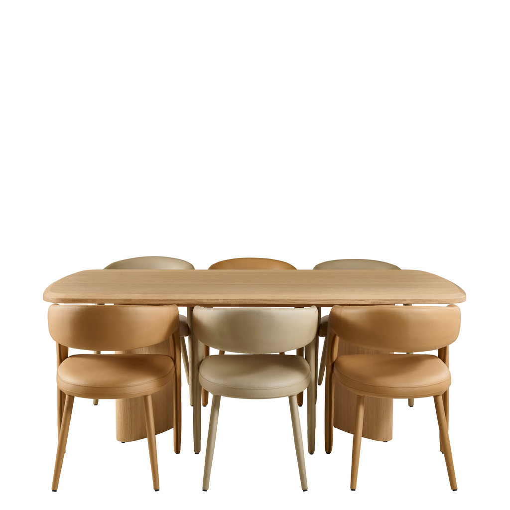 From the generous dining table supported by curved pillar legs to the streamlined sideboard with hidden storage and thoughtfully crafted drawers, the range balances form and function in every detail. Coordinating dining chairs, available in soft neutral upholstery, offer exceptional comfort with wraparound backs and subtly cushioned seats.