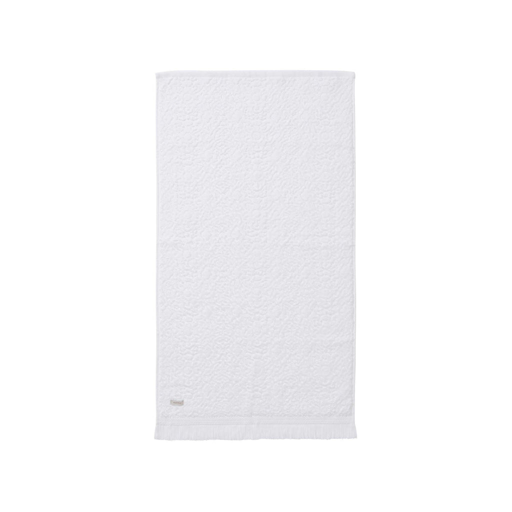 Lotta presents a white all-over sculpted design towel with a soft geometric floral pattern with fringed detailing. 100% BCI Cotton Terry.