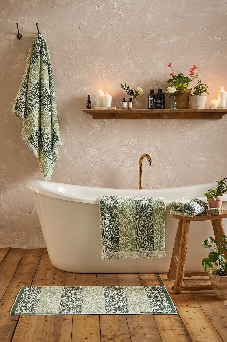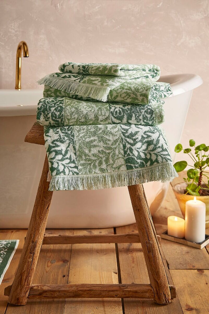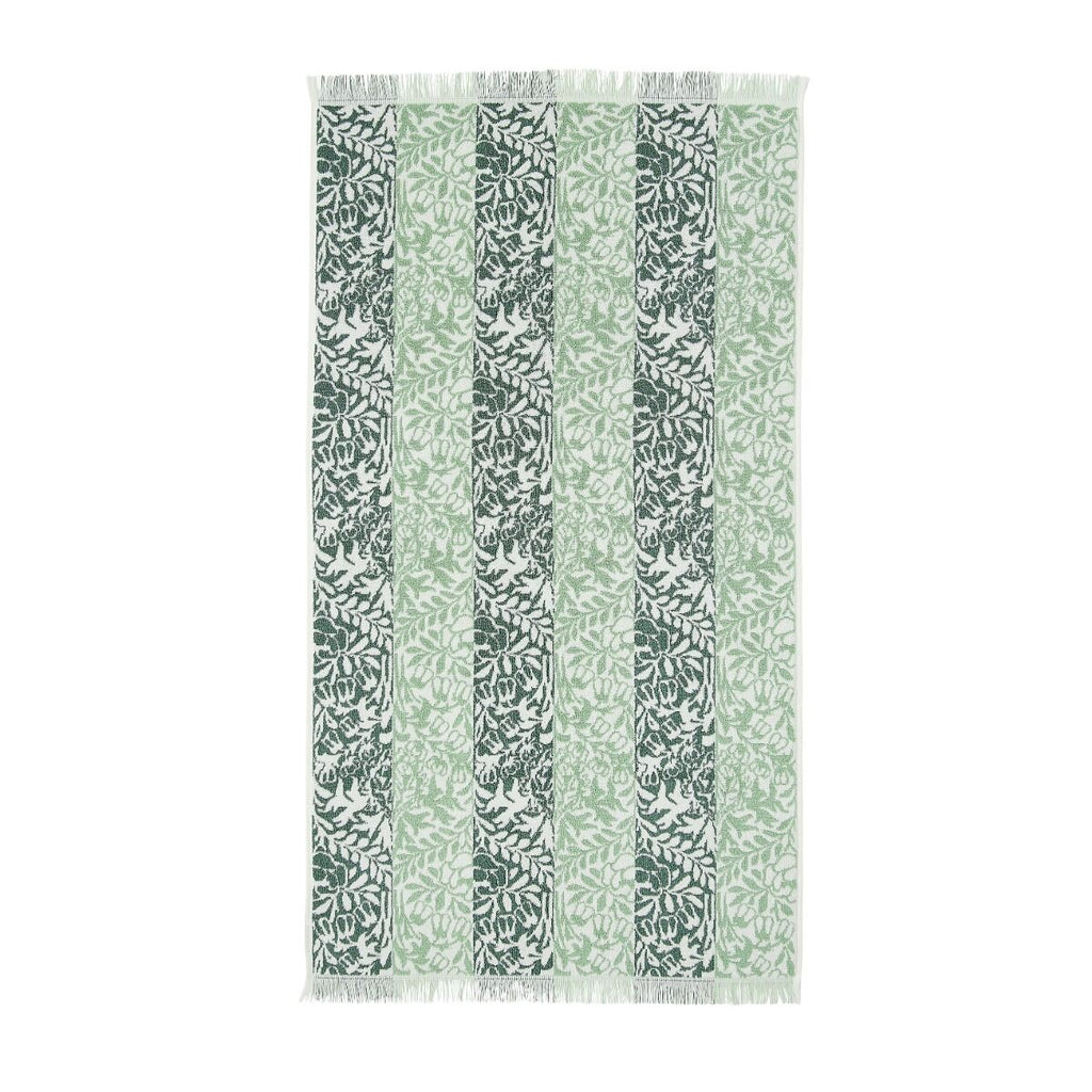 An original drawing created by William Morris for Wilton Carpets and registered in 1876 has been translated into these beautiful 100% cotton towels. The original artwork features a symmetrical application of a rose surrounded by foxgloves. This design, held in the William Morris Gallery archive, was faithfully interpreted into a repeating stripe pattern by the William Morris At Home design team, capturing the authentic essence of the artwork in a unique form, woven in soft sage green yarns and finished with a decorative fringed edging, these towels are perfect for bringing the beauty of nature into your bathroom.