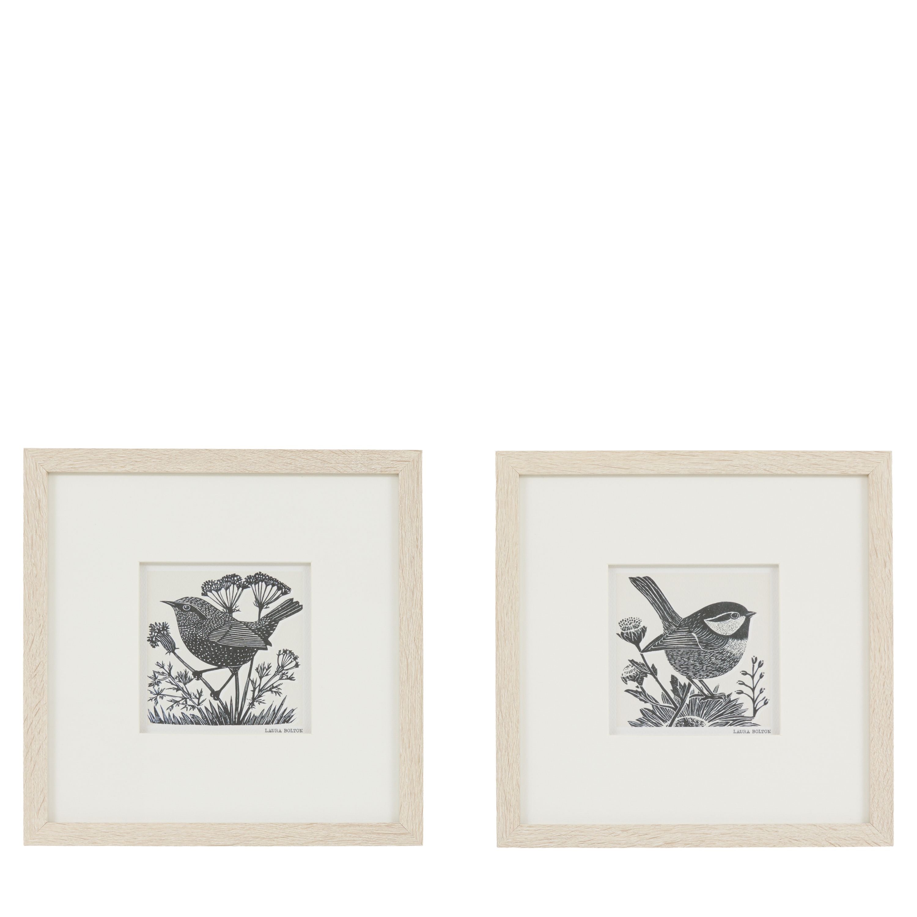 A delightful duo of small bird illustrations, each surrounded by blooming wildflowers. The crisp black and white design and fine detailing give these prints a charming, handcrafted feel. Presented in a frame with a pale oak finish, they bring warmth and whimsy to any space, perfect for adding a touch of charm to cosy interiors.