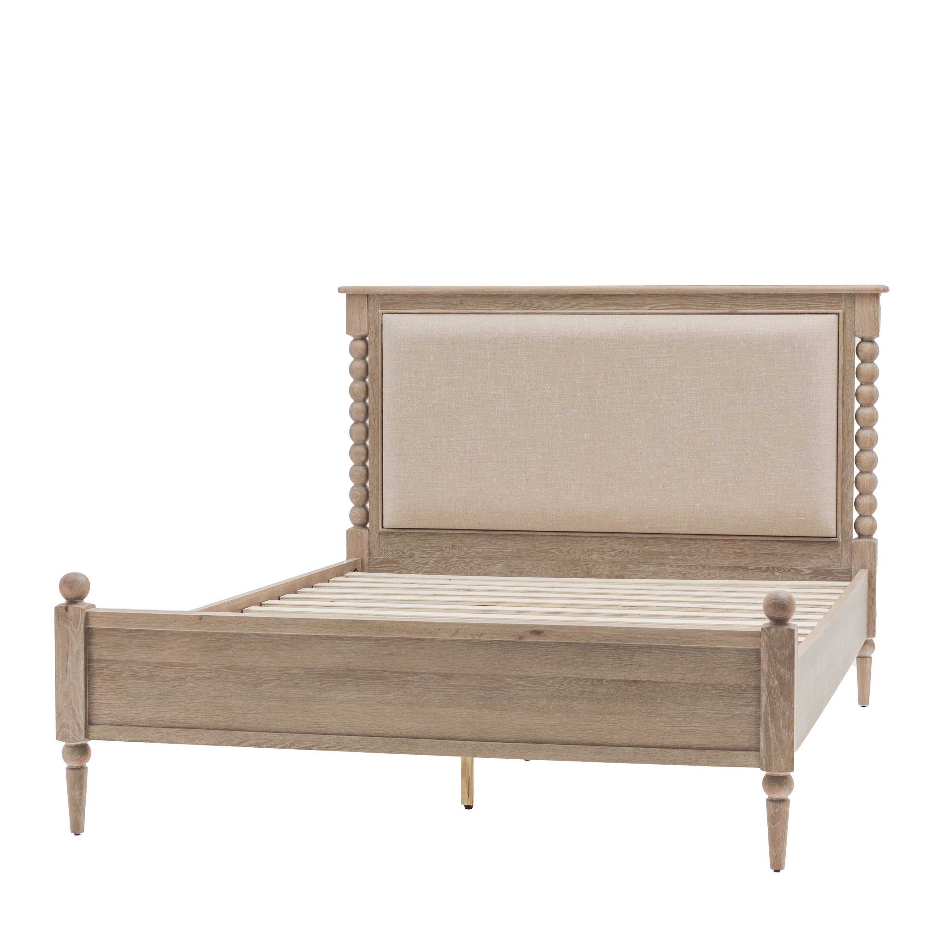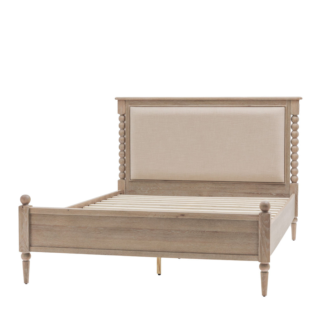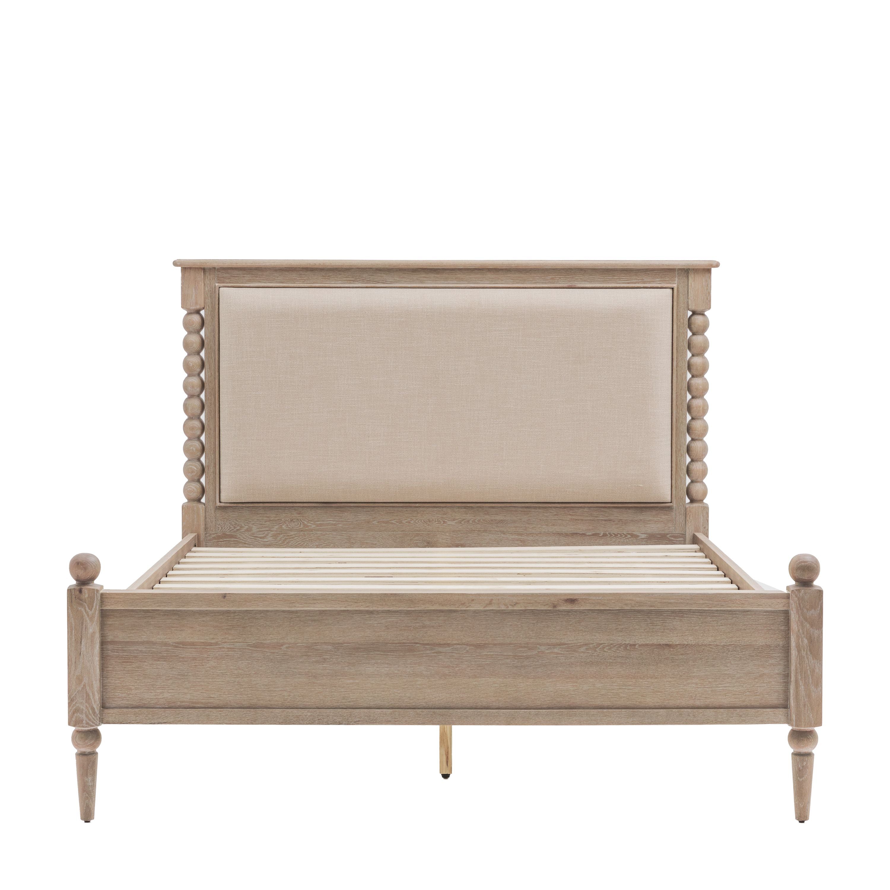 This bed combines timeless design with superior craftsmanship. Highlighted by hand-turned bobbin details, it is constructed from oak with a soft lime-wash finish, creating a warm and inviting aesthetic. This bed offers a practical yet stylish foundation for a wide range of interior styles.