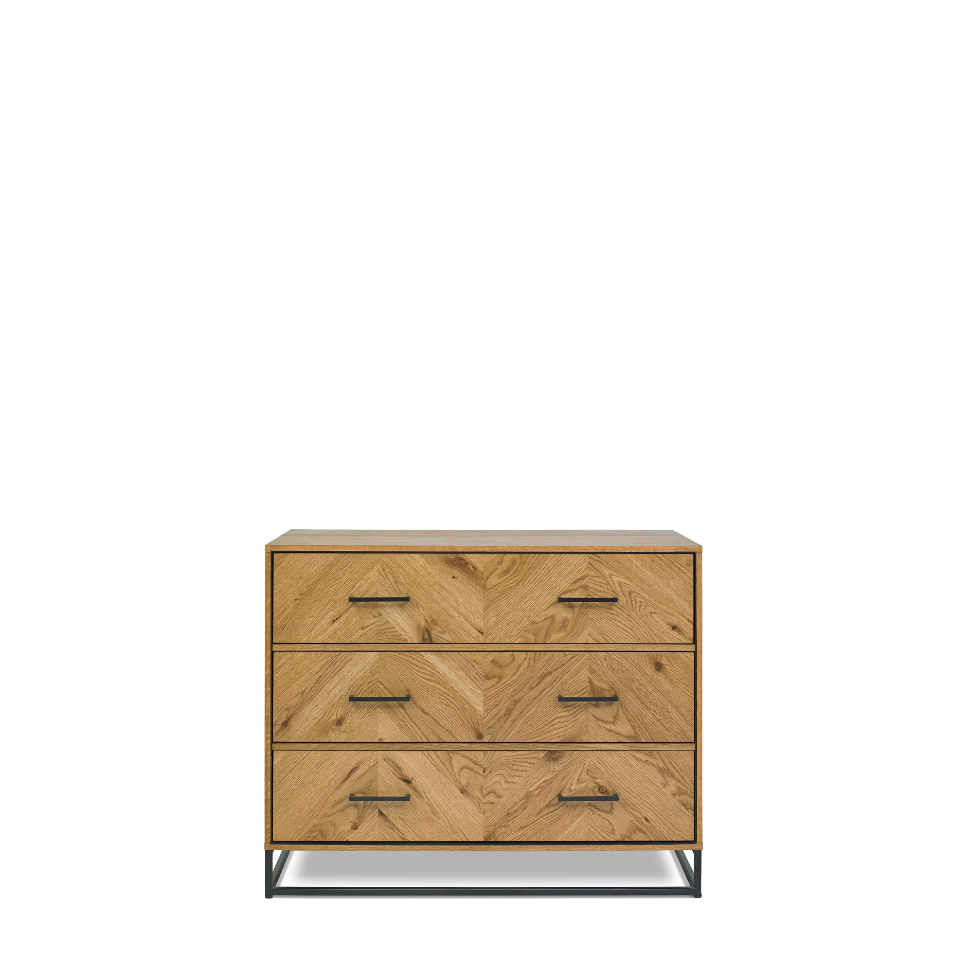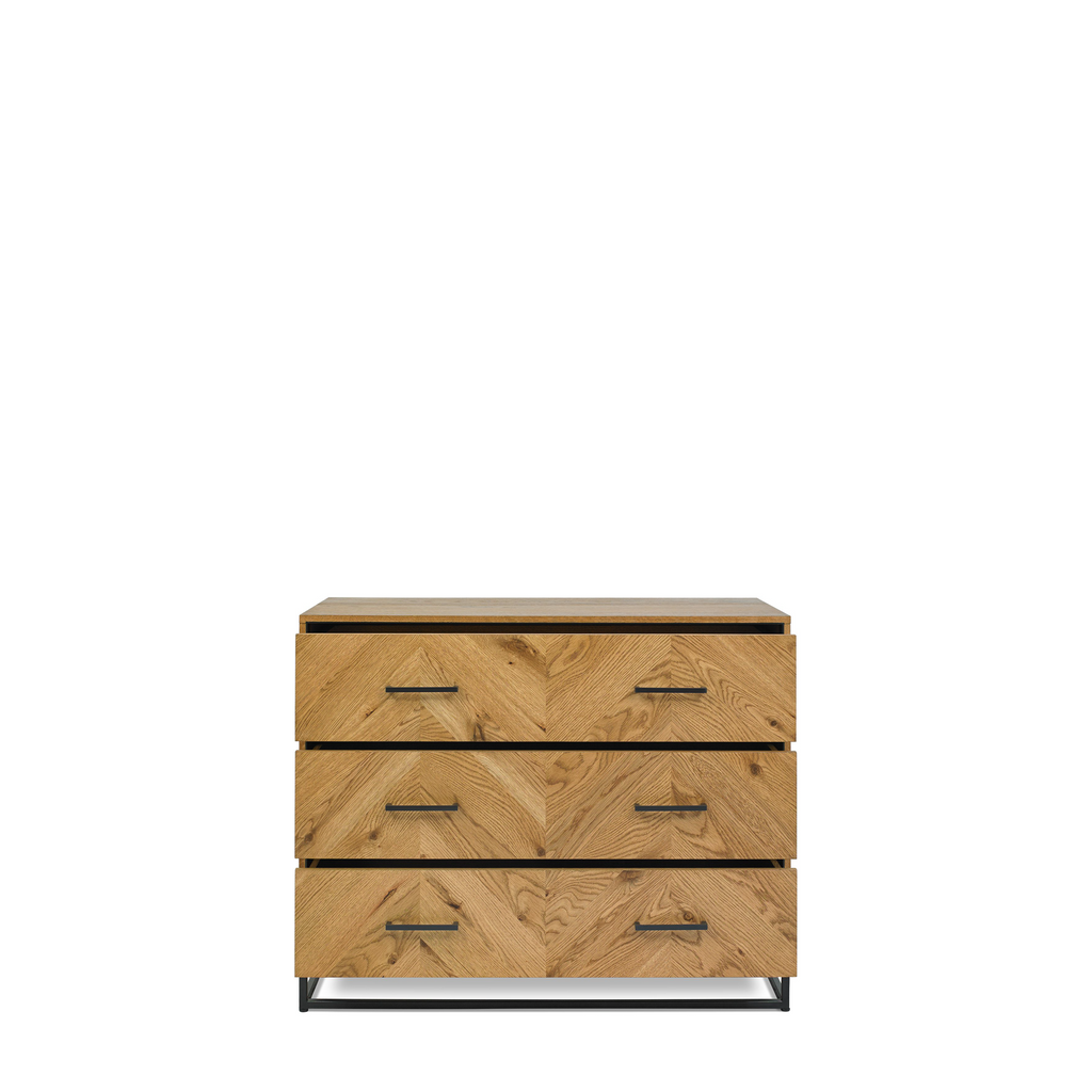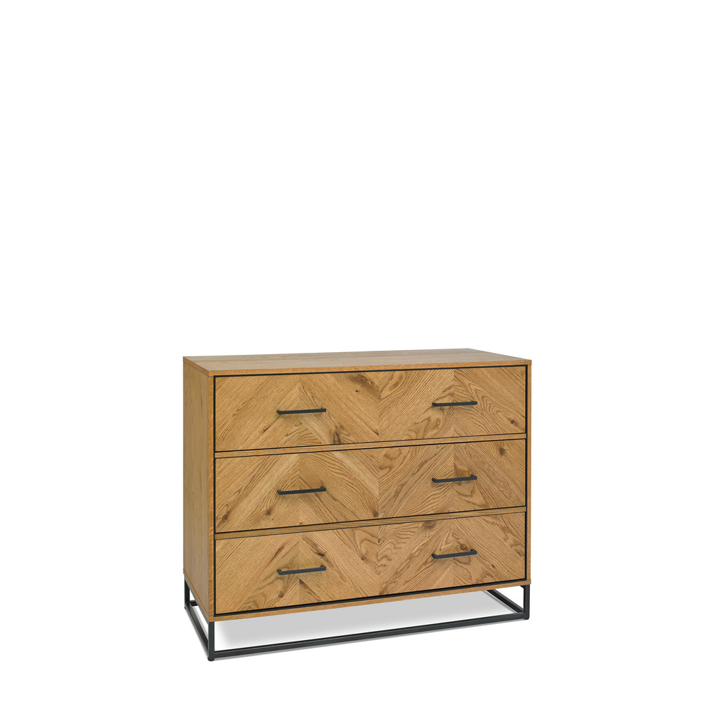 With dynamic zigzagging veneer patter, Chevron Rustic Oak is sure to make a stylish statement in any contemporary bedroom. Consisting of rustic oak veneers that are hand laid in a chevron pattern and oiled to highlight the rich character of oak, this range adds warmth and texture in abundance. Contrasting peppercorn inlay detail within the recesses of the drawers, doors and headboards combine with the peppercorn powder coated metal frames to give the range a slightly industrial edge. Quality mechanisms such as fully extending side mounted soft-close drawer runners add functional finishing touches to Chevron's on-trend, mixed-media aesthetic, resulting in a collection that is both practical and stylish.