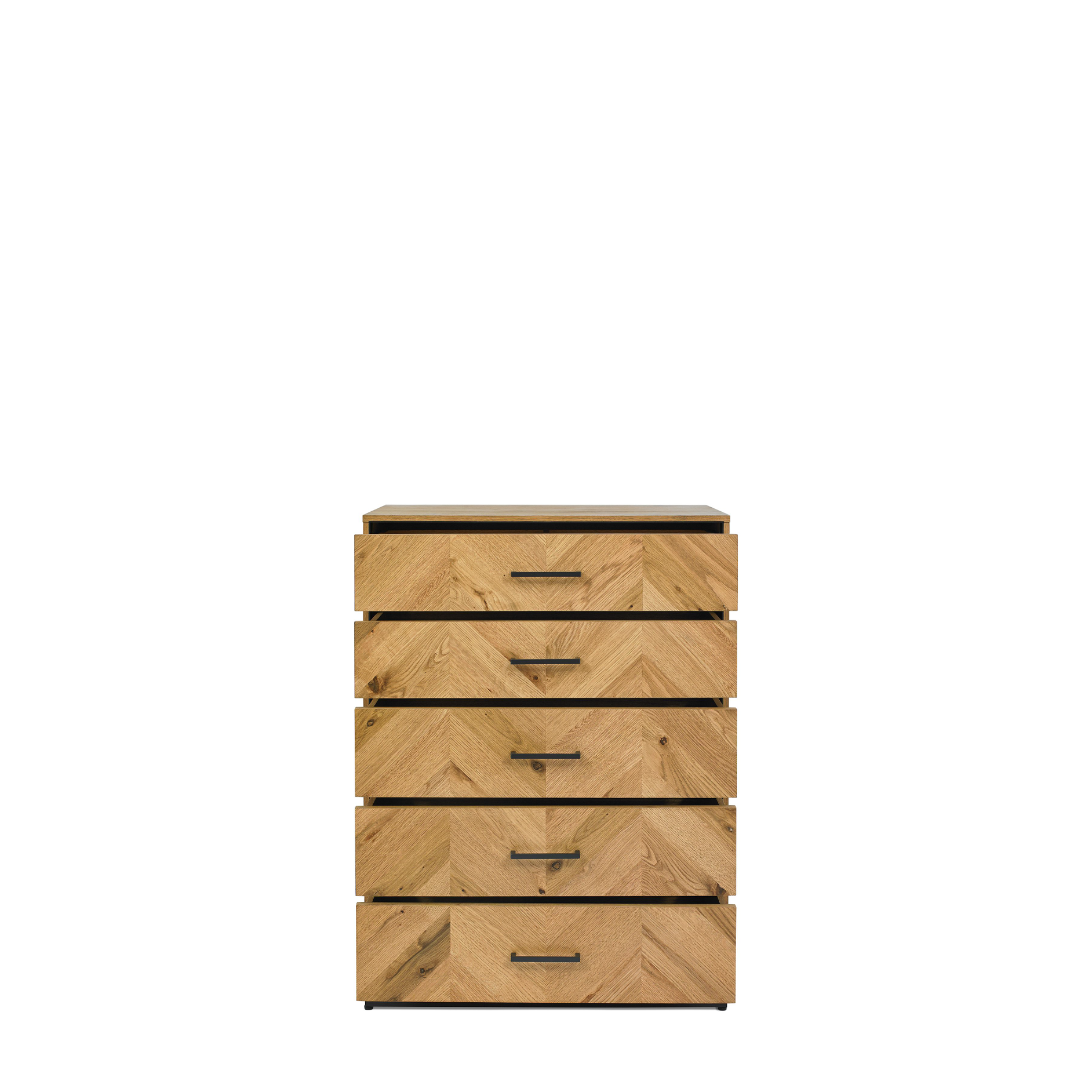 With dynamic zigzagging veneer patter, Chevron Rustic Oak is sure to make a stylish statement in any contemporary bedroom. Consisting of rustic oak veneers that are hand laid in a chevron pattern and oiled to highlight the rich character of oak, this range adds warmth and texture in abundance. Contrasting peppercorn inlay detail within the recesses of the drawers, doors and headboards combine with the peppercorn powder coated metal frames to give the range a slightly industrial edge. Quality mechanisms such as fully extending side mounted soft-close drawer runners add functional finishing touches to Chevron's on-trend, mixed-media aesthetic, resulting in a collection that is both practical and stylish.