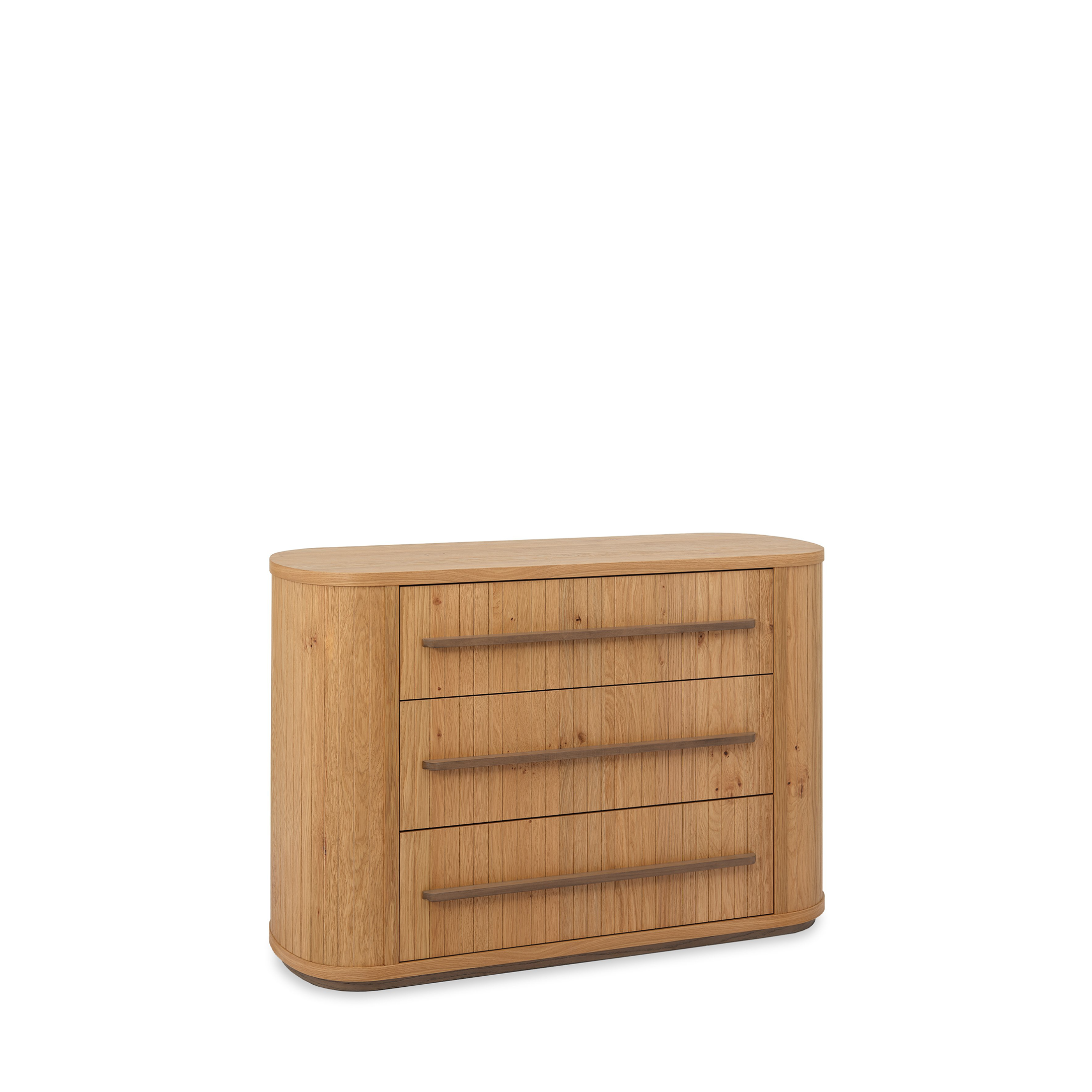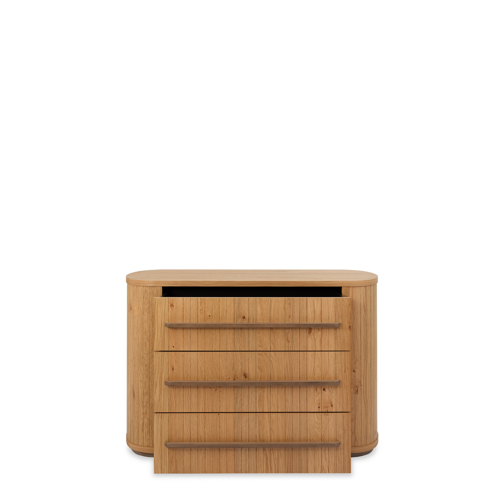The Nova bedroom range brings a sense of crafted character to contemporary spaces, combining knotty oak veneers with a soft weathered finish and expressive grain. At its centre, the bed frame sets a confident tone with turned oak legs and a pearl crushed velvet headboard that introduces texture and contrast. Curved profiles and subtle grove detailing run throughout the range, lending cohesion and balance to each piece. Generous drawer storage is provided through softly contoured chests and elliptical nightstands, available in both three-drawer and open-shelf variations to suit a variety of room layouts and lifestyles. The Dressing Table pairs a central drawer with shelving concealed behind its pillar-like sides, offering a streamlined look with functional detail.
