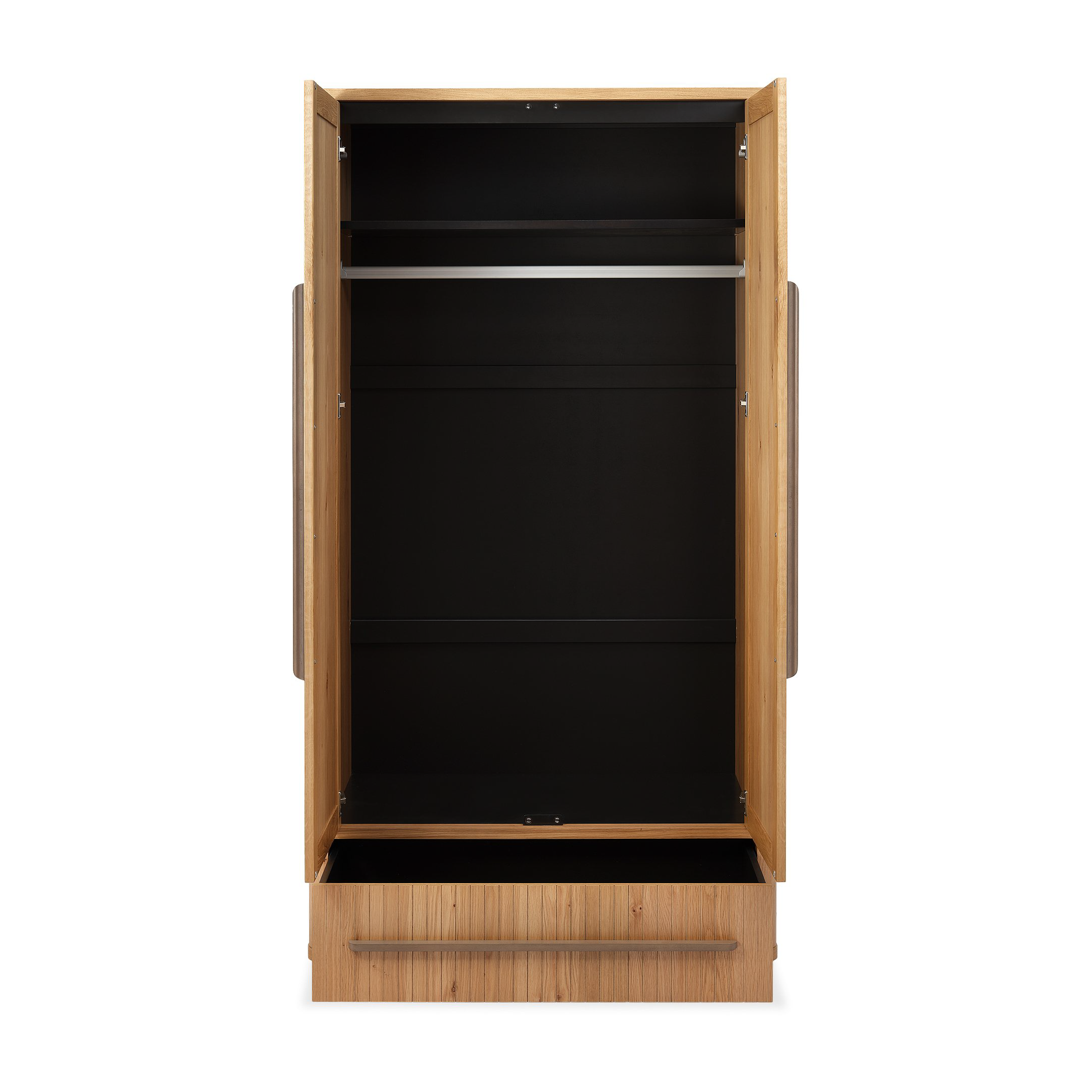 The Nova bedroom range brings a sense of crafted character to contemporary spaces, combining knotty oak veneers with a soft weathered finish and expressive grain. At its centre, the bed frame sets a confident tone with turned oak legs and a pearl crushed velvet headboard that introduces texture and contrast. Curved profiles and subtle grove detailing run throughout the range, lending cohesion and balance to each piece. Generous drawer storage is provided through softly contoured chests and elliptical nightstands, available in both three-drawer and open-shelf variations to suit a variety of room layouts and lifestyles. The Dressing Table pairs a central drawer with shelving concealed behind its pillar-like sides, offering a streamlined look with functional detail.