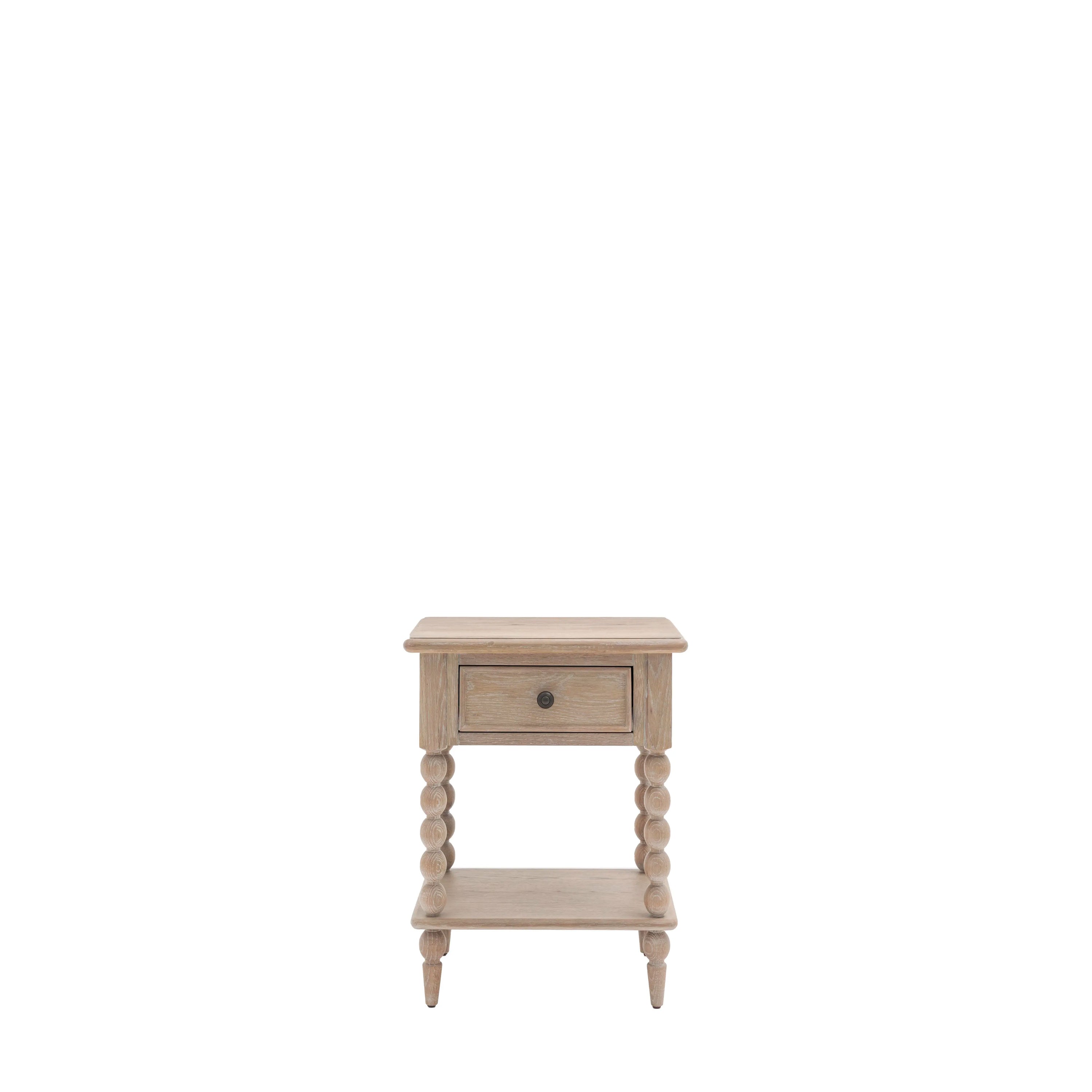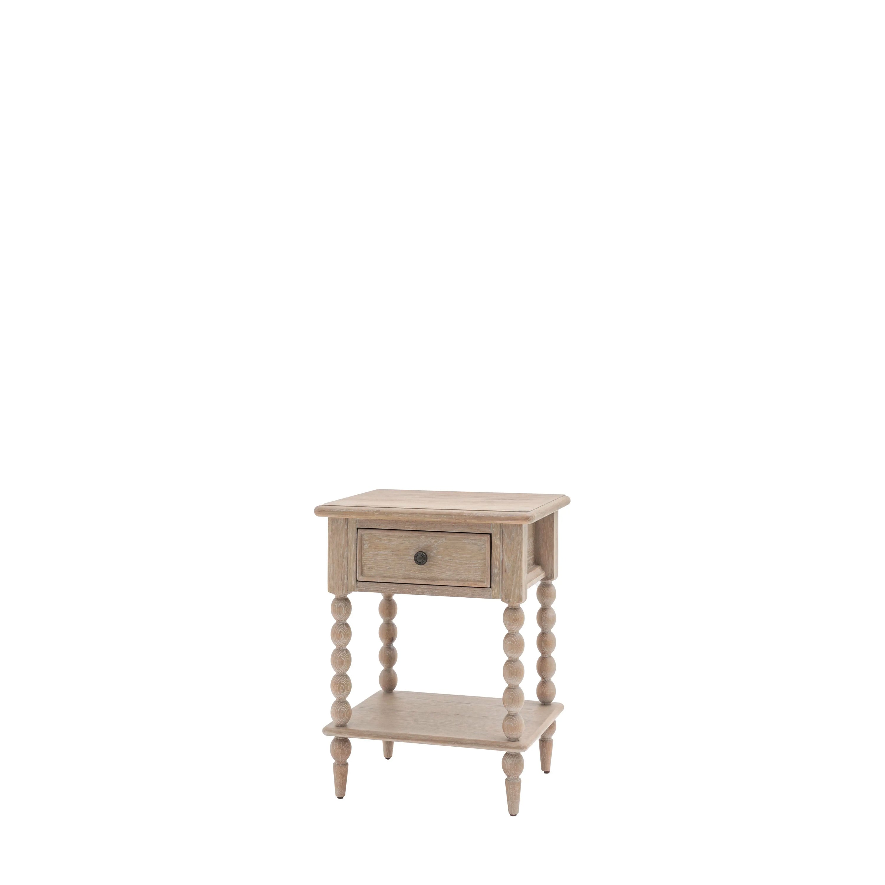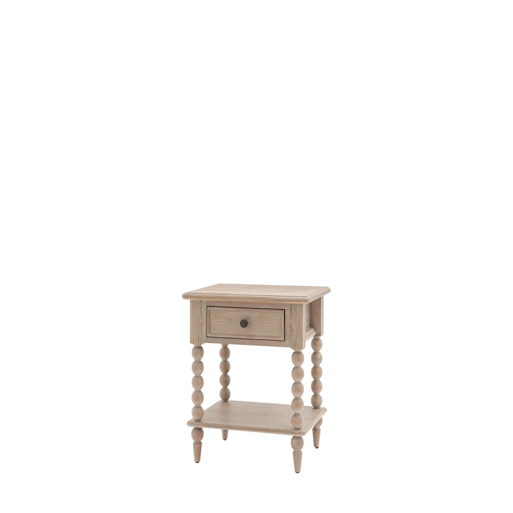 This 1 drawer bedside combines craftsmanship and functionality in a compact design. Featuring intricate hand-turned bobbin detailing, it is made from solid oak with a subtle lime-wash finish for a soft and natural look. This bedside table includes a practical drawer, making it an elegant and versatile addition to any bedroom.