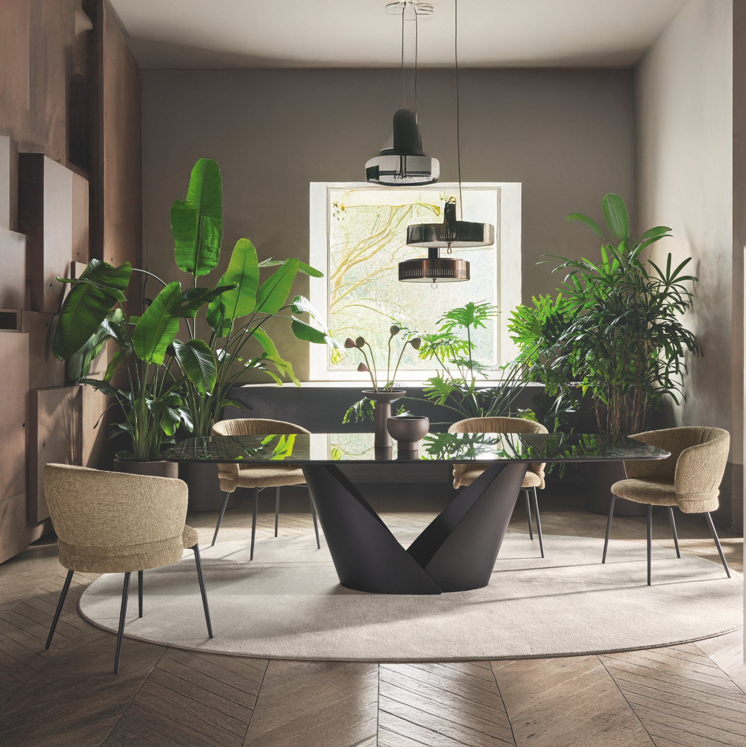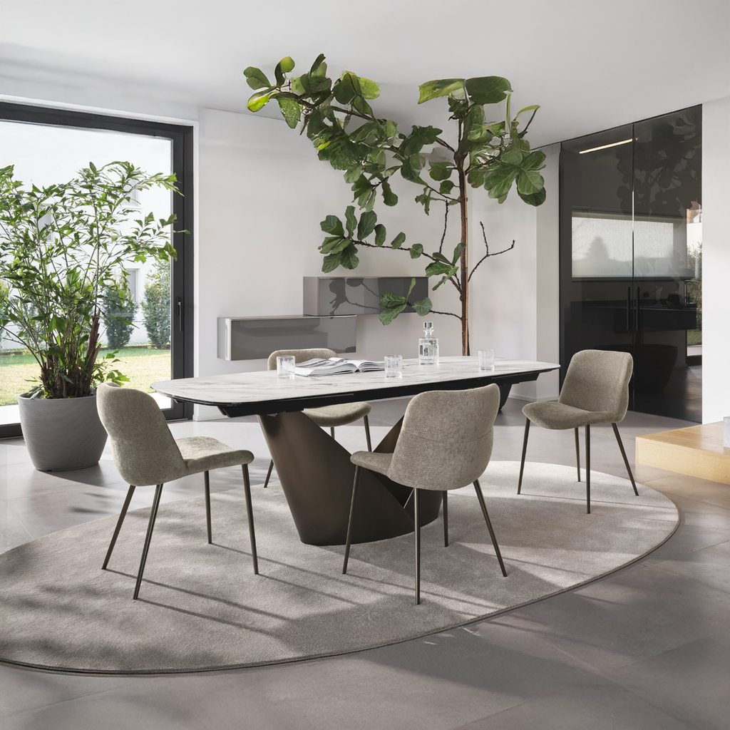 A prominent table, designed to be the centrepiece in the contemporary living space. Calla features a base that resembles a flower – robust yet light, it consists of two metal blades which, as petals do, interlock, creating a chalice shape that opens out upwards, alluding to vitality and rebirth.