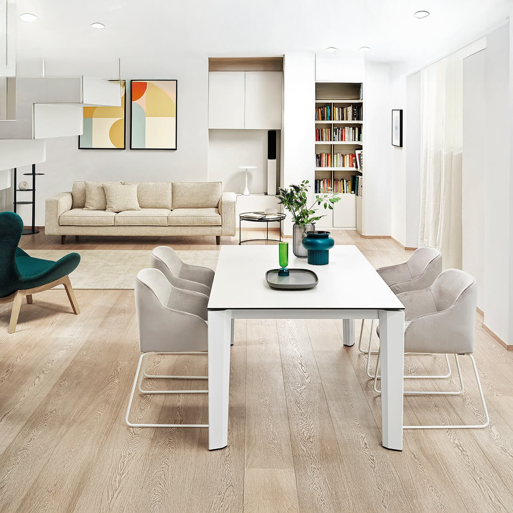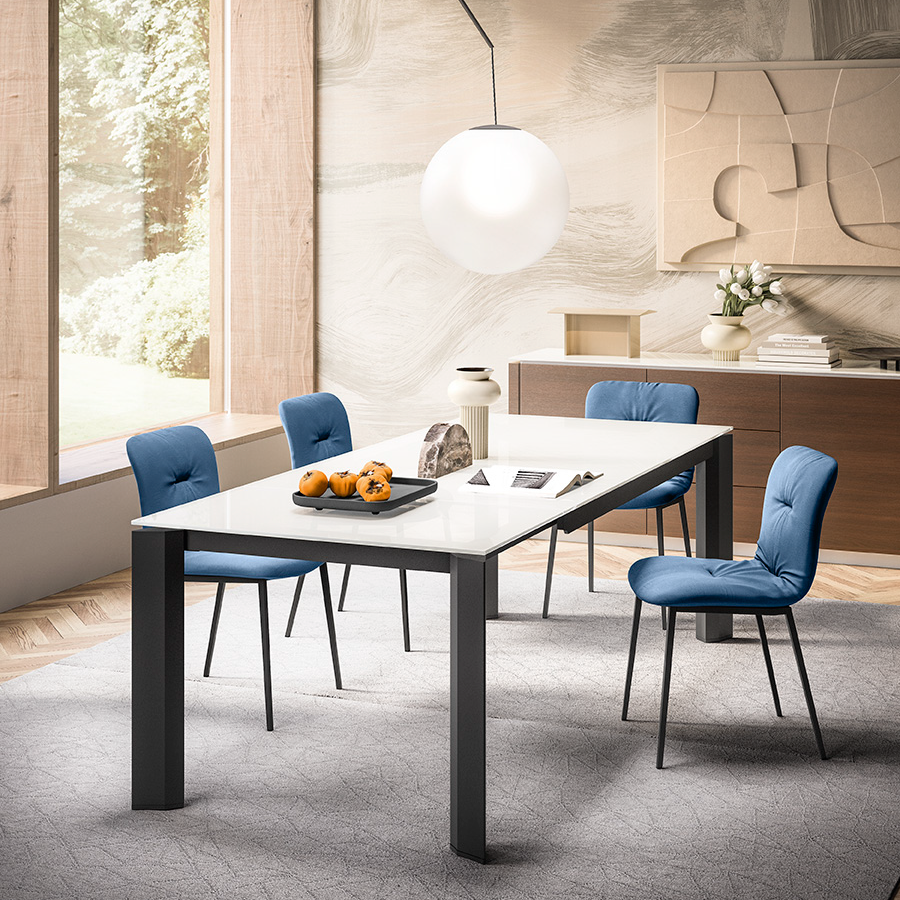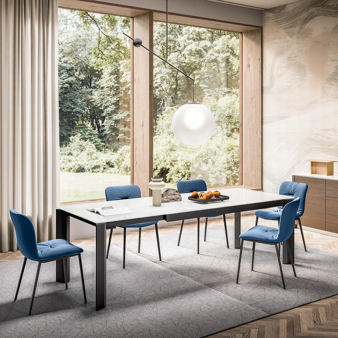 The Delta table features slant-cut legs and a top that extends along guides. Legs always remain at the corners of the table offering maximum comfort to all guests. Discover all the available finishes.