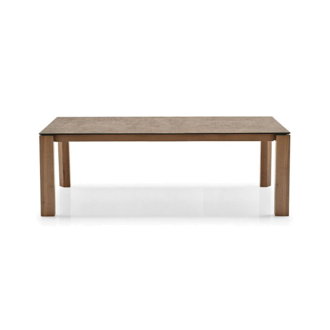 The Calligaris Omnia is an elegant rectangular table that can comfortably accommodate up to 8 people. The large top, available in wood or in tempered glass, appears visibly raised off the wooden structure, giving the table a striking aesthetic effect of great lightness. The legs at the corners have a diagonal cut on the inside, a detail that characterizes the design.