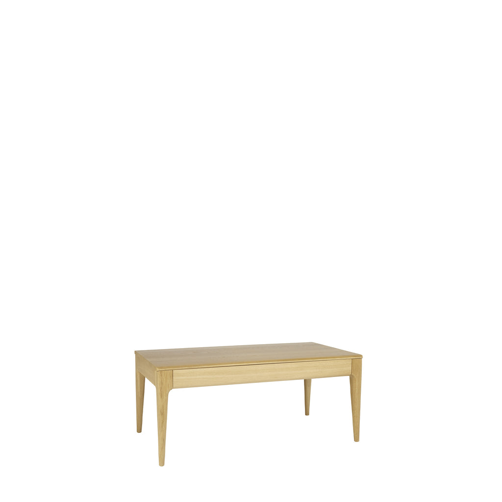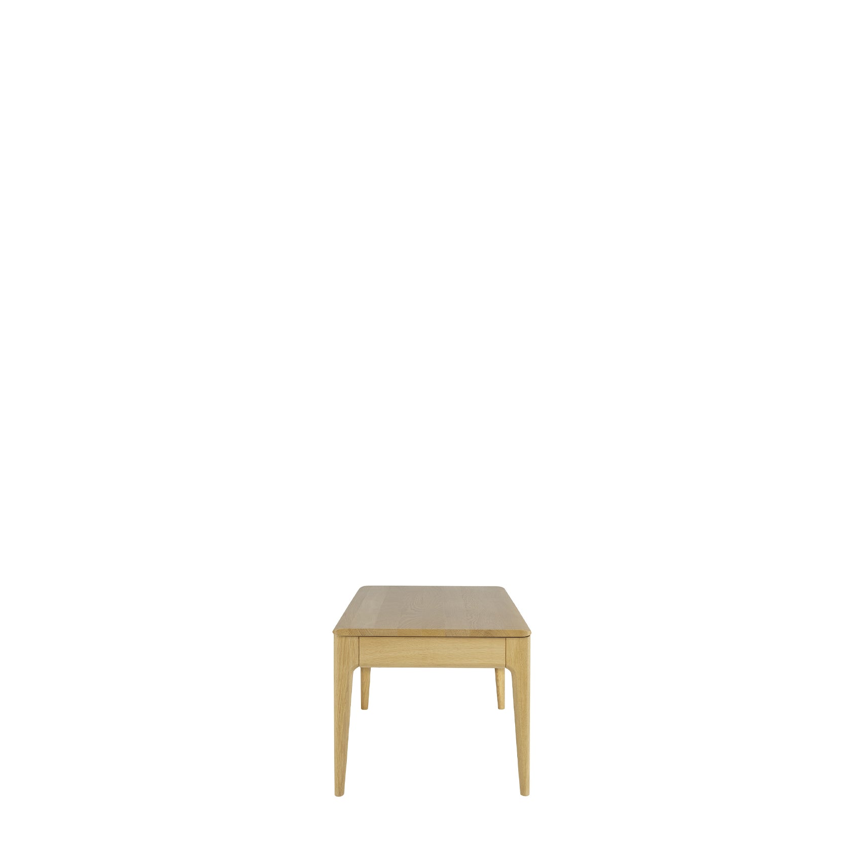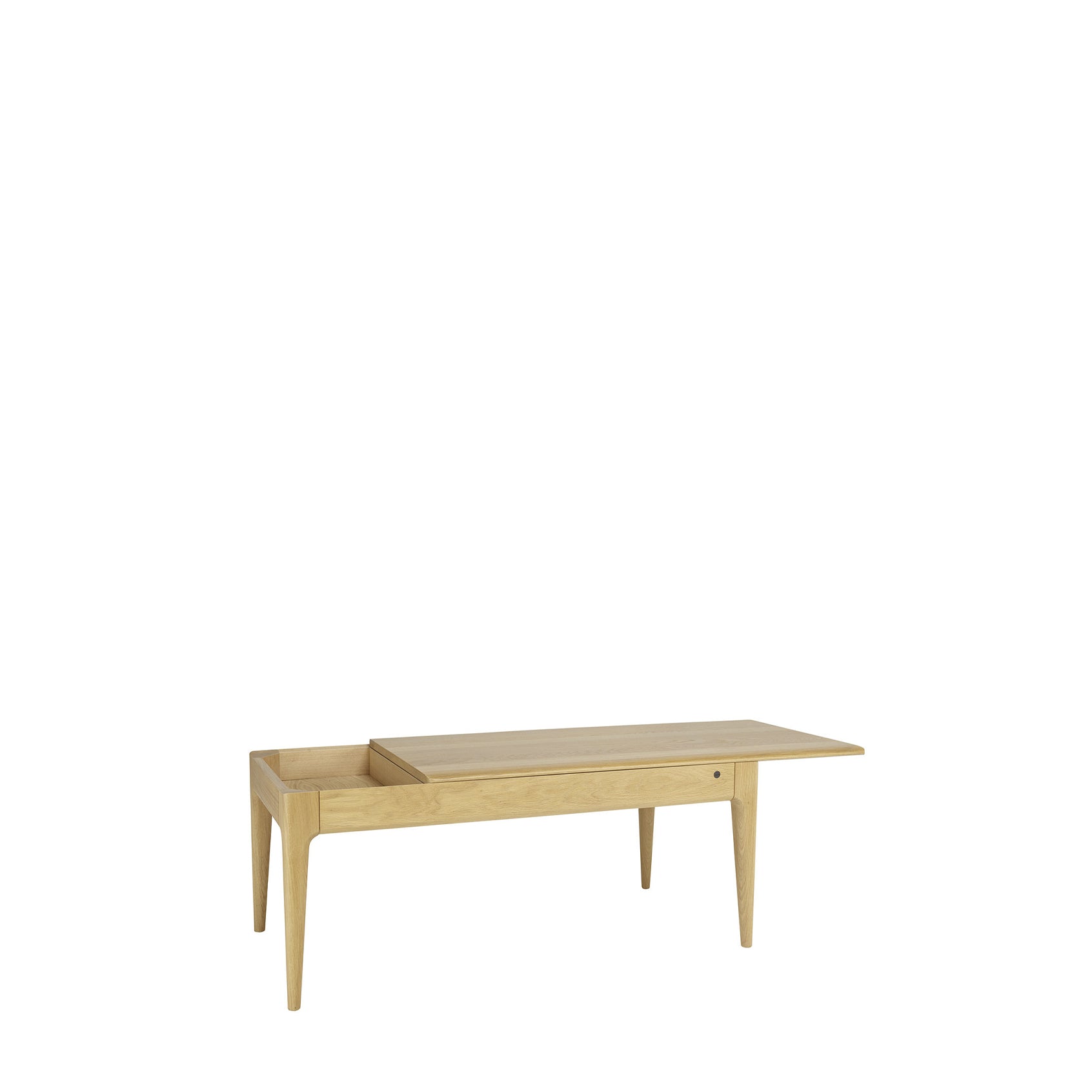 This beautiful oak coffee table not only features a stunning solid oak top but is extremely practical as it includes a secret space, the top slides back to reveal a hidden recess, ideal for keeping your remote controls or a laptop in. The front edge of the table top bears the signature soft curve, and the legs have the fluid organic curves and chamfers that, characterise Romana. This oak furniture is finished in a clear matt lacquer to show the beauty of the natural timber.