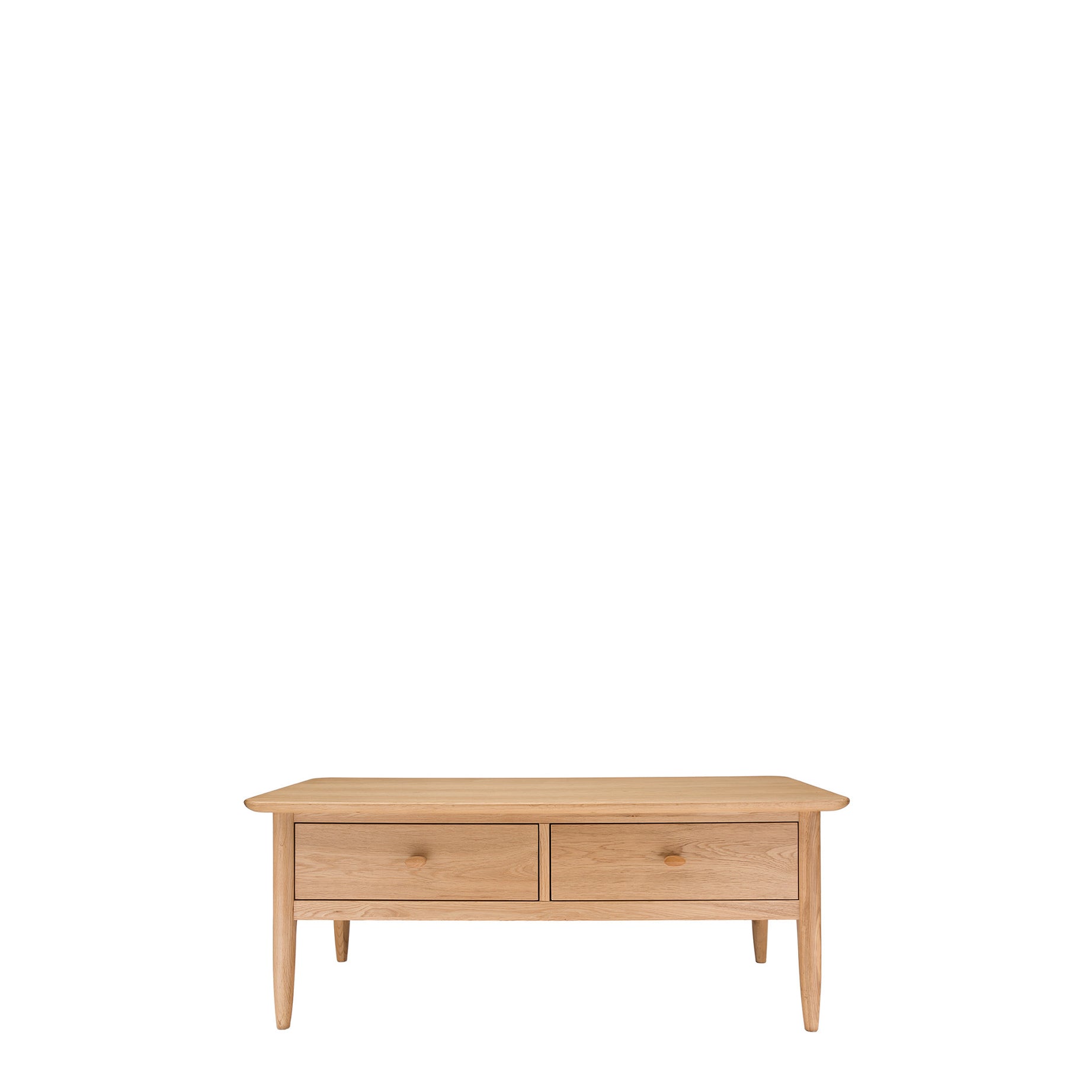The Teramo coffee table in pale oak is elegant and contemporary in design, its clean lines inspired by the Shaker design style. Beneath its overhanging top are two deep drawers finished with dovetail joints. The turned legs and distinctive oval drawer handles are characteristically Ercol.