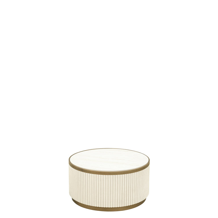These nesting coffee tables bring modern sophistication to your living room. The combination of suede fabric and oak veneer offers a unique tactile contrast. The larger table’s open design slides neatly over the smaller fluted table, allowing for dynamic arrangement options.