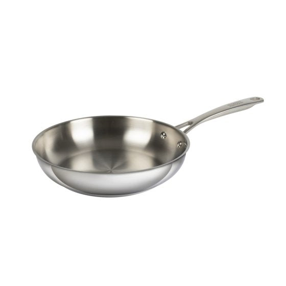 Ergonomic, stainless steel, riveted pan handle with hanging loop.