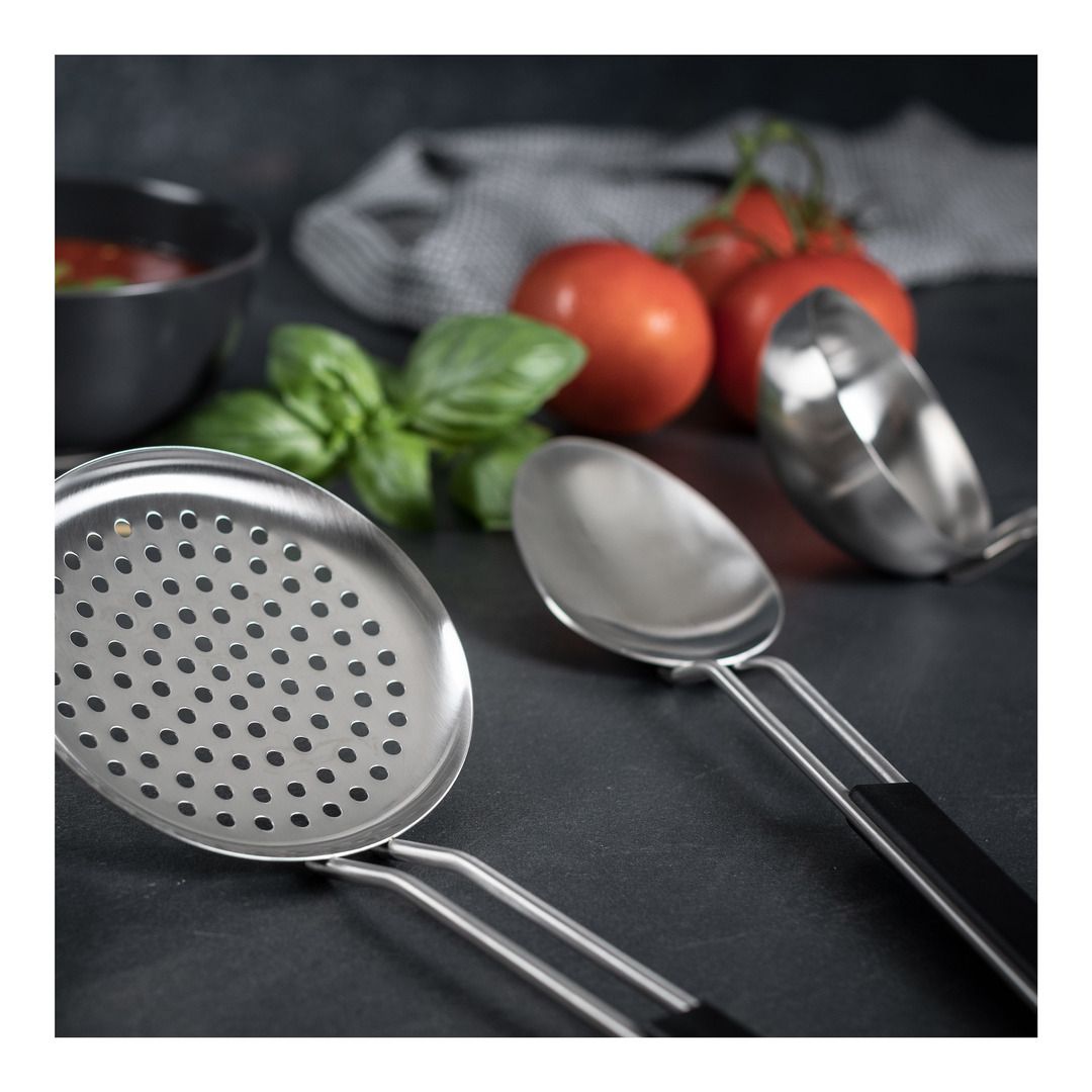 The Essential Skimmer allows to safely remove foods from hot liquids. Great for blanching, deep-frying and more. Our signature handle also allows for easy hanging.