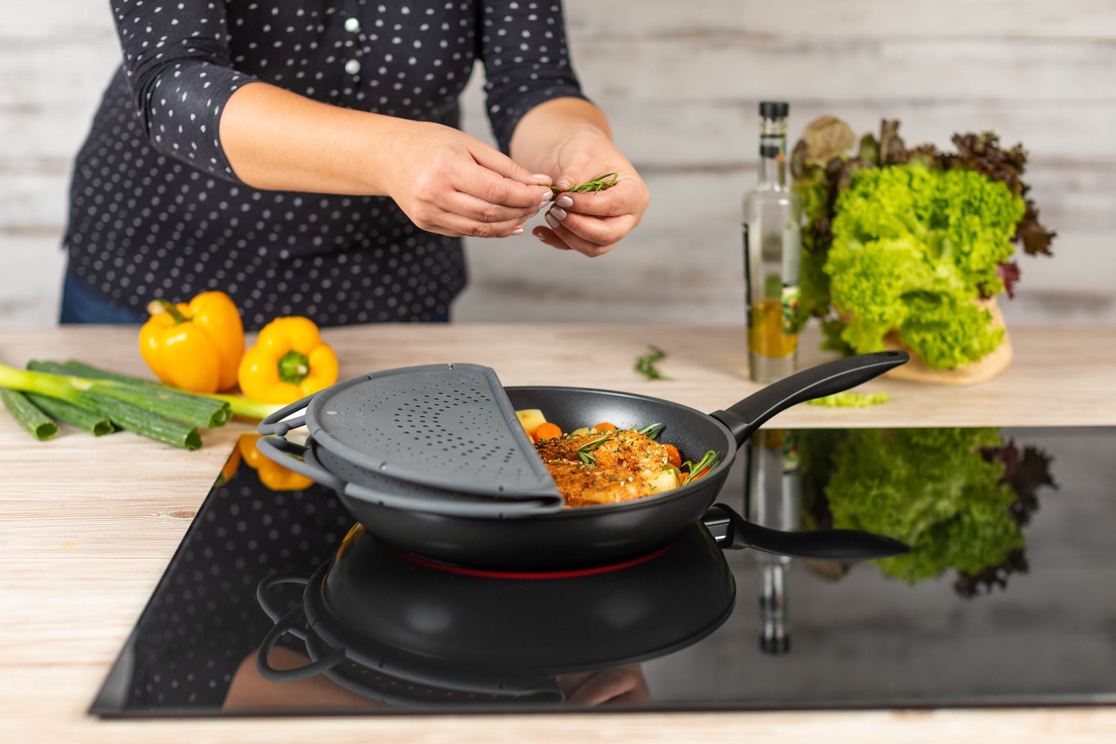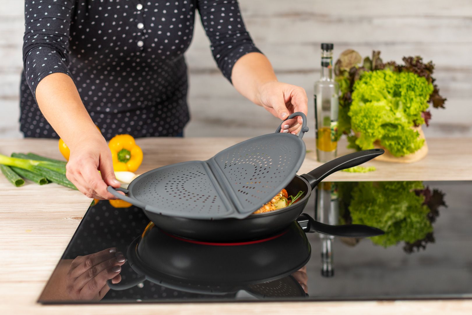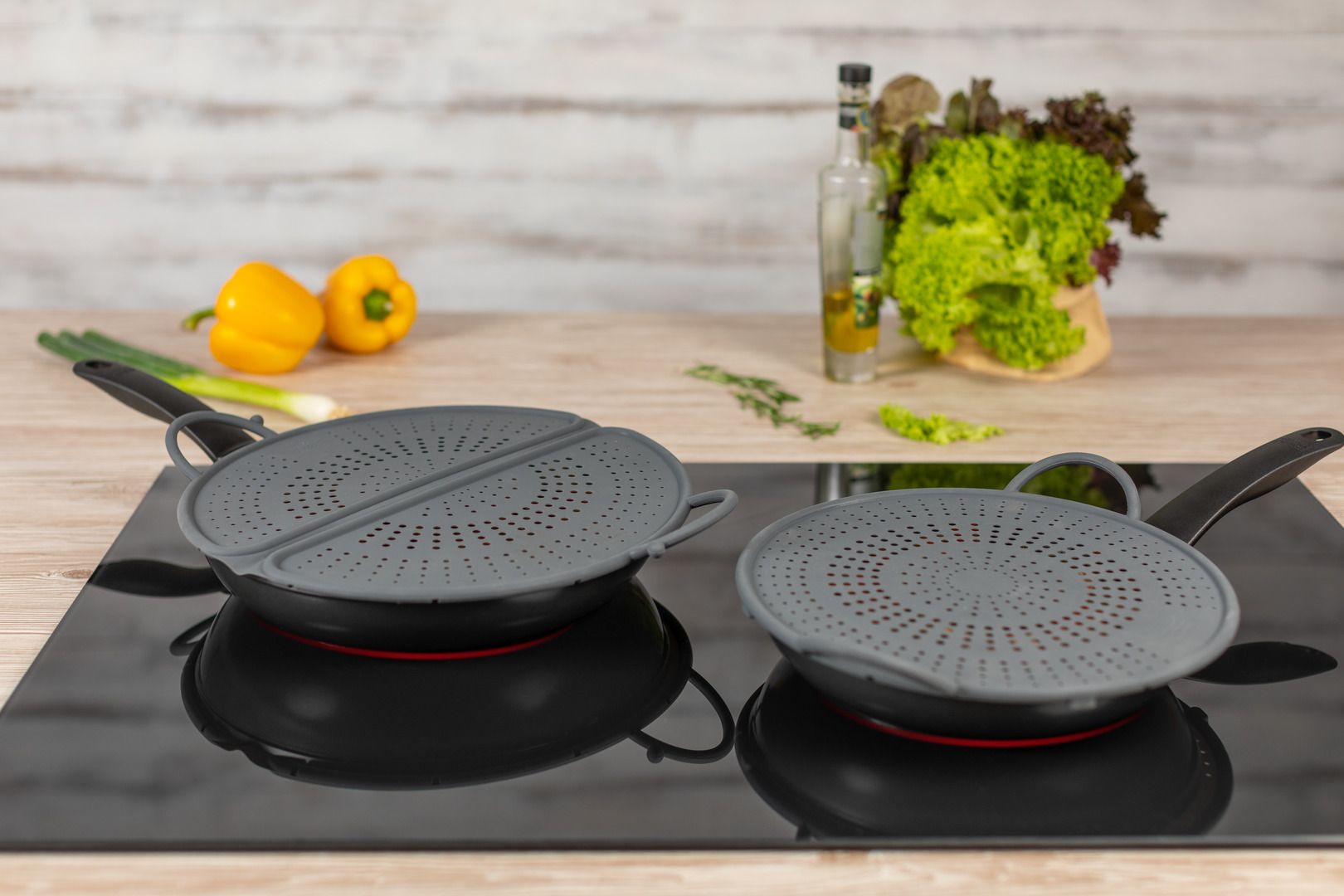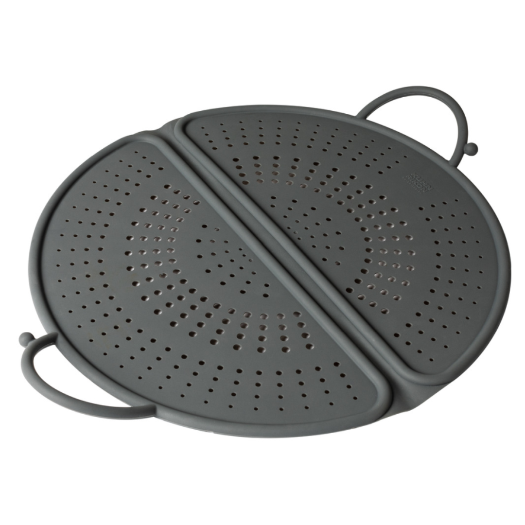 Love bacon but hate the hot, greasy splatters? Frying and sautéing with our Foldable Silicone Splatter Guard will protect you and keep your stovetop clean. New folding design allows you to stir and add ingredients without removing it from the pan. Also functions as a strainer to drain, strain and rinse foods. You can even pop it in the microwave as a cover!