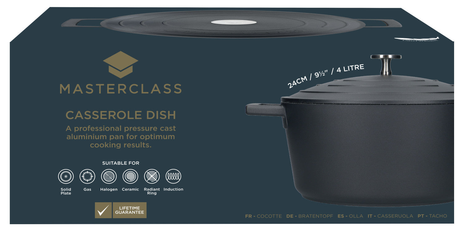 MasterClass 4L Large Cast Aluminium Casserole Dish with Lid, Black, 24cm