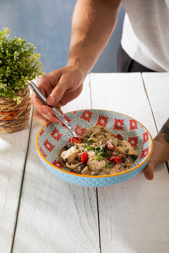 Add colour and charm to your dining with this vibrant stoneware bowl, crafted with a wide, shallow shape ideal for pasta, salads, noodles, stews, and more. Perfect for both everyday meals and entertaining. Featuring bold patterns and artistic detail, it suits both modern and eclectic tables. Microwave and dishwasher safe, this bowl combines style and practicality, an eye-catching addition to any kitchen collection.