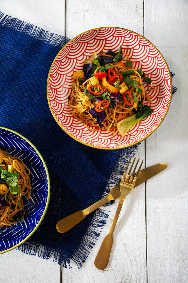 Add colour and charm to your dining with this vibrant stoneware bowl, crafted with a wide, shallow shape ideal for pasta, salads, noodles, stews, and more. Perfect for both everyday meals and entertaining. Featuring bold patterns and artistic detail, it suits both modern and eclectic tables. Microwave and dishwasher safe, this bowl combines style and practicality, an eye-catching addition to any kitchen collection.
