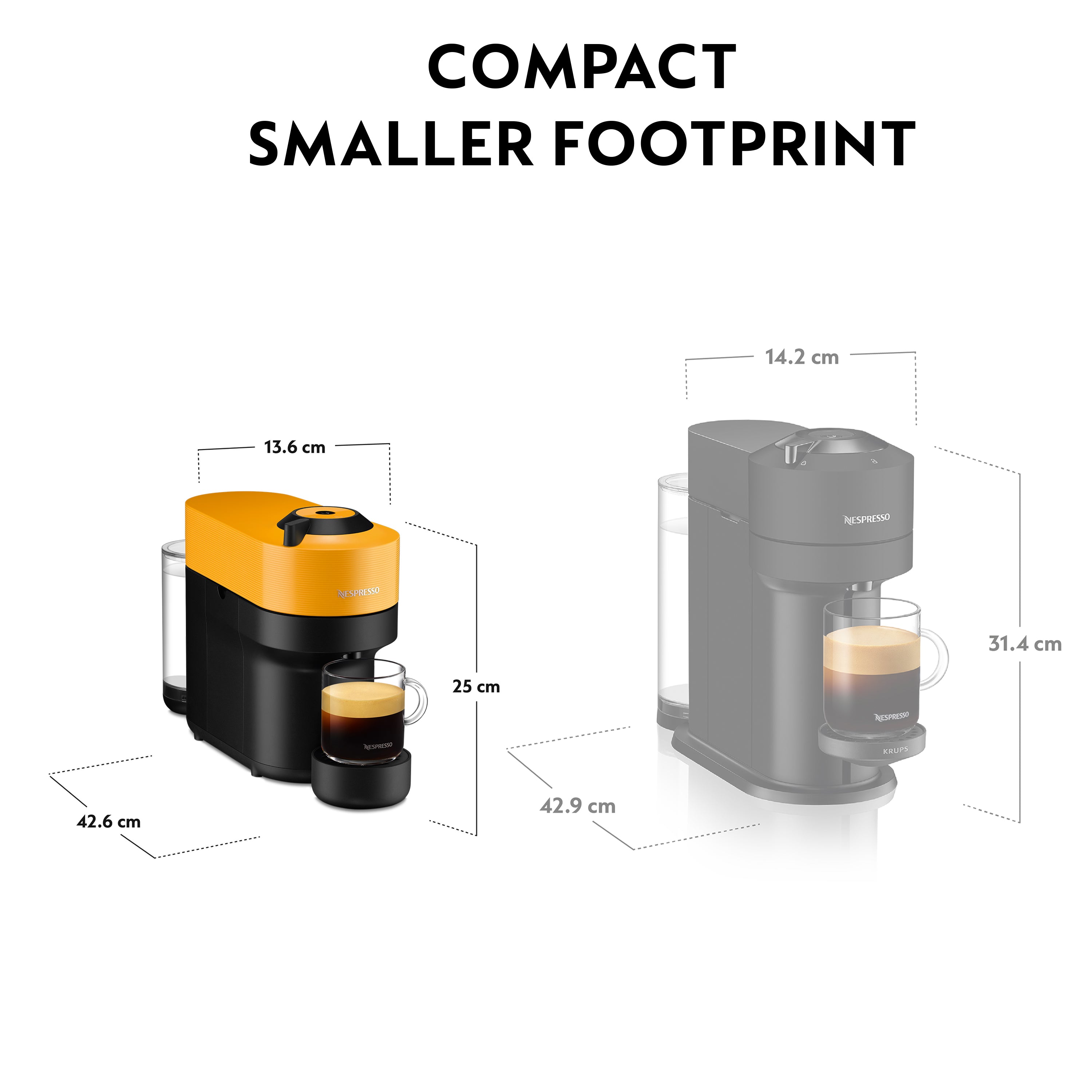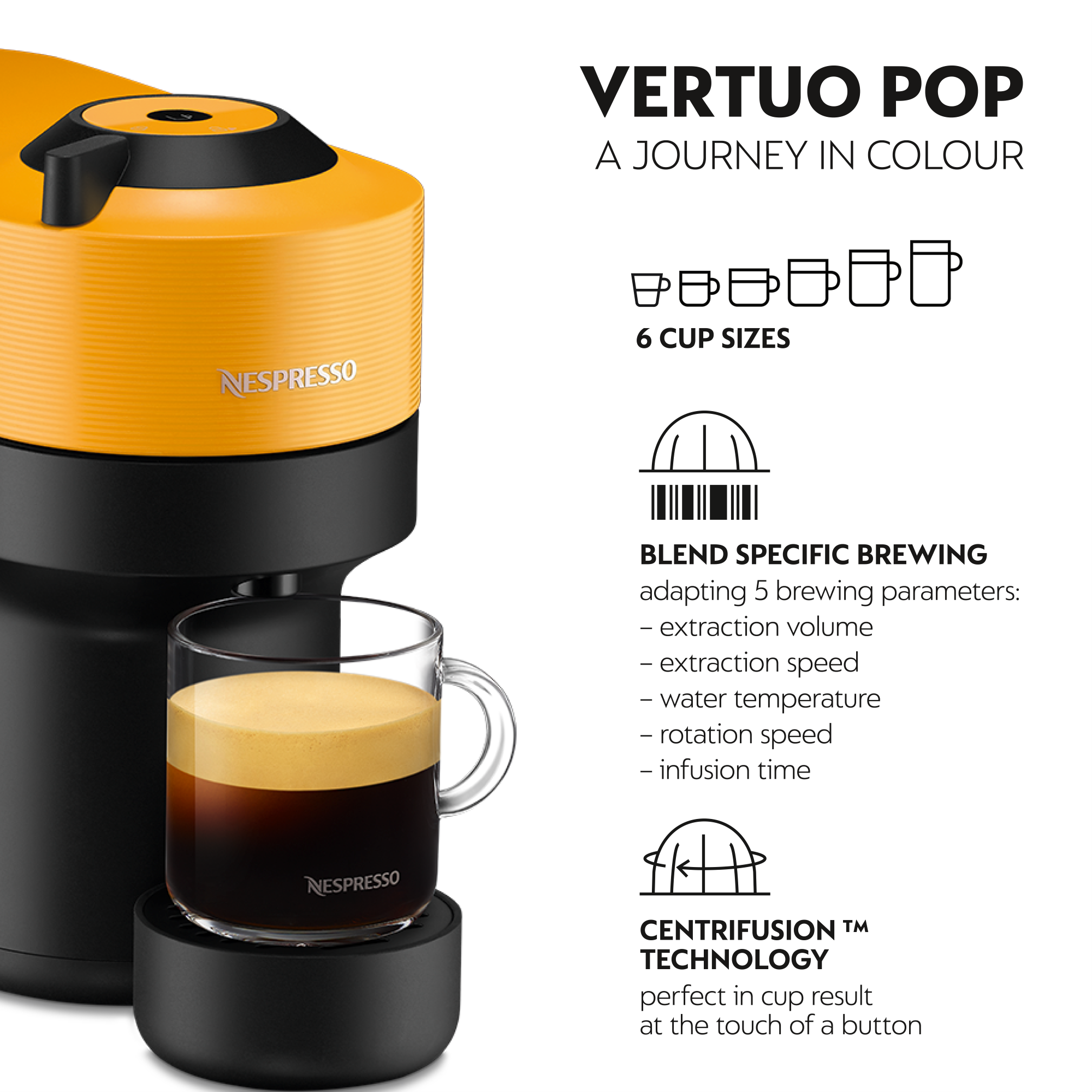 Standing at 25 cm, Vertuo Pop makes a big statement by going small. One button is enough to activate the best in every cup. Each capsule is analyzed thanks to a code to finely adjust brewing parameters. The centrifusion extraction system then enhance the aromas of each blend. Espresso, double espresso, gran lungo, mug… Get ready to be spoiled for choice.