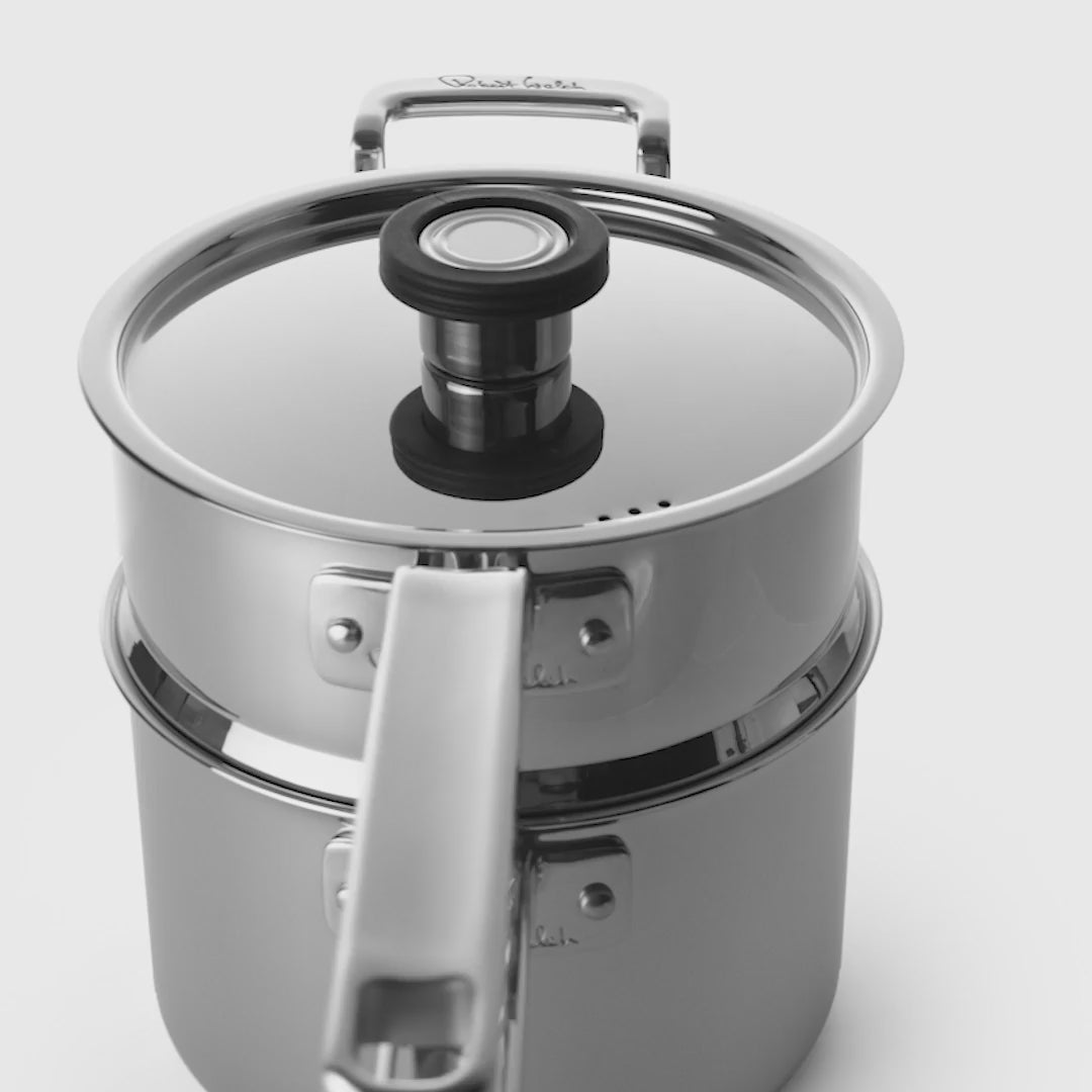 The two-piece Saucepan Steamer Set features a saucepan with tri-ply construction: Two layers of high-grade stainless steel fully encapsulate a responsive aluminium core that extends throughout the pan from base to rim, ensuring rapid, even heat distribution. The steamer insert made from high quality 18/10 stainless steel.