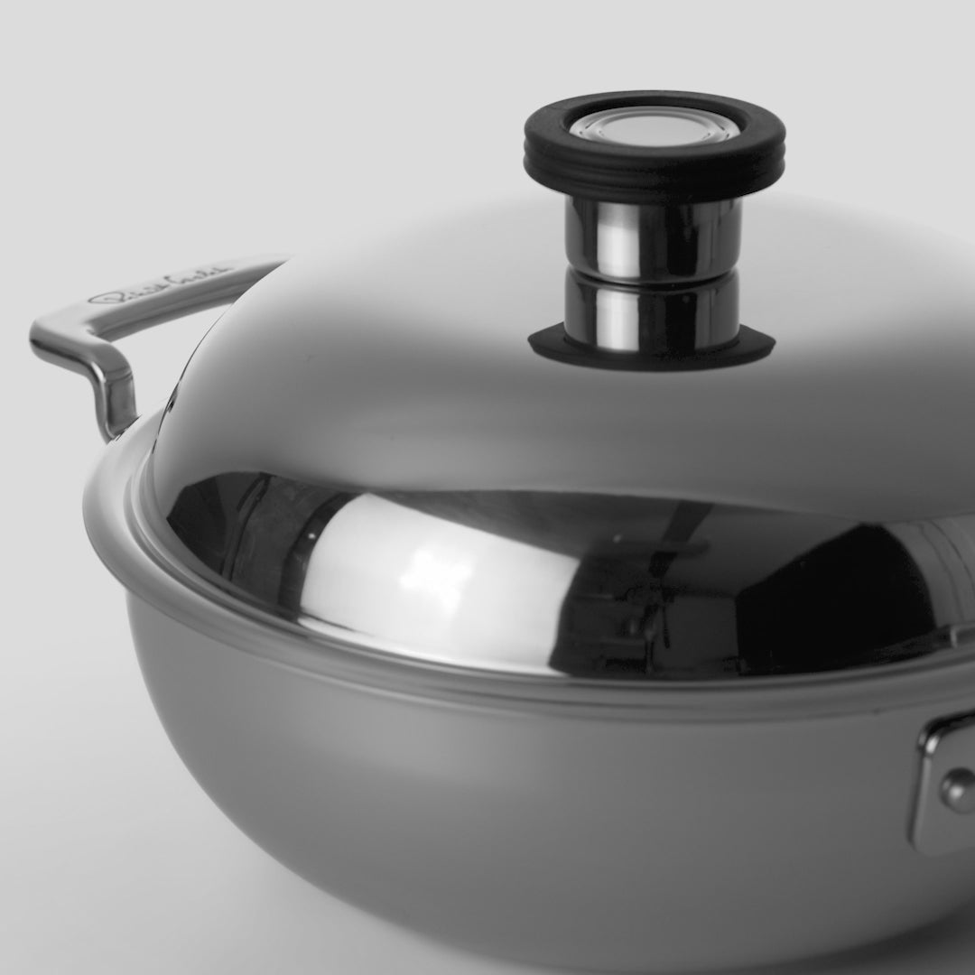 The wok features an uncoated tri-ply construction: Two layers of high-grade stainless steel fully encapsulate a responsive aluminium core that extends throughout the pan from base to rim, ensuring rapid, even heat distribution.