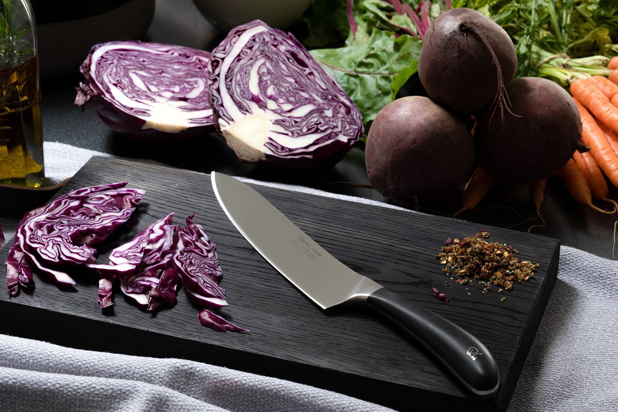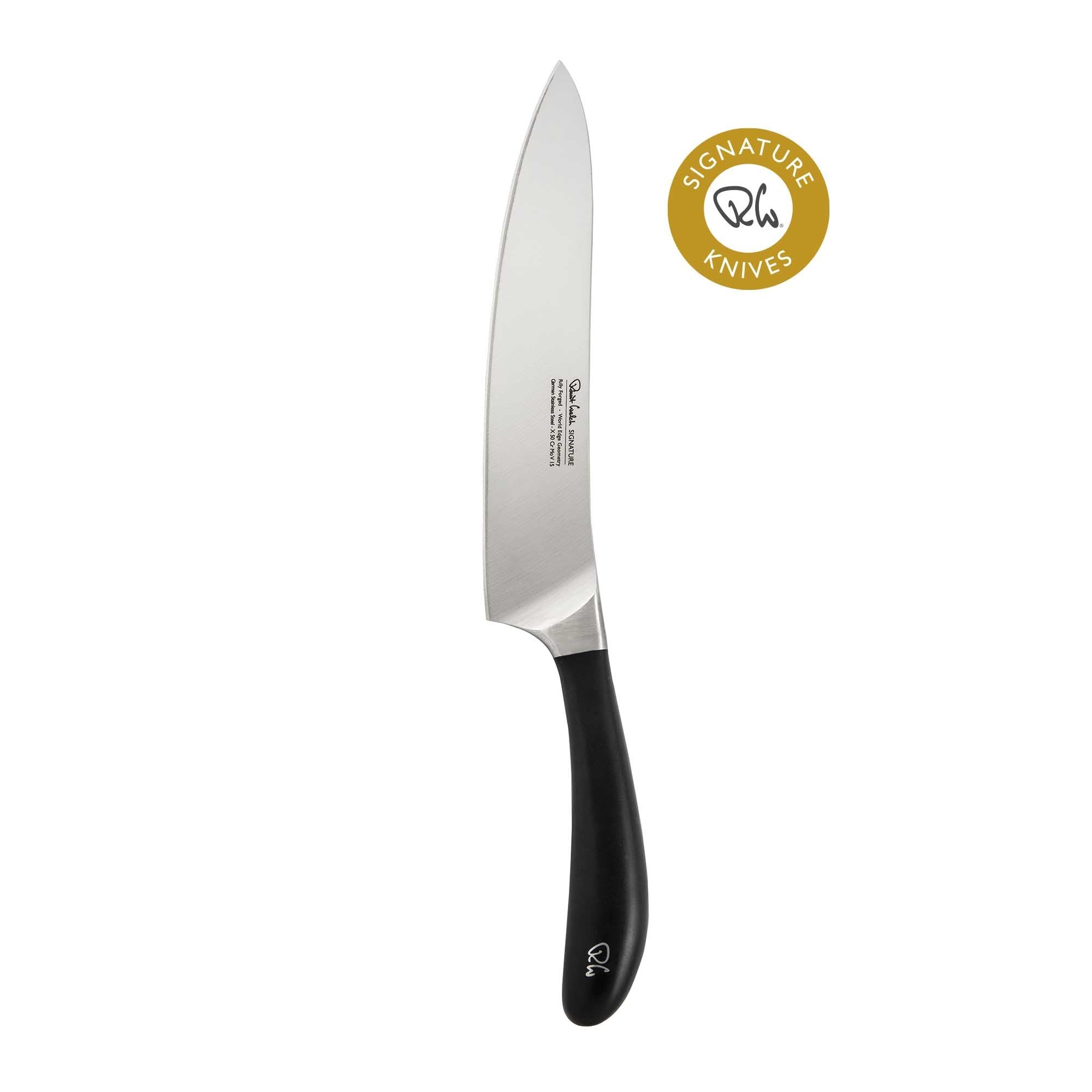 Designed in consultation with professional chefs this 20cm Cook’s knife, from the multi-award winning Signature range, features a fully forged German DIN 1.4116 stainless steel blade with a full tang for superior strength and balance. The Japanese-style blade edge is hand applied at a 15° angle. The tactile handle is ergonomically shaped for comfort and to minimise fatigue. The RW insignia is a permanent steel detail of the handle.Cook’s knives are a multi-purpose kitchen tool. Their curved blades allow for a two step chop and rock action, ideal for meat (raw or cooked) and hard vegetables as well as herbs, nuts and salads.Product Highlights: