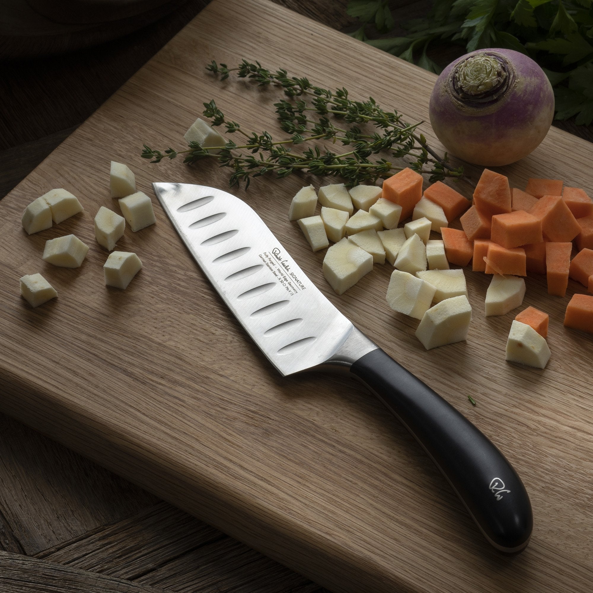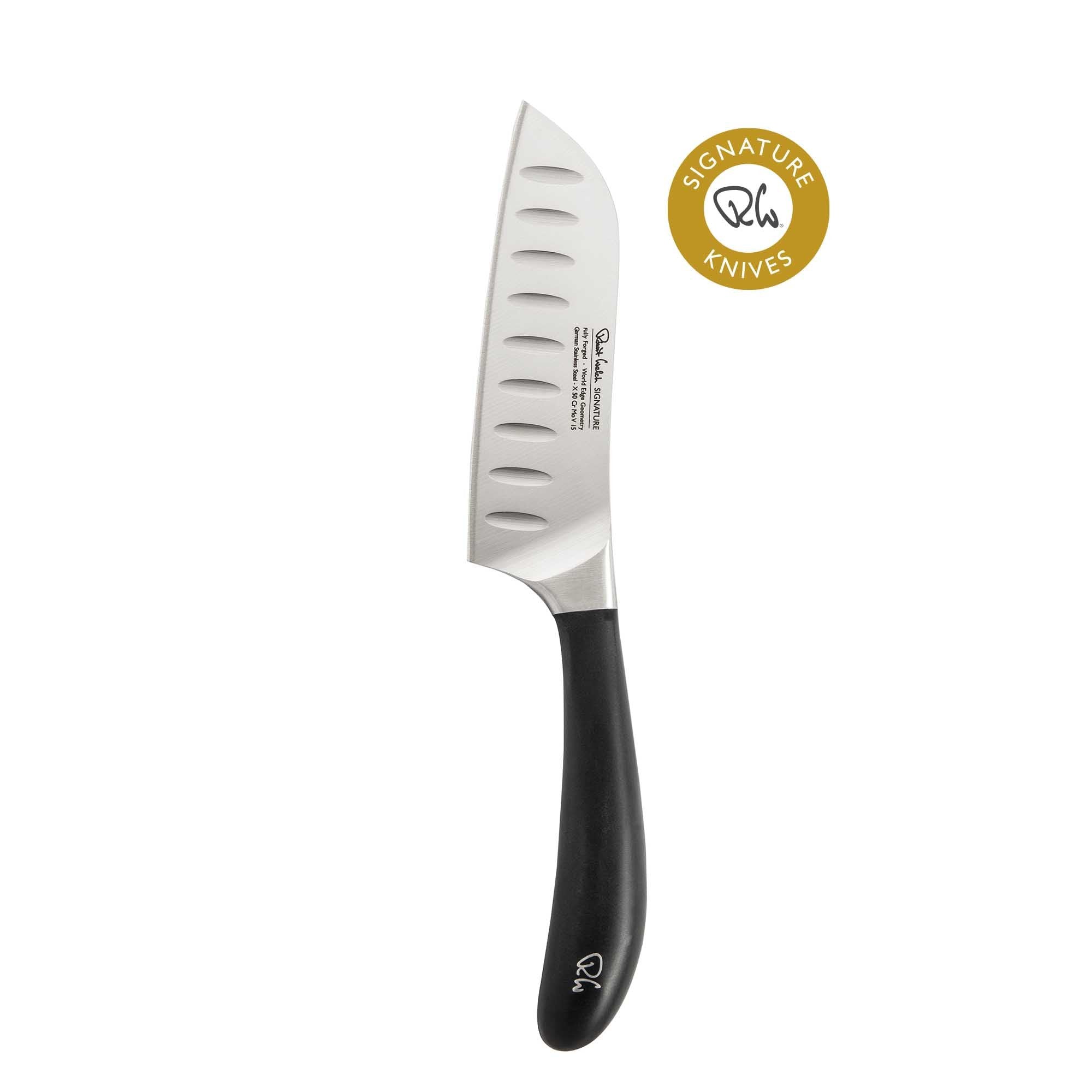 Designed in consultation with professional chefs, this 14cm Santoku knife from the multi-award winning Signature range features a fully forged German DIN 1.4116 stainless steel blade with a full tang for superior strength and balance. The Japanese-style blade edge is hand applied at a 15° angle. The tactile handle is ergonomically shaped for comfort and to minimise fatigue. The RW insignia is a permanent steel detail of the handle.A wide scalloped blade makes Santoku knives ideal for the precision slicing and dicing of fruit and vegetables. The scalloped indentations create air pockets, pushing food from the blade and reducing friction when slicing. The flat blade edge relies on a more singular downward cutting action, compared to the two-step slicing and rocking action of a cooks knife.Product Highlights: