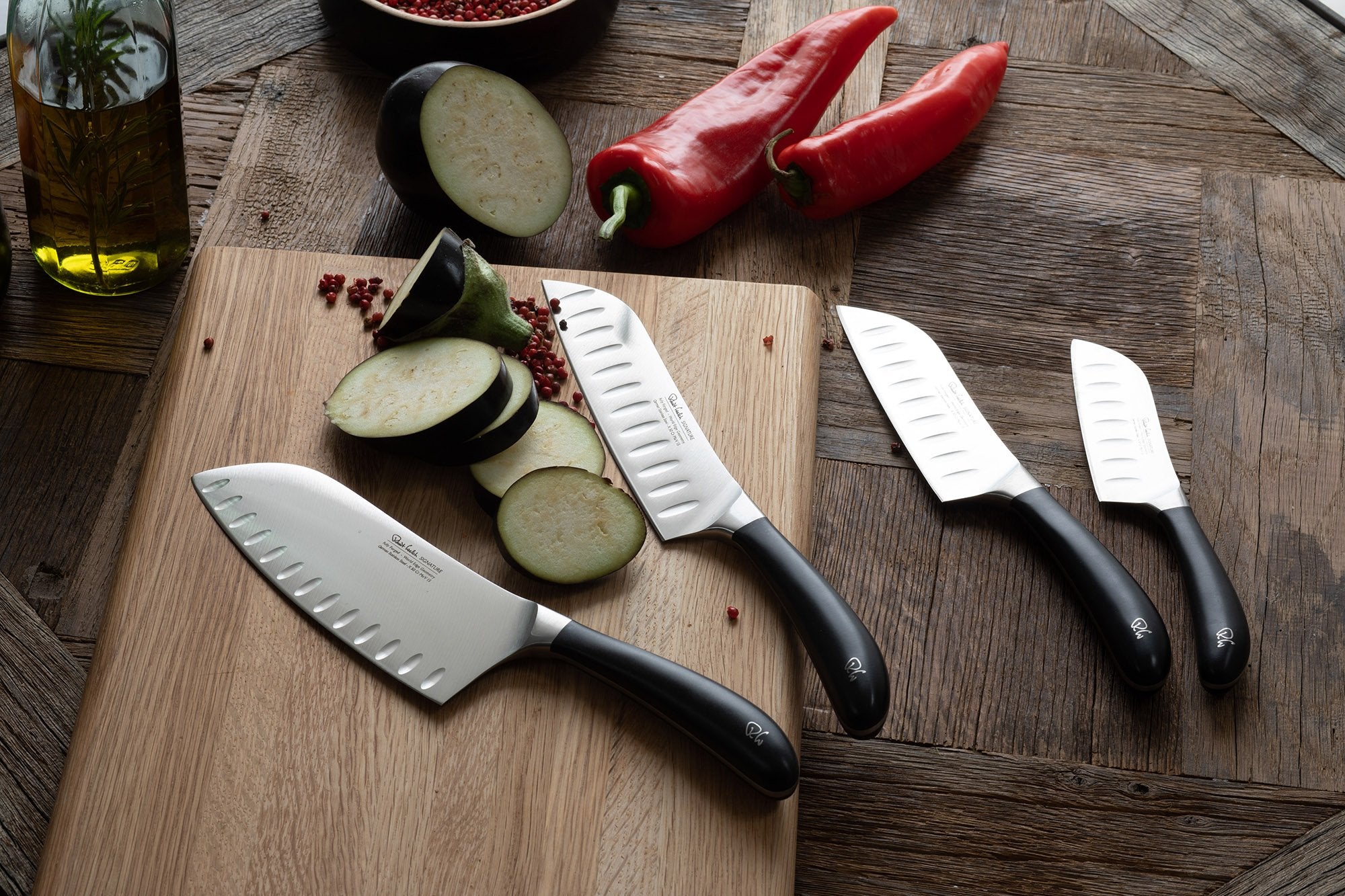 Designed in consultation with professional chefs, this 17cm Santoku knife from the multi-award winning Signature range features a fully forged German DIN 1.4116 stainless steel blade with a full tang for superior strength and balance. The Japanese-style blade edge is hand applied at a 15° angle. The tactile handle is ergonomically shaped for comfort and to minimise fatigue. The RW insignia is a permanent steel detail of the handle.A wide scalloped blade makes Santoku knives ideal for the precision slicing and dicing of fruit and vegetables. The scalloped indentations create air pockets, pushing food from the blade and reducing friction when slicing. The flat blade edge relies on a more singular downward cutting action, compared to the two-step slicing and rocking action of a cooks knife.Product Highlights: