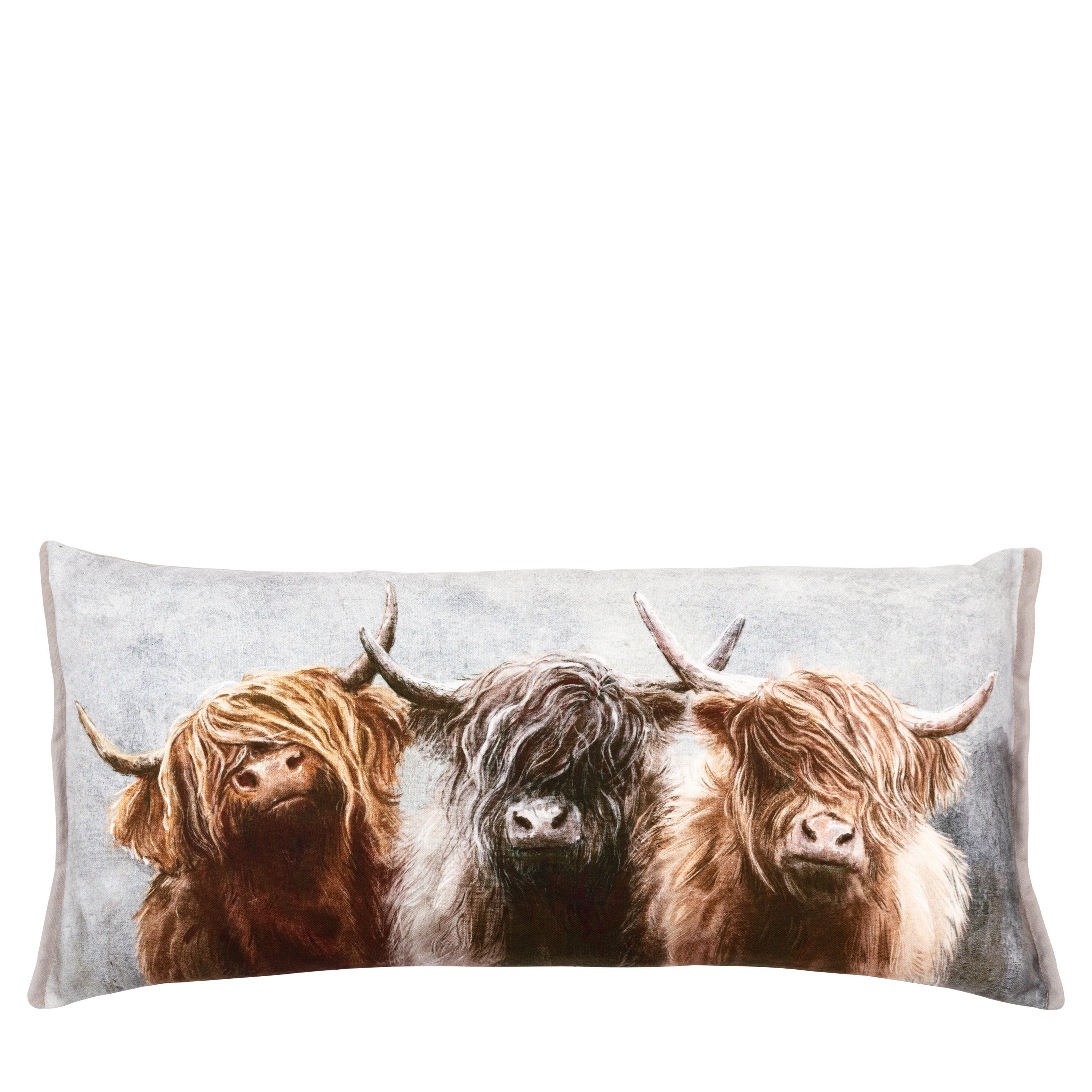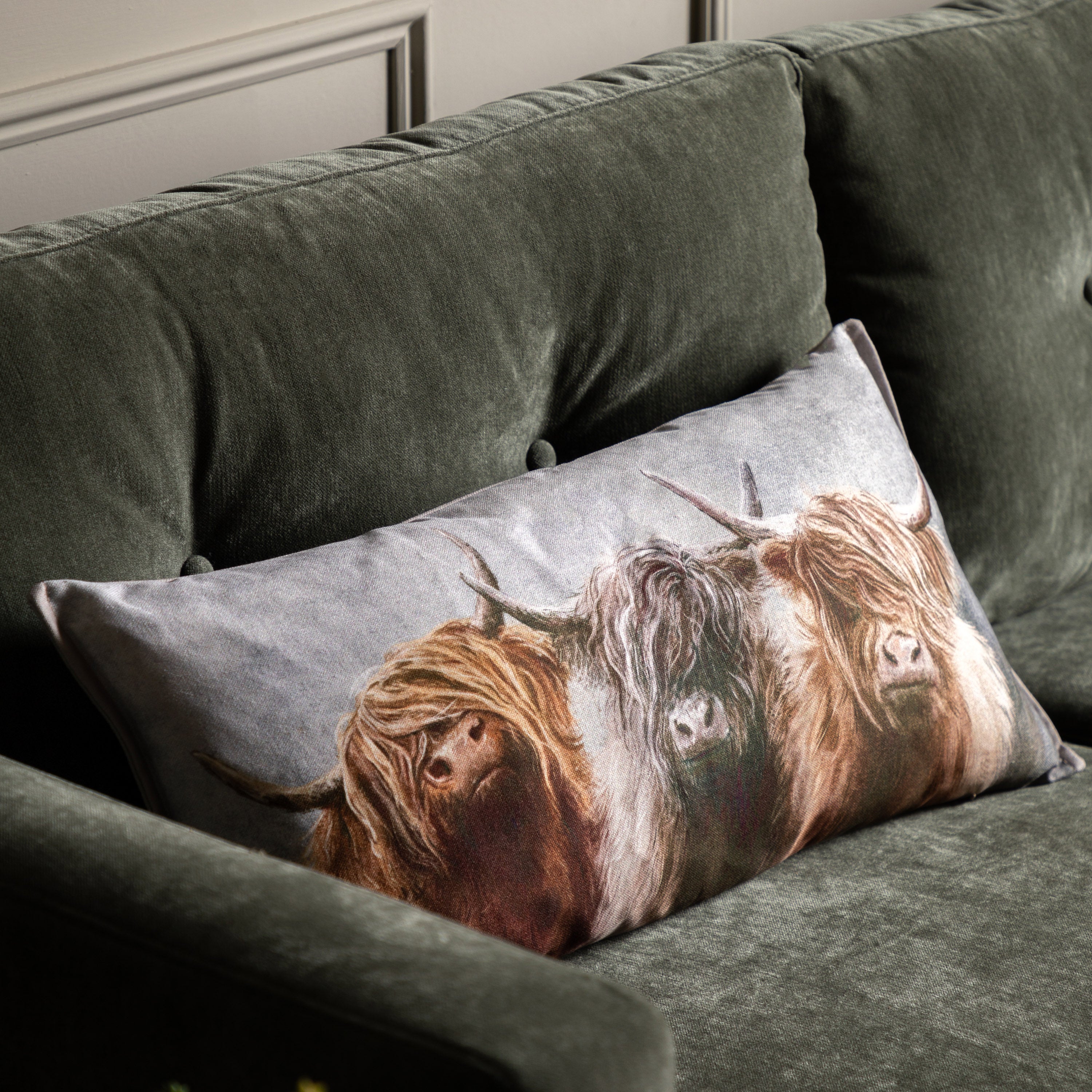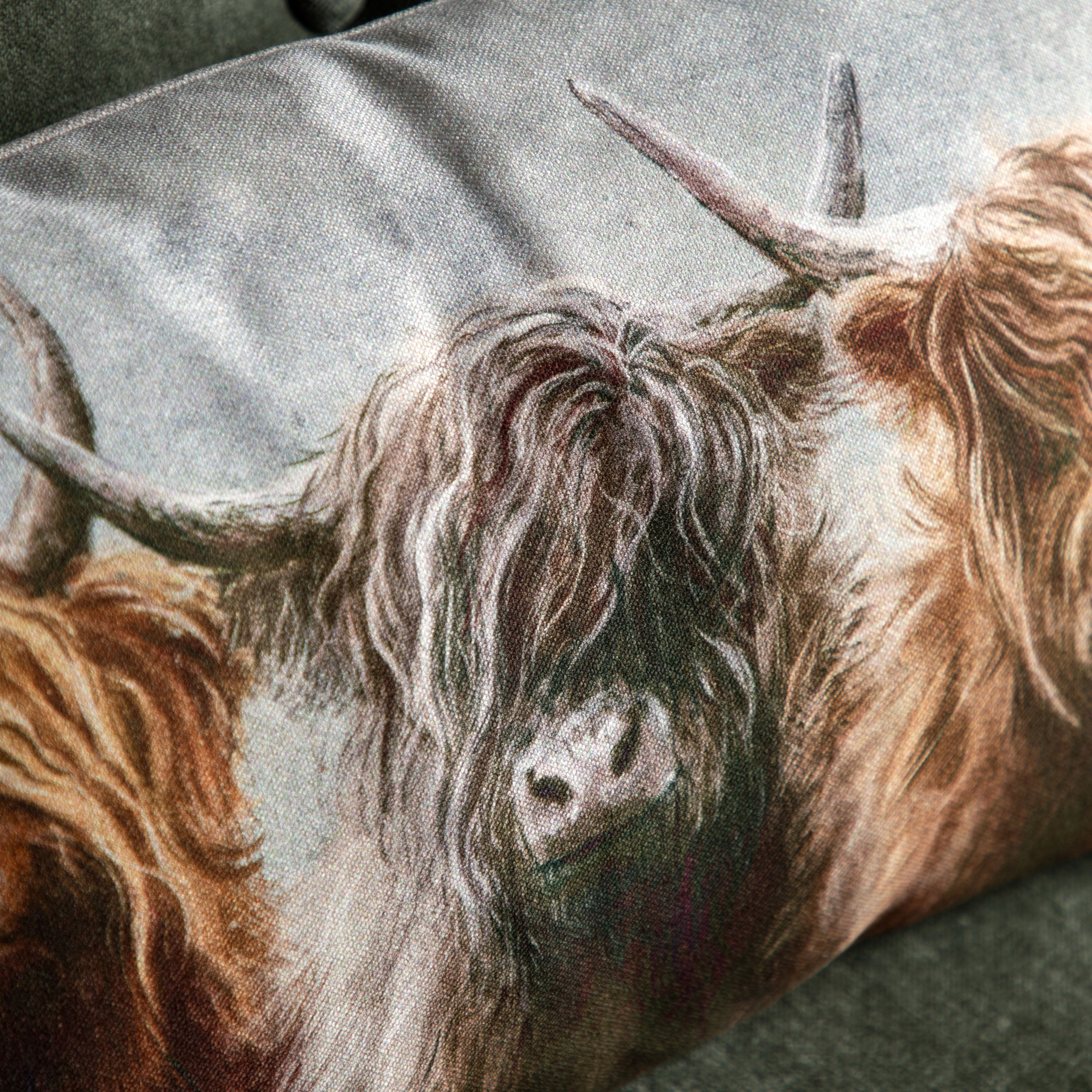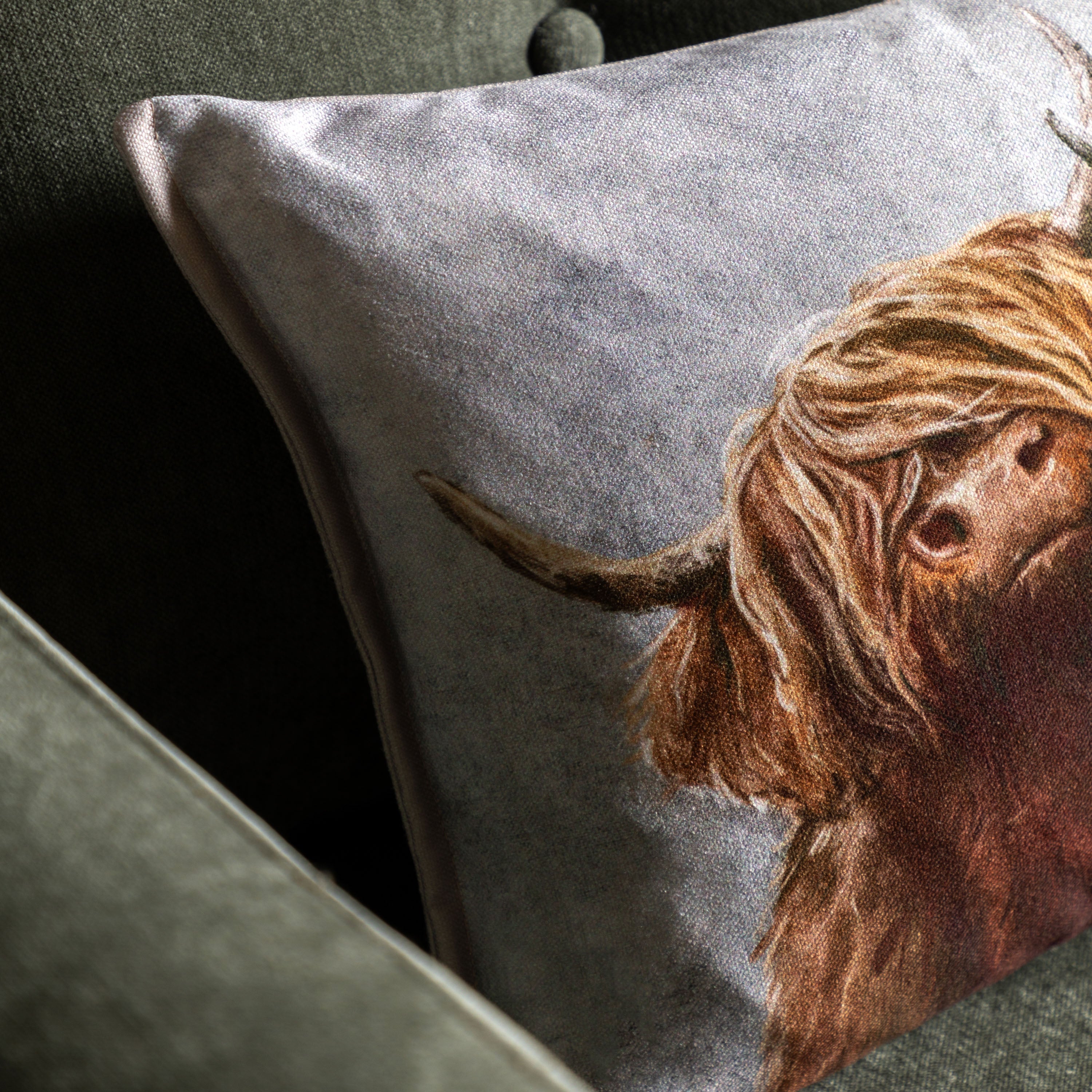 Charming cushion featuring a Highland cow design, ideal for adding warmth and a rustic, countryside feel to any room.
