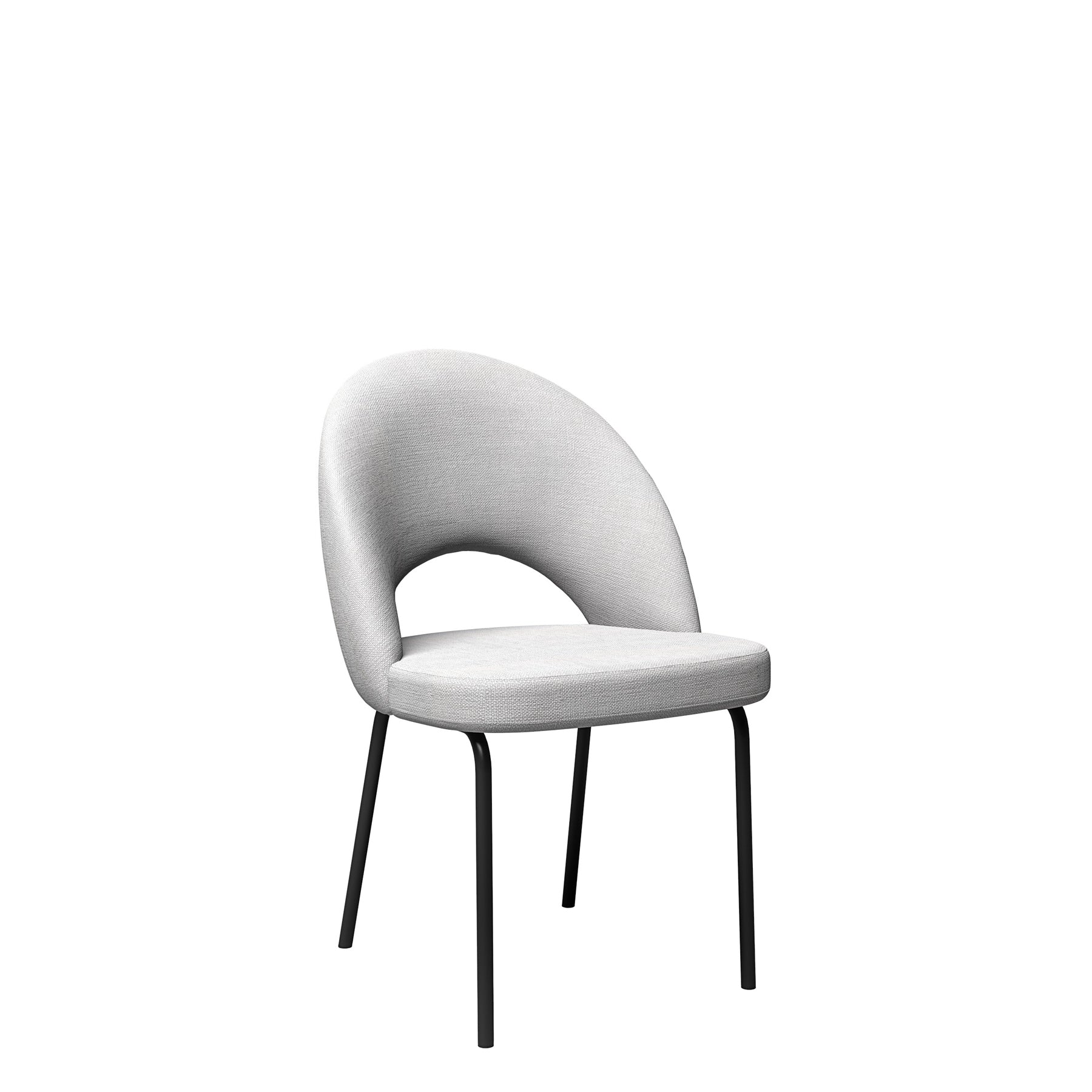 A modern fabric dining chair with a softly curved, cut-out back that hugs the body and saves space. Upholstered in light, textured fabric over a cushioned seat for everyday comfort, it’s finished with slim black metal legs for a clean, contemporary look—perfect around the table.
