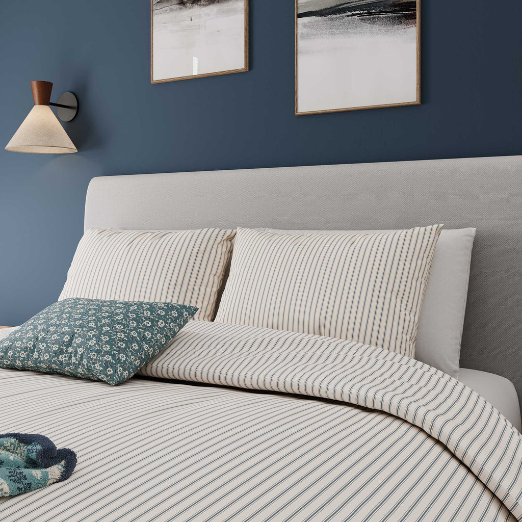 For that pared-back country-inspired aesthetic the ticking stripe design in blue brings understated charm. Enhance the look with the woodland trellis throw and folk ditsy cushion to add extra country-inspired quirkiness. 100% cotton.