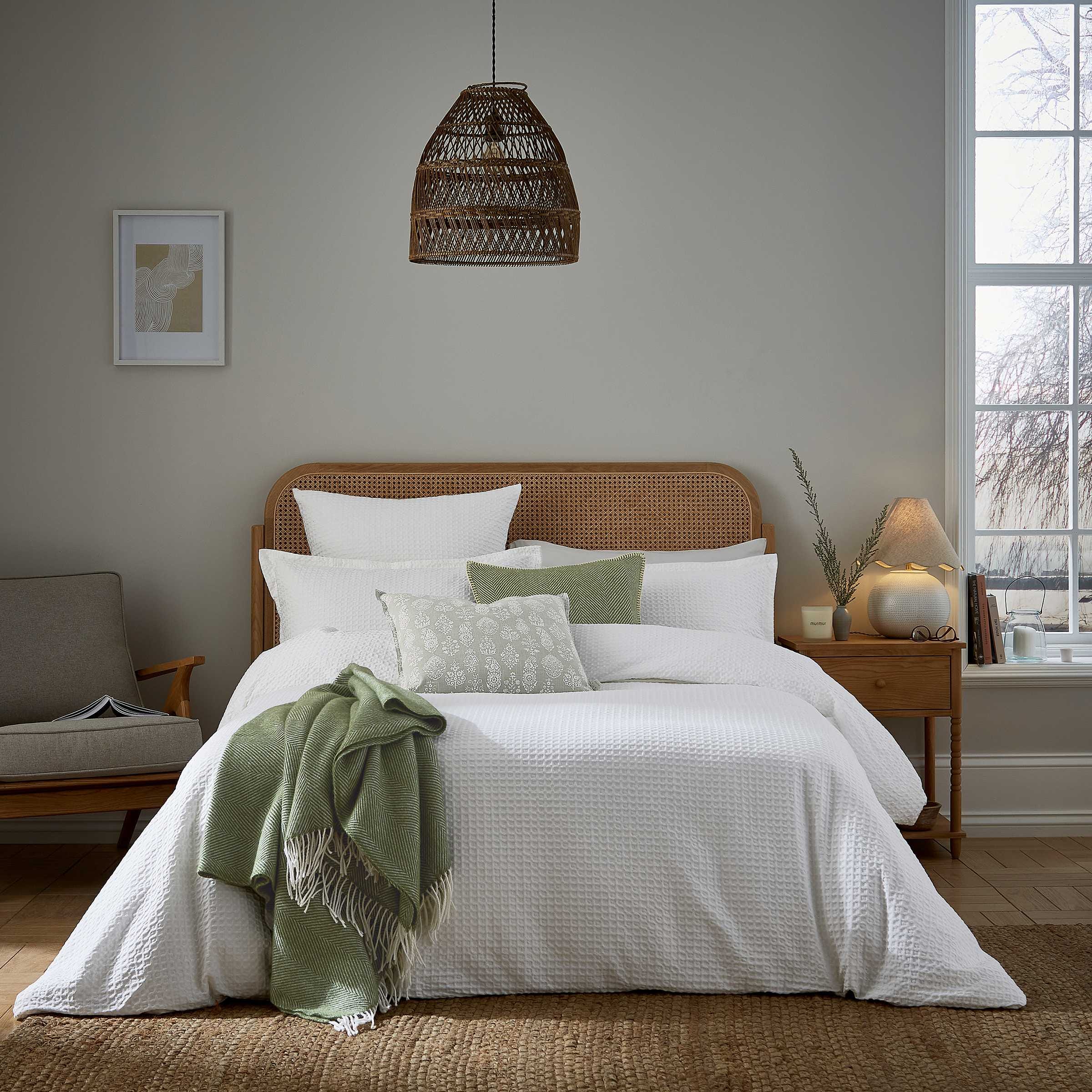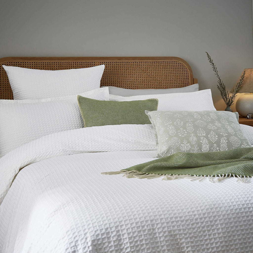 Lida White presents a beautifully soft textured mid-scale waffle design with a relaxed feel. The reverse is perfectly plain all in 100% cotton. Enhance the look with the coordinating square oxford pillowcase for added texture. Perfect for layering up with cosy accessories for a considered layered feel.