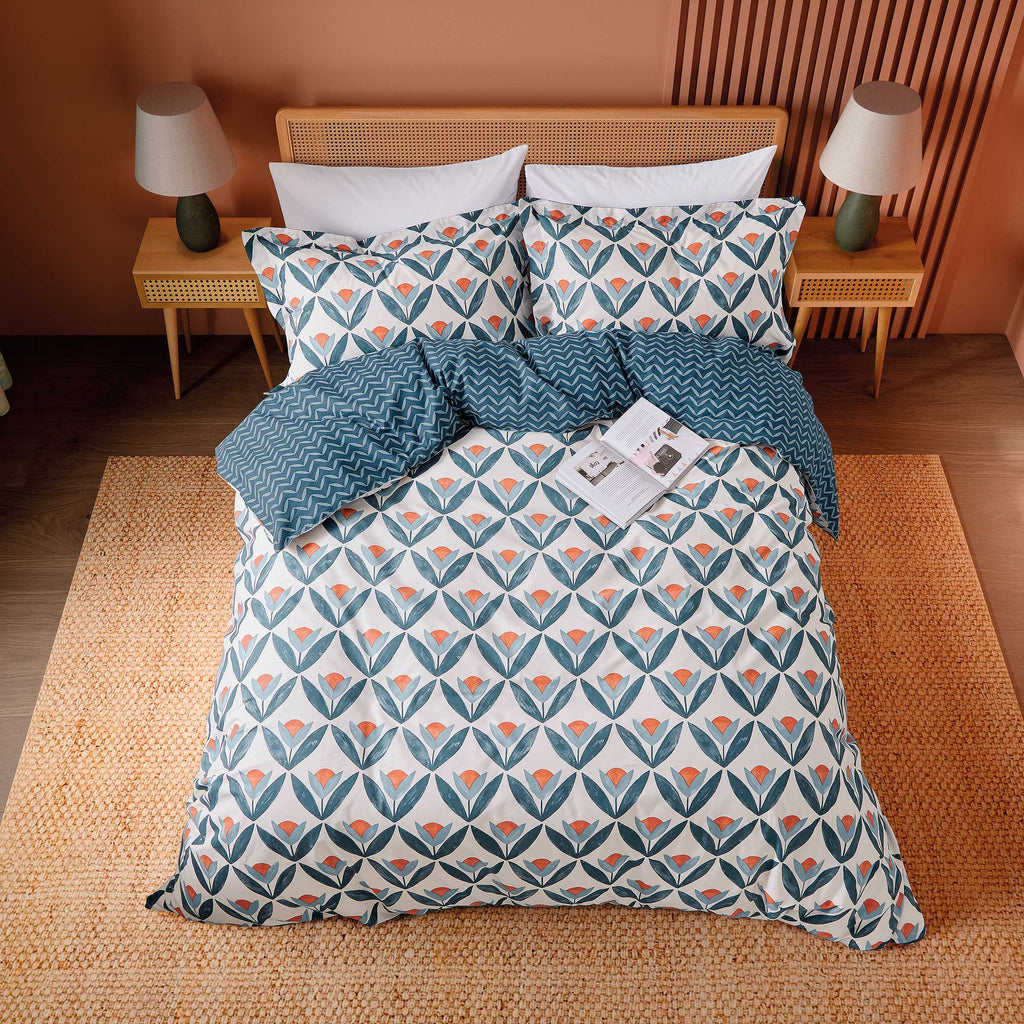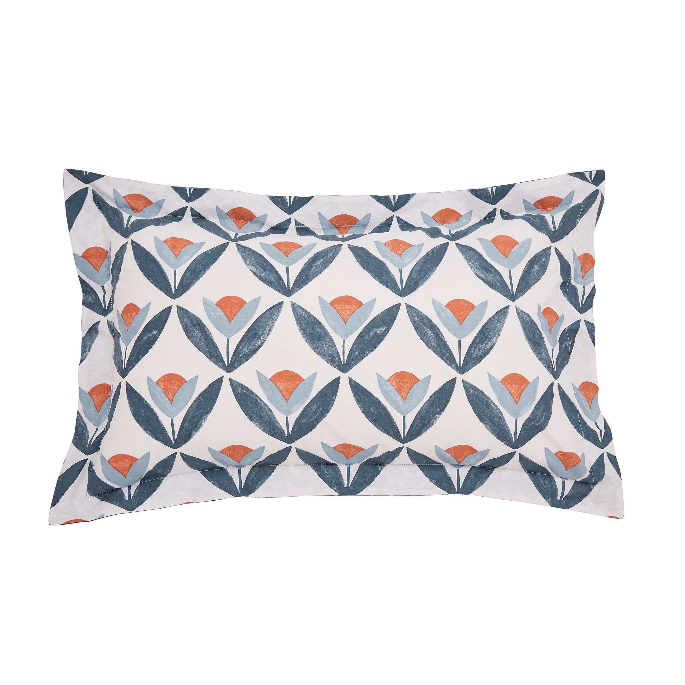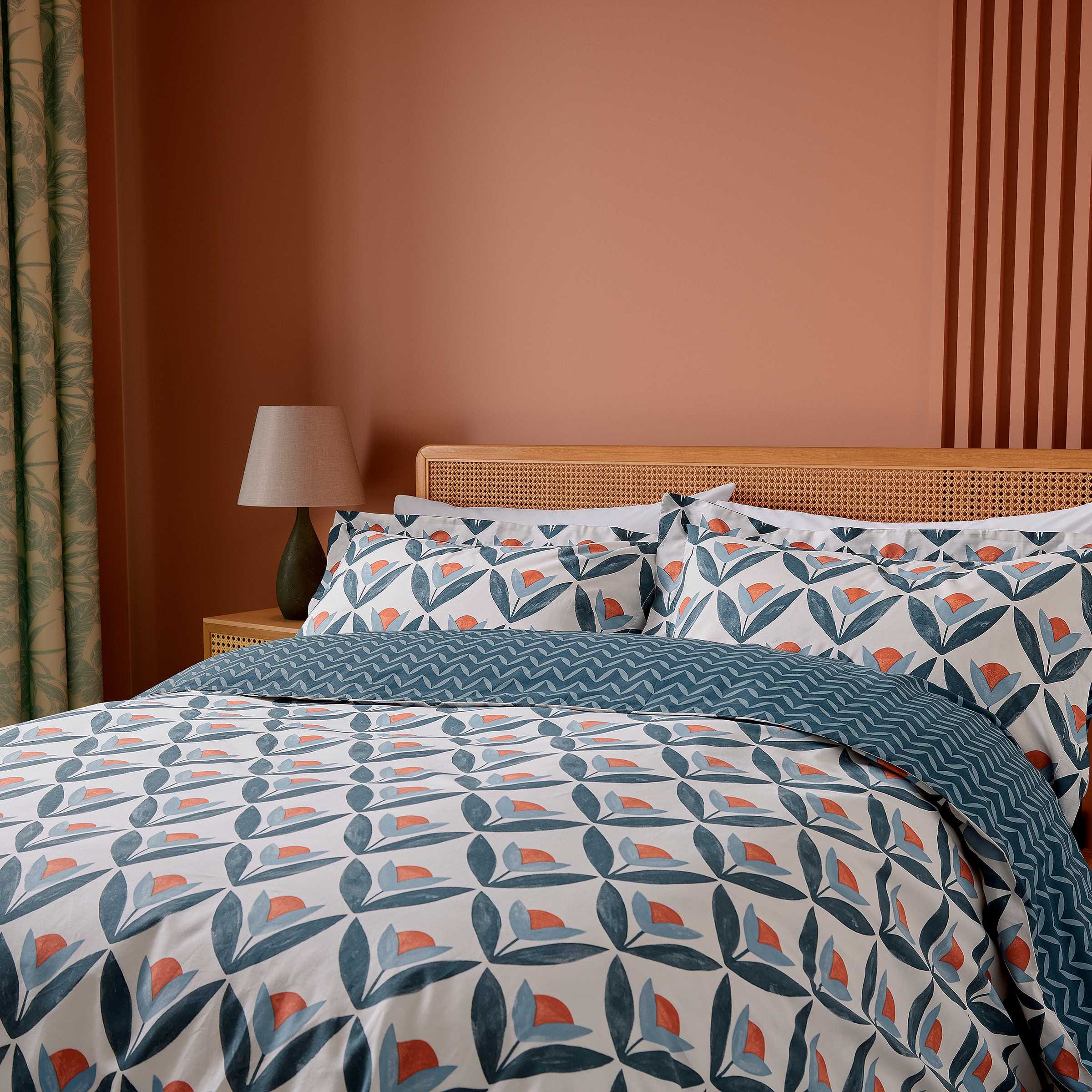 Bold red tulips bloom across stylised stems in this vibrant design. Complete with matching Oxford pillowcase(s), it features a small-scale leaf pattern on the reverse.