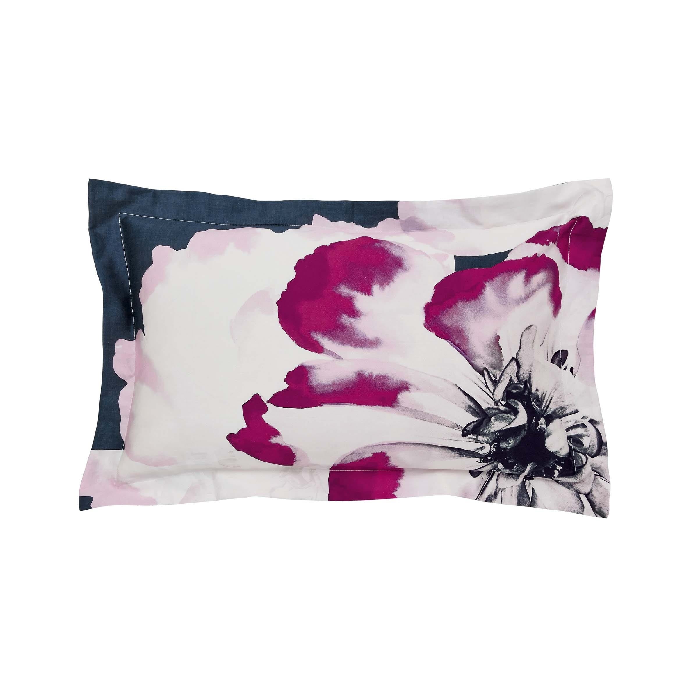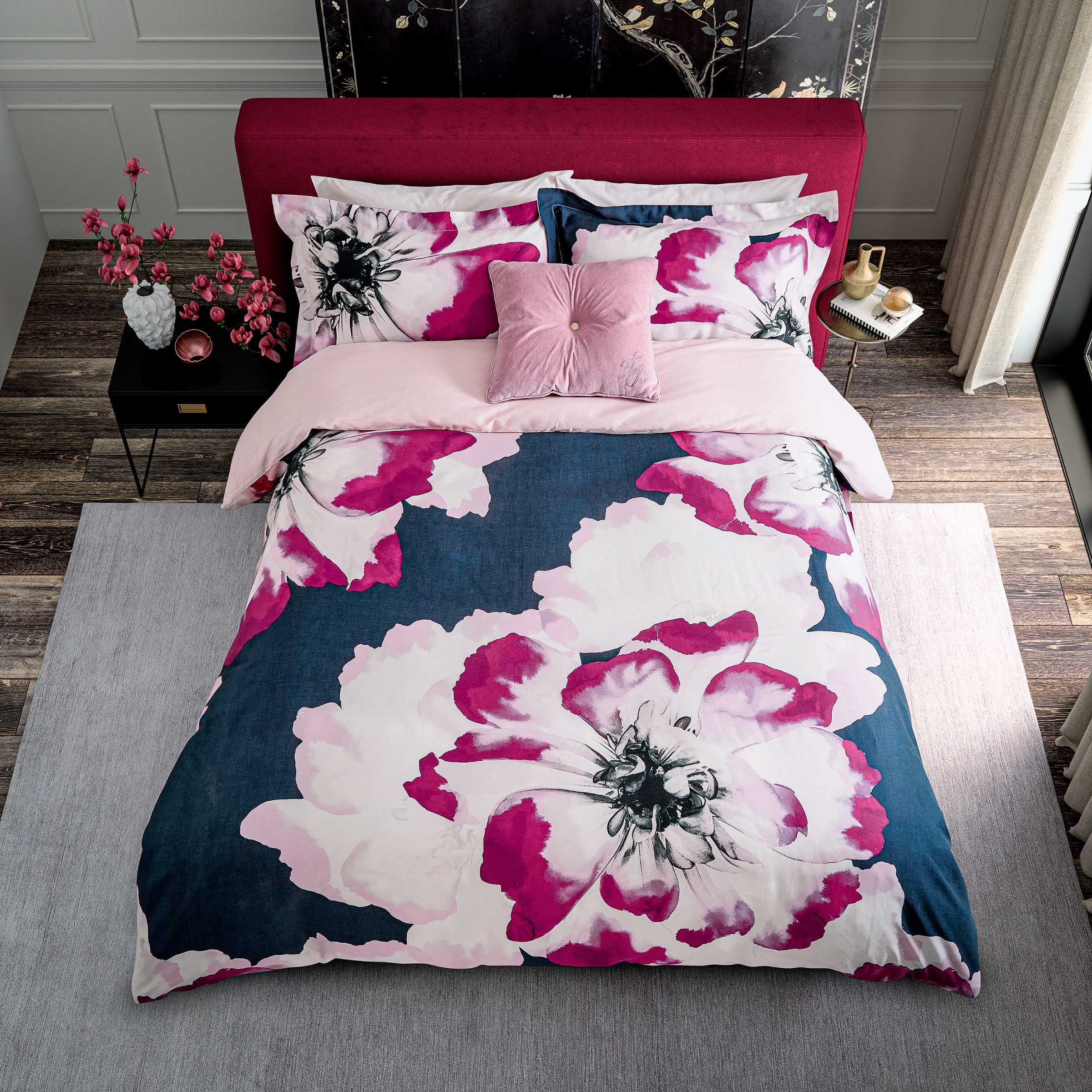 Make a statement in full bloom with the Inky Bloom duvet set. Bold, oversized peonies in lush pink and purple tones burst across a rich navy background, giving your bedroom that “fresh-from-the-garden” feel—with a modern edge. Flip it over for a soft blush pink reverse when you’re after something a little more low-key. Digitally printed on smooth 200 thread count cotton sateen, it’s all about luxe looks and laid-back comfort. Pillowcases pairs included, of course.