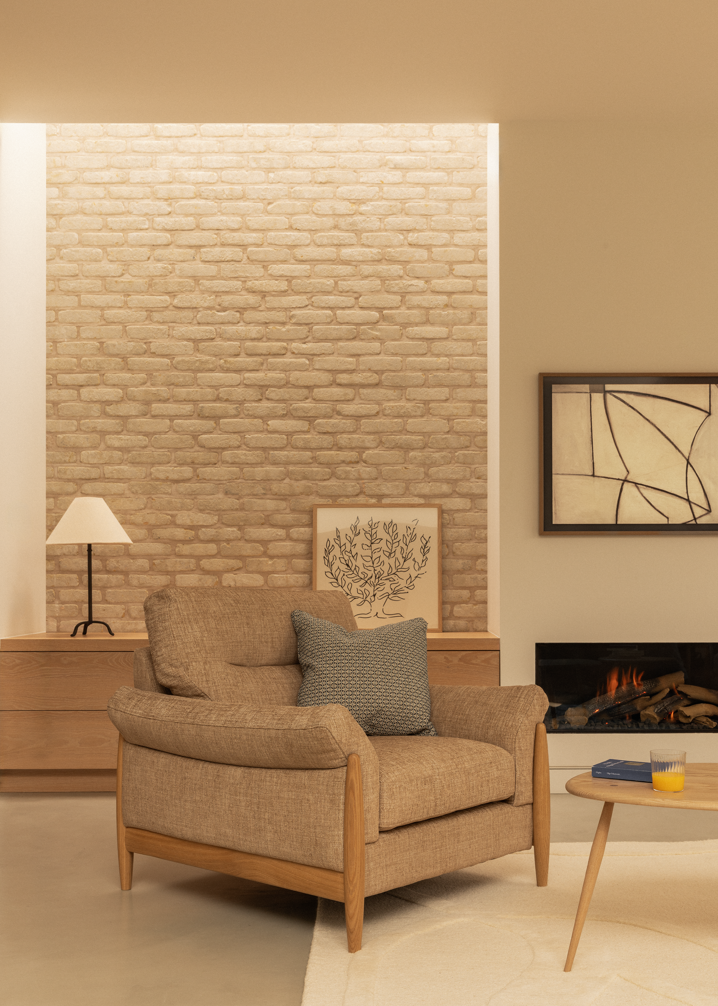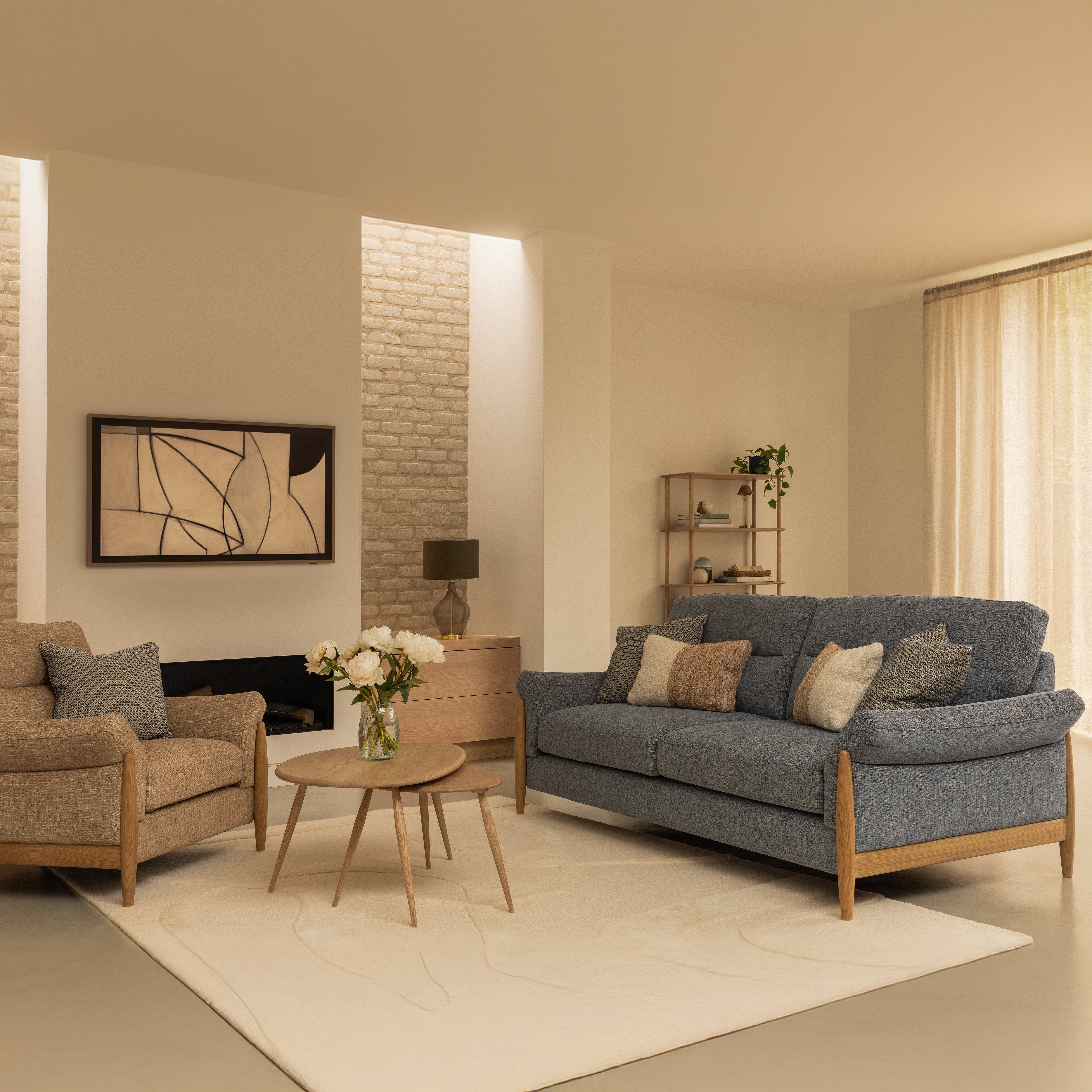 The Clara range includes a chair, snuggler, medium and large sofas, together with a matching footstool. The generous arm bolsters and deep cushioning, complemented by matching scatter cushions, offers wonderful comfort and support. Like all of our furniture, Clara is made to last, with turned legs constructed in solid oak.