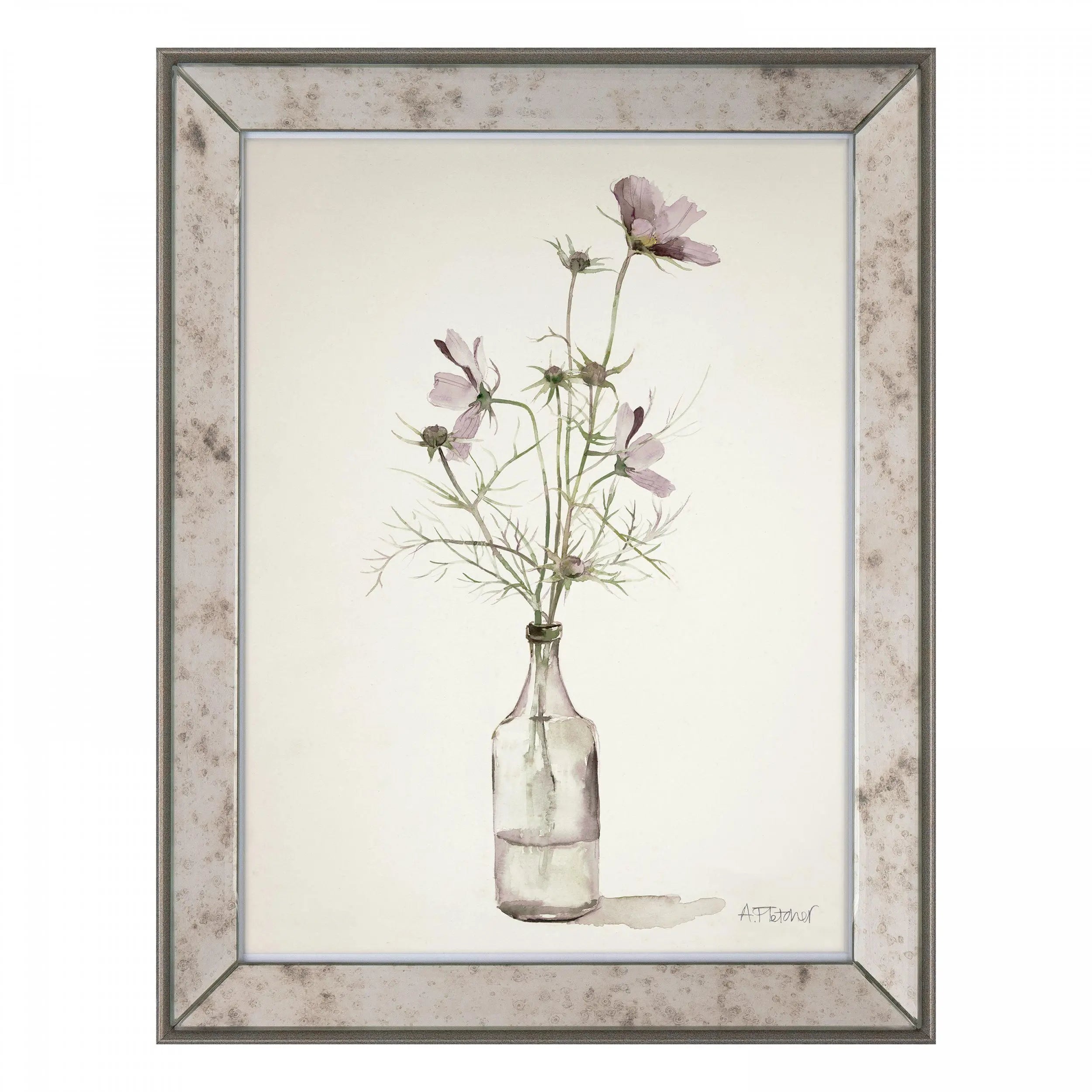 An exquisite watercolour illustration of a wildflower stem loosely arranged in an old glass bottle. Against a soft oatmeal background, Adelene Fletchers delicately illustrates the finer beauty in the spirited flower. The subtle, inviting colour palette adds a charming warmth to the artwork, enhancing its minimalistic composition. The overall rustic aesthetic is complemented with a mottled glass glaze, adding depth and texture to the design. An antique effect mirror frame with a bevelled edge further enhances the vintage grace of the piece.