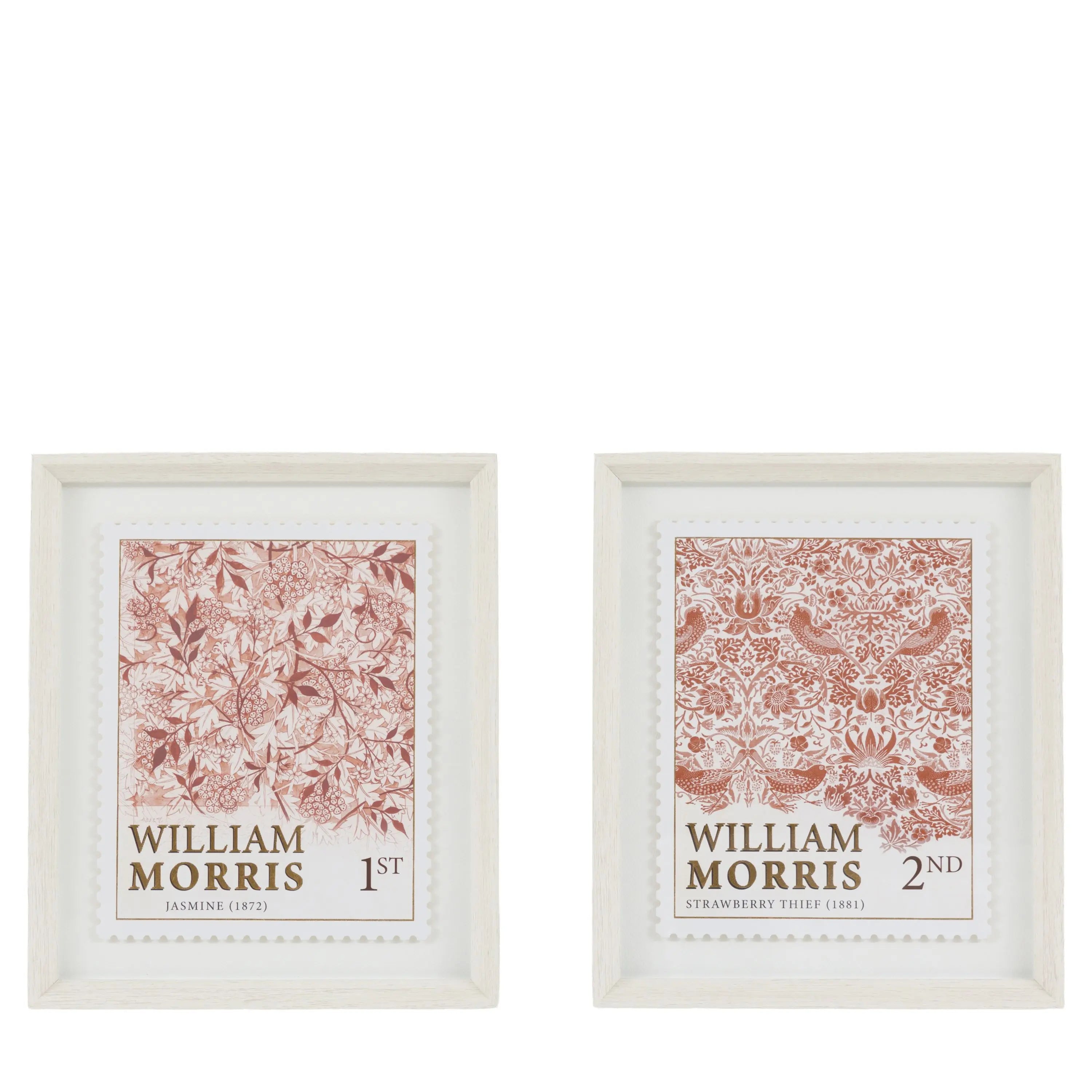 This elegant pair of shadow box artworks celebrates two of William Morris's most beloved designs, Jasmine 1872 & Strawberry Thief 1881, reimagined as exquisite die-cut stamps. Each piece is die cut with perforated edges, raised to create depth and dimension. The typography has been embellished with gold metal leaf for the perfect finishing touch.